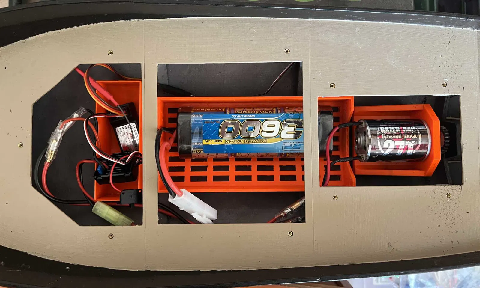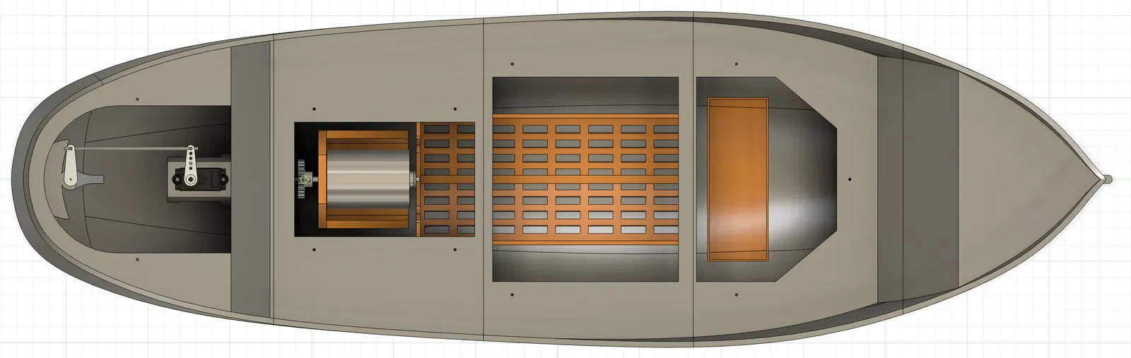 Một chiếc thuyền câu cá điều khiển từ xa (radio-controlled) phù hợp để chạy ngoài trời, ví dụ như trên hồ. Thuyền dài gần 68 cm, rộng 20,5 cm và cao khoảng 28 cm. Một số phần của thuyền được thiết kế để có thể in trên máy in MK3. Vì mình dự tính dùng thuyền vào mùa hè trên hồ nên mình chọn filament PETG để chịu nhiệt tốt hơn. Có hai lựa chọn để lắp DC motor size 130 (Hình 1) hoặc 540 (Hình 4).