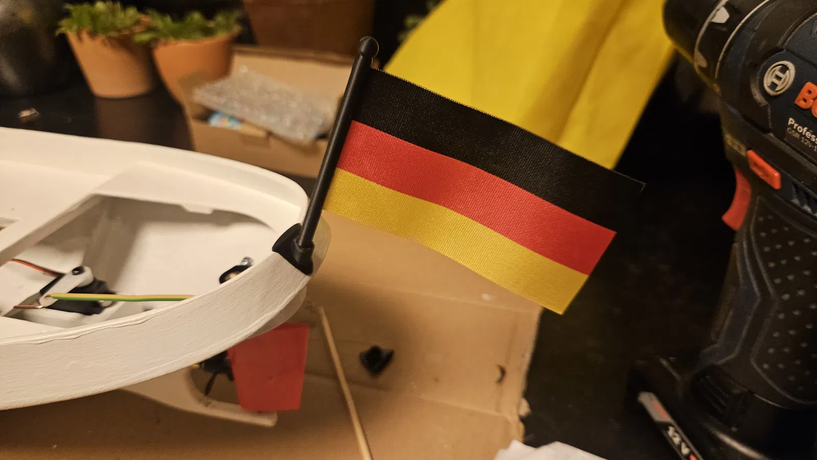 Cột cờ (flagpole) vừa mép thuyền và cần dán keo cố định. Mình dùng Krick 63453 Flagge Deutschland 55x83 mm (Artikel-Nr.: 63453).