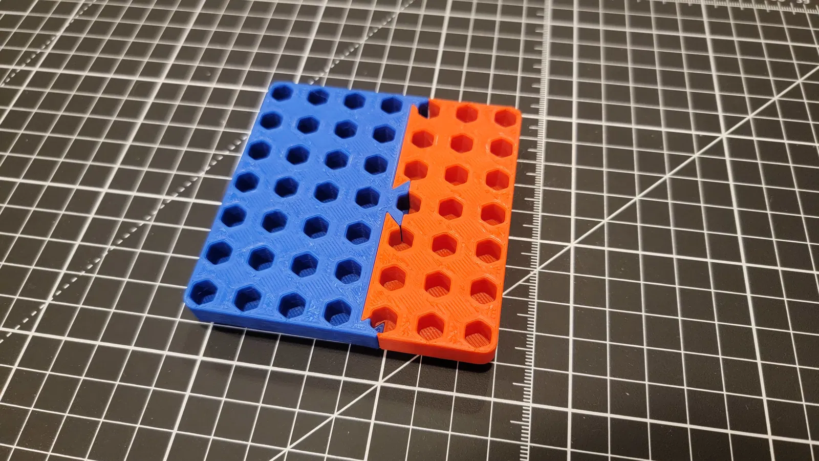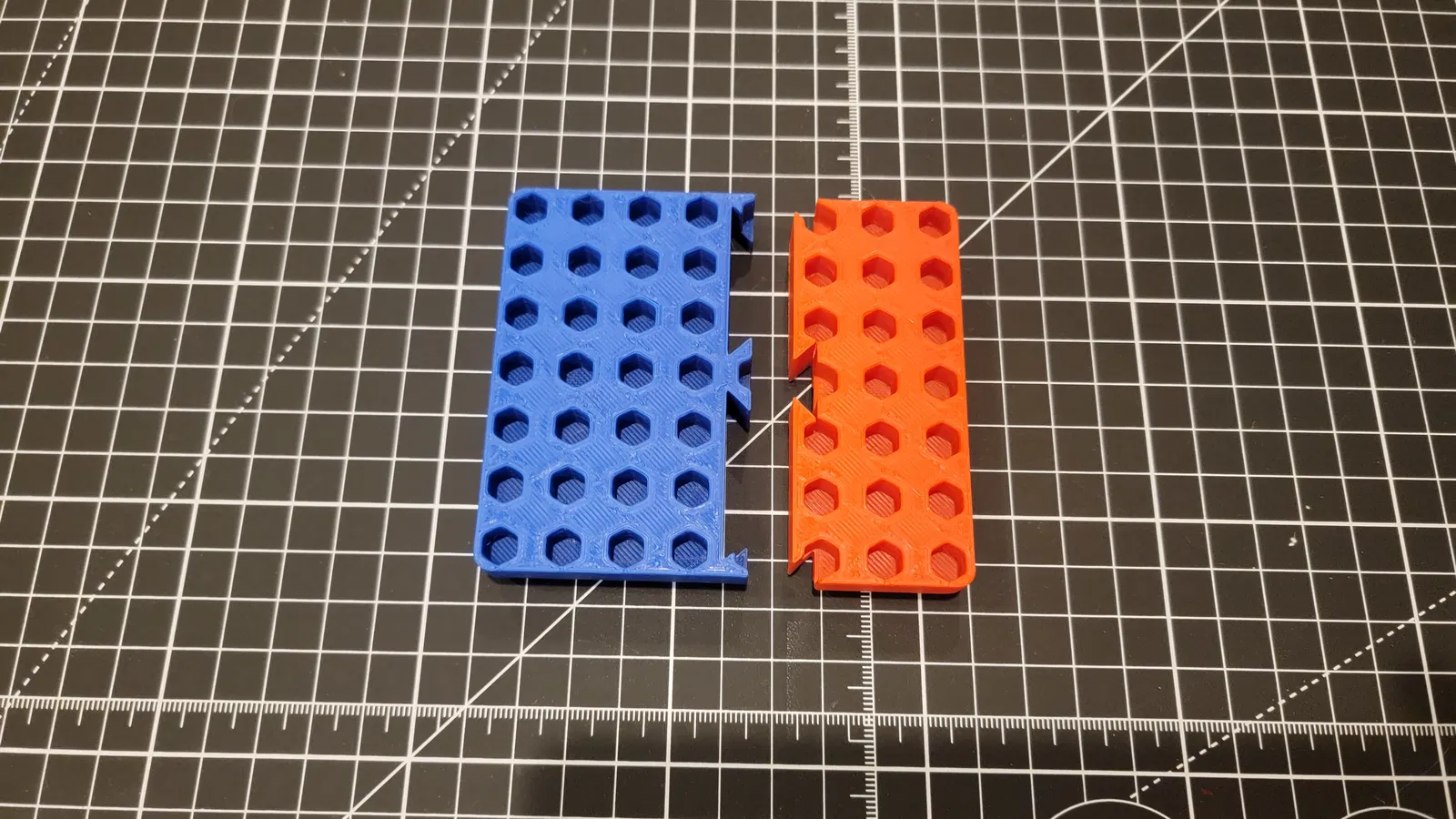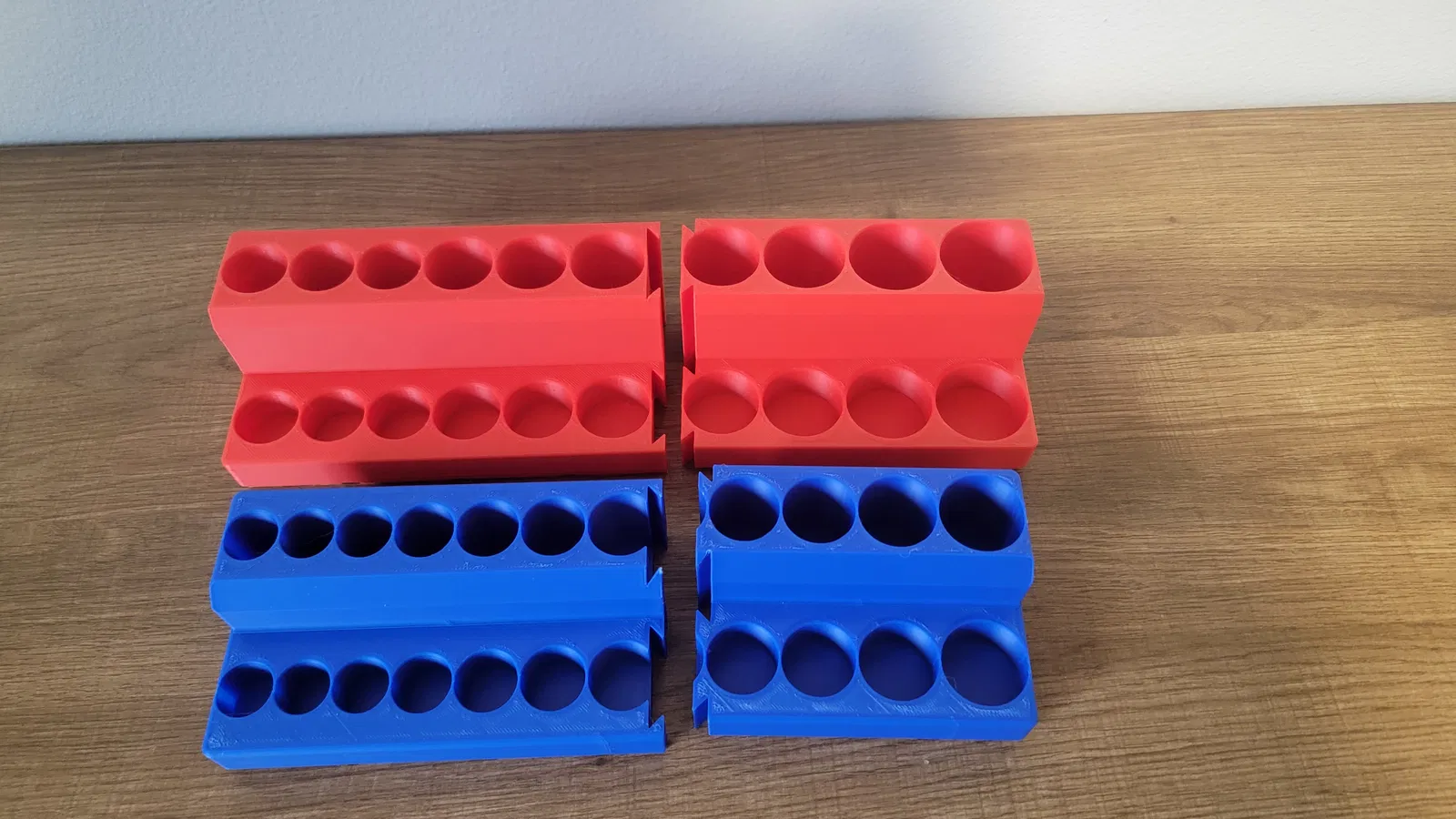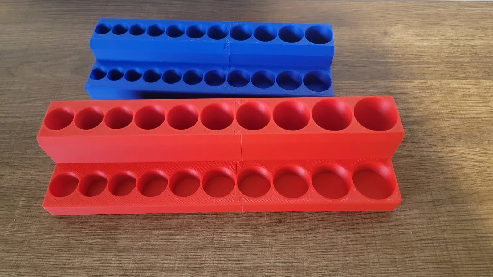 Kích thước lỗ được làm lớn hơn đường kính đầu tuýp DeWalt của mình 1mm. Socket của hãng khác có thể sẽ quá lớn và không vừa. Mình không muốn ai phải tốn cả trăm gram filament in xong rồi mới phát hiện socket không vừa! Mình khuyên rất mạnh là hãy in 6 file test lỗ khác nhau để chắc chắn socket của bạn vừa. In cả 6 file test chỉ tốn khoảng 65g filament. Hai mẫu test lỗ cho 3/8" và ½" cần xoay 45 độ để vừa bàn in 220mm x 220mm.