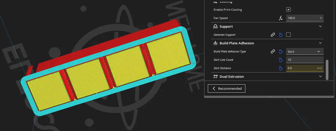Mình bị tình trạng góc bị cong vênh (warping), nên mình dùng skirt 10 lines và distance 0.0mm. Mình chọn cách này thay vì brim vì nó giúp khỏi bị dính brim giữa các đường lưới (grid lines). Nếu bạn lo warping hoặc đang gặp vấn đề tương tự, bạn có thể thử cách này. Mình có kèm ảnh chụp màn hình phần cài đặt skirt để tham khảo.
