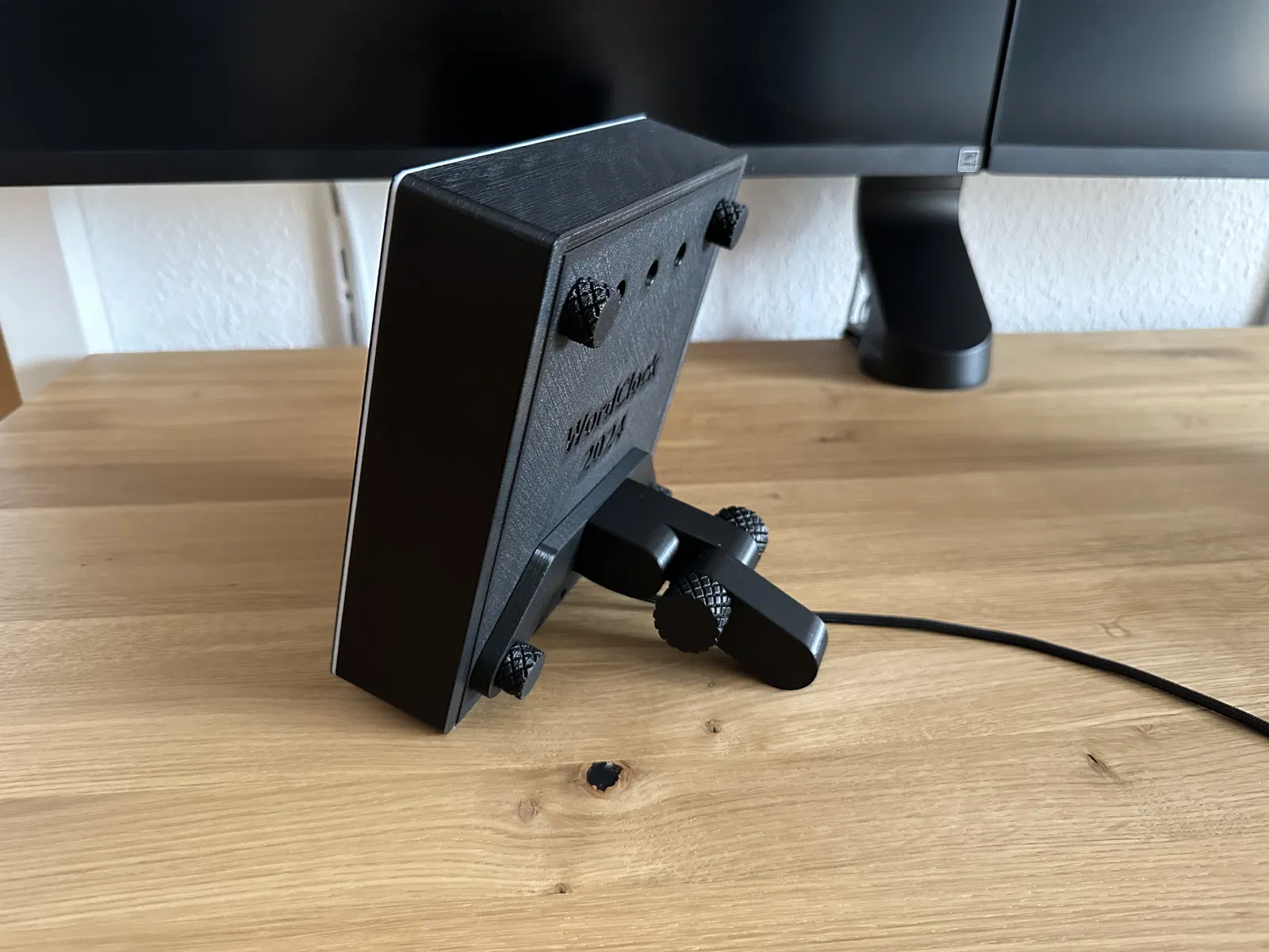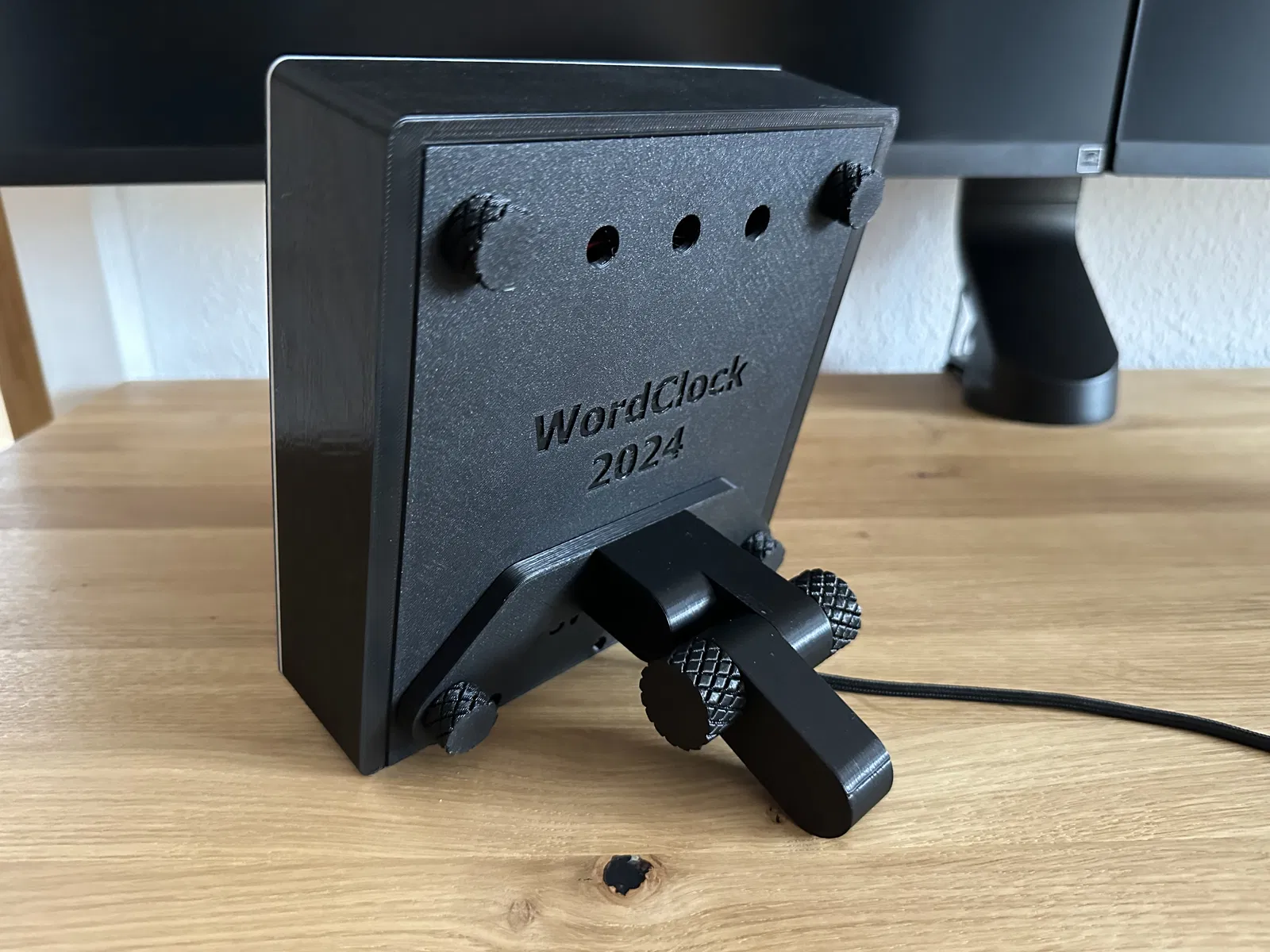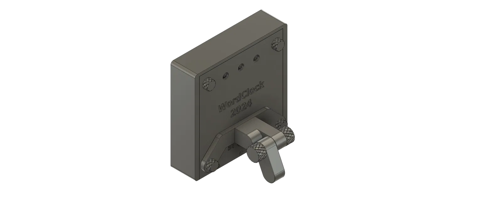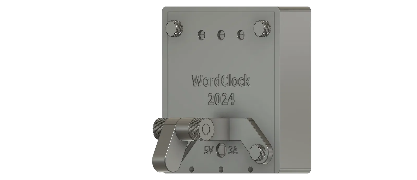 Giá đỡ/stand để bàn cho WordClock 2024/2025 bản 16x8 và 16x16, giúp đồng hồ ngả ra sau và chống lật khi để phẳng. Có ốc in lớn để chỉnh góc; lắp bằng 2 ốc nắp dưới. In không cần support.