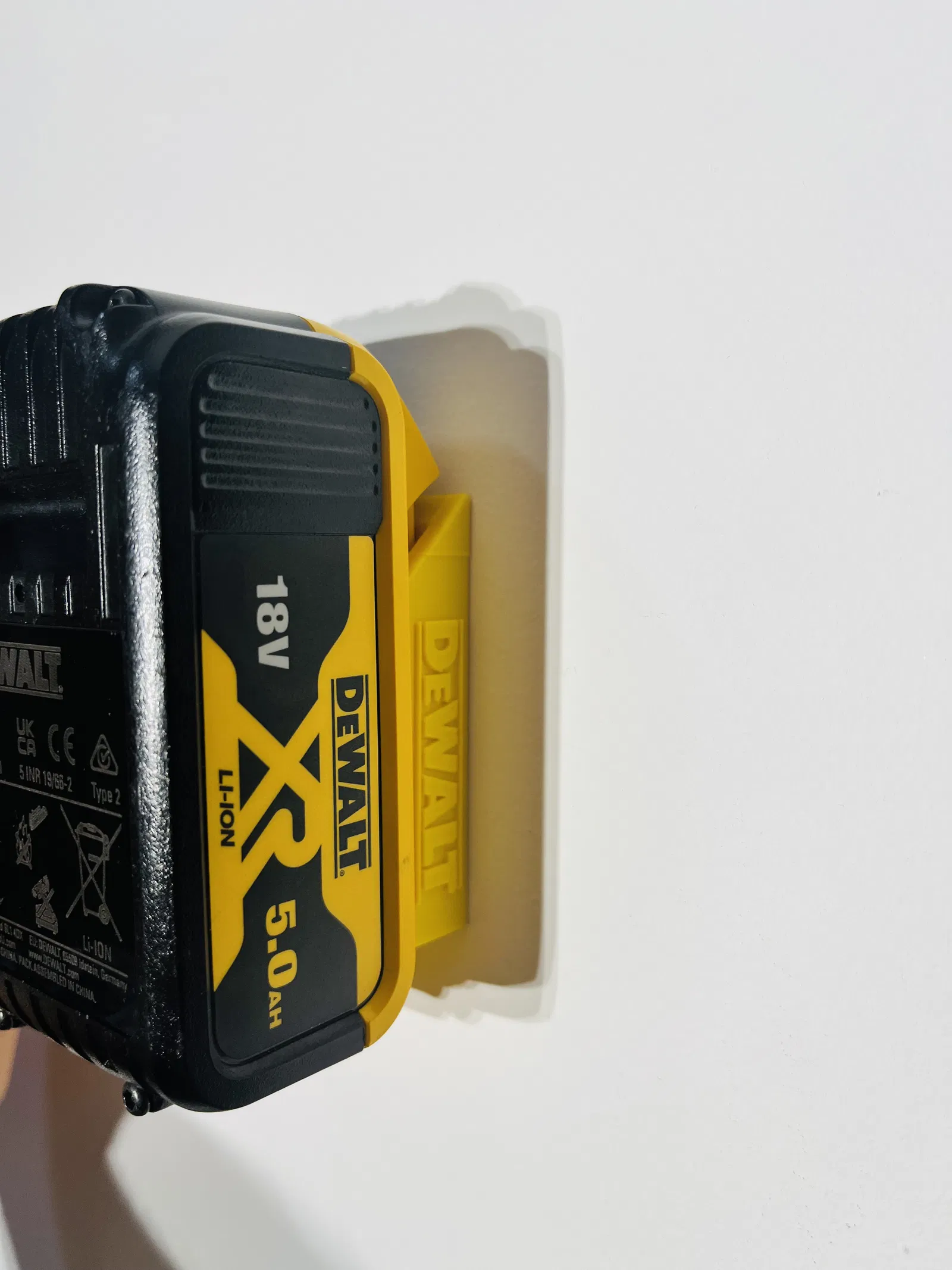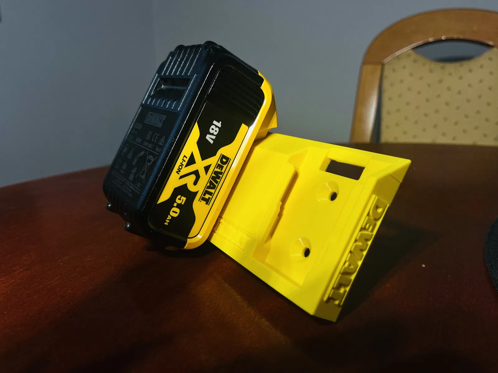 Ngàm treo tường cứng cáp và chắc chắn cho 2 pin DeWalt 18V. So với mẫu gốc, ở đây chỉ thêm các phần mang tính thẩm mỹ, cụ thể là chữ DeWalt ở hai bên.