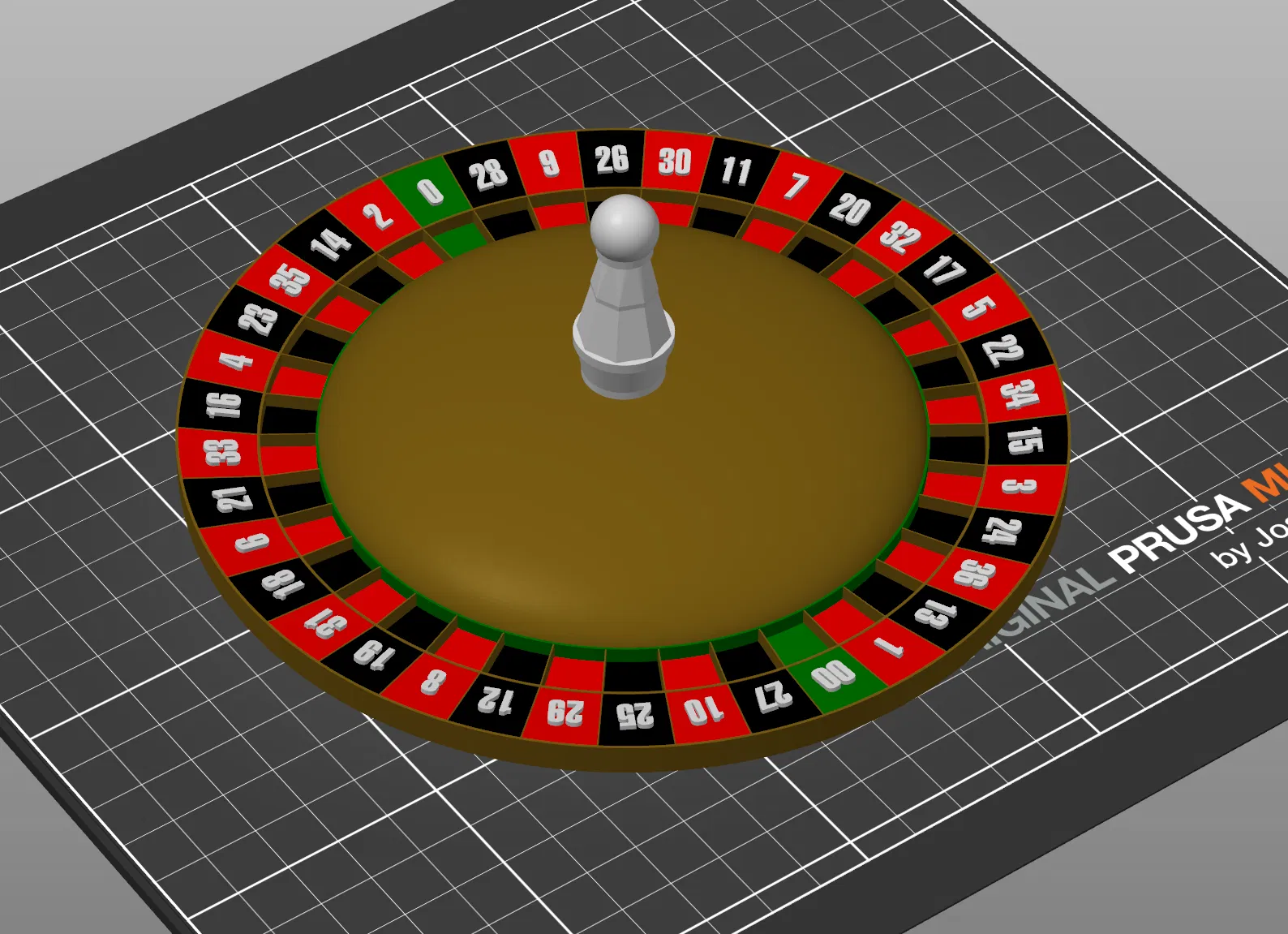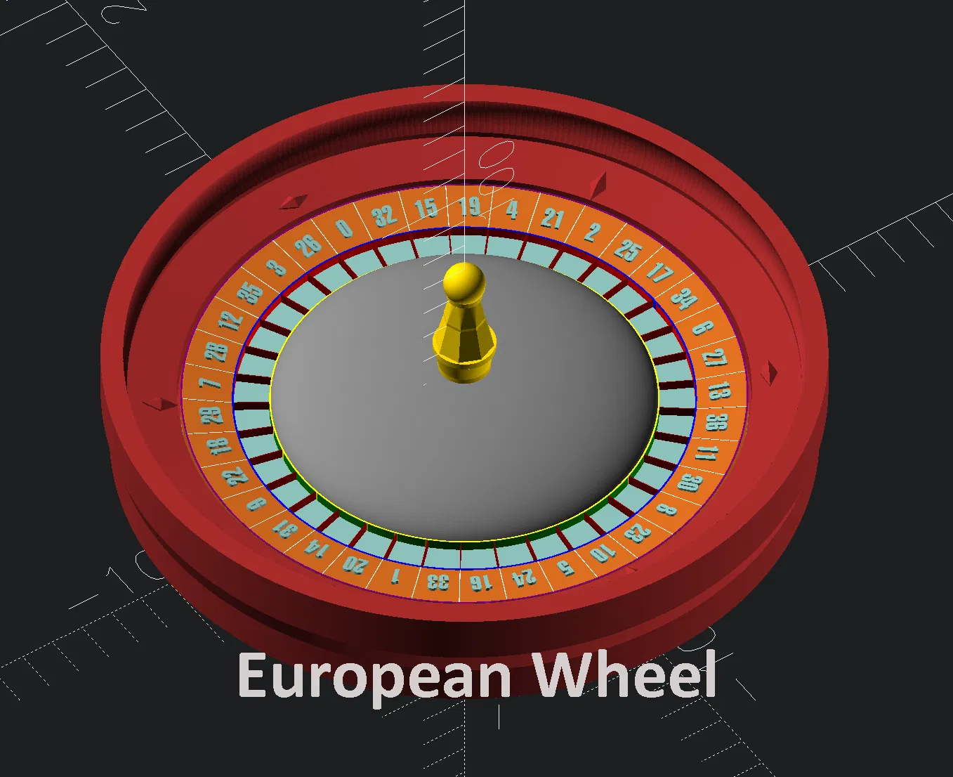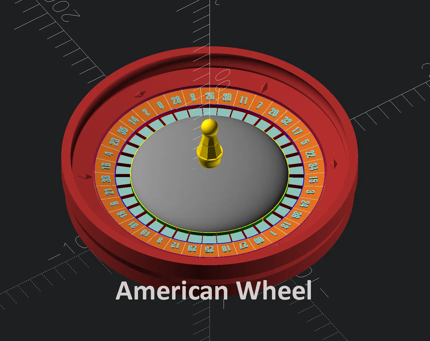 Bánh roulette European có 37 ô, còn bánh American có thêm ô ‘00’ nên tổng cộng 38 ô. Để đổi loại bánh trong file OpenSCAD, đổi model="American" thành model="European".