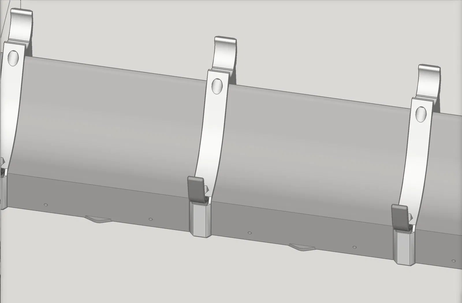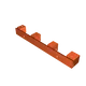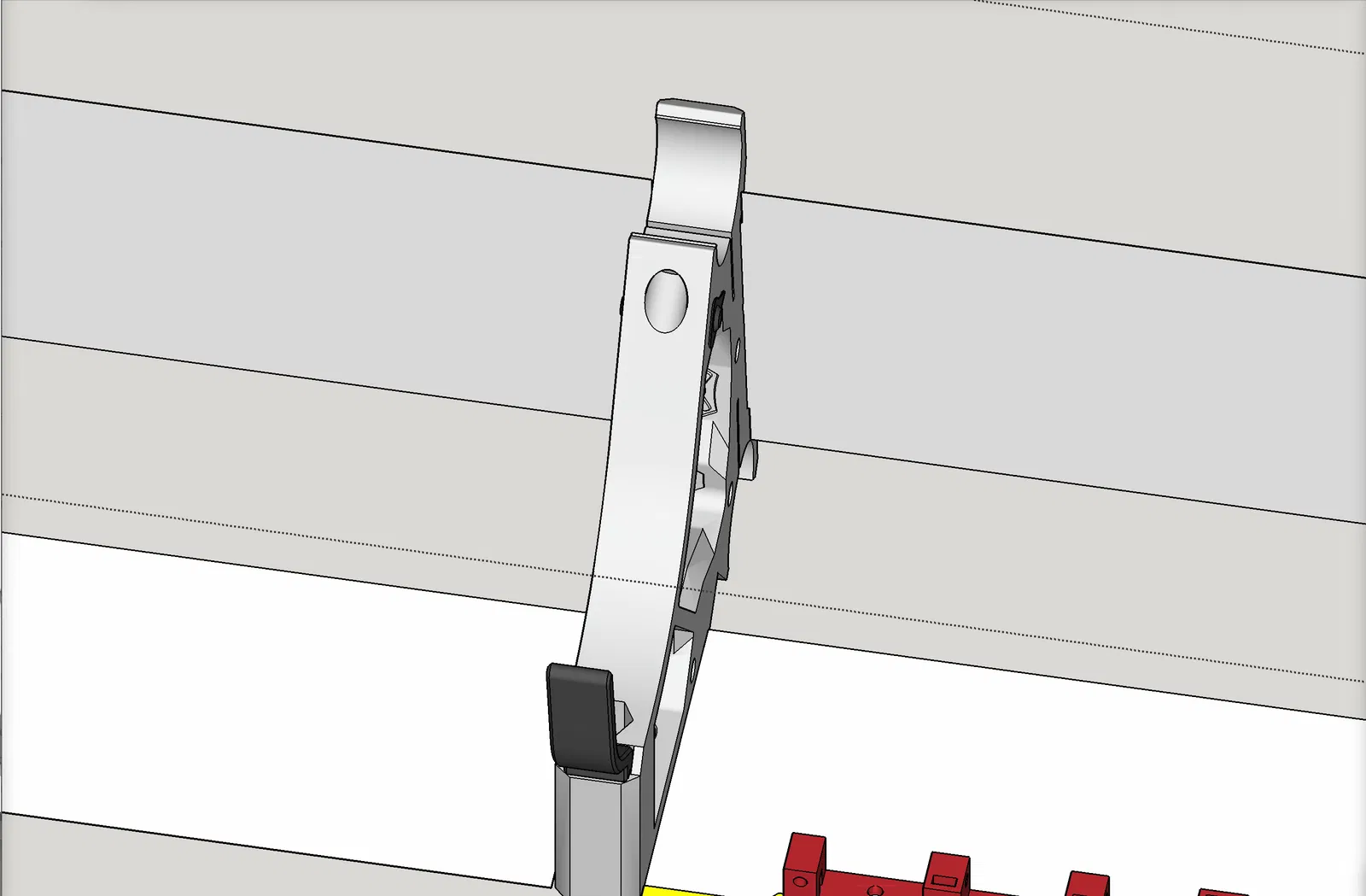 - “Tie downs for wires and back covers (with latches).stl” — Đây là các “tie downs” mình nói ở trên — In 1 cái cho mỗi khe giữa hai brace. Trong ảnh bên dưới, nó được đánh dấu màu ĐỎ. Phần này có một overhang ở mép ngoài phía sau, để móc vào cái lip trên hinged back cover, nhằm gài (latch) nắp lại. Trong trường hợp có dây hay thứ gì đó đẩy nắp lên, tie down còn có 2 lỗ M3, và back cover có lỗ tương ứng, nên bạn có thể dùng vít M3 để đảm bảo nắp giữ đúng vị trí. LƯU Ý: để ý phần trăm scale bạn dùng trong slicer khi in back cover, và áp dụng cùng phần trăm đó cho part này theo chiều dài của nó. Lỗ vít có thể bị lệch chút nhưng vẫn ổn.