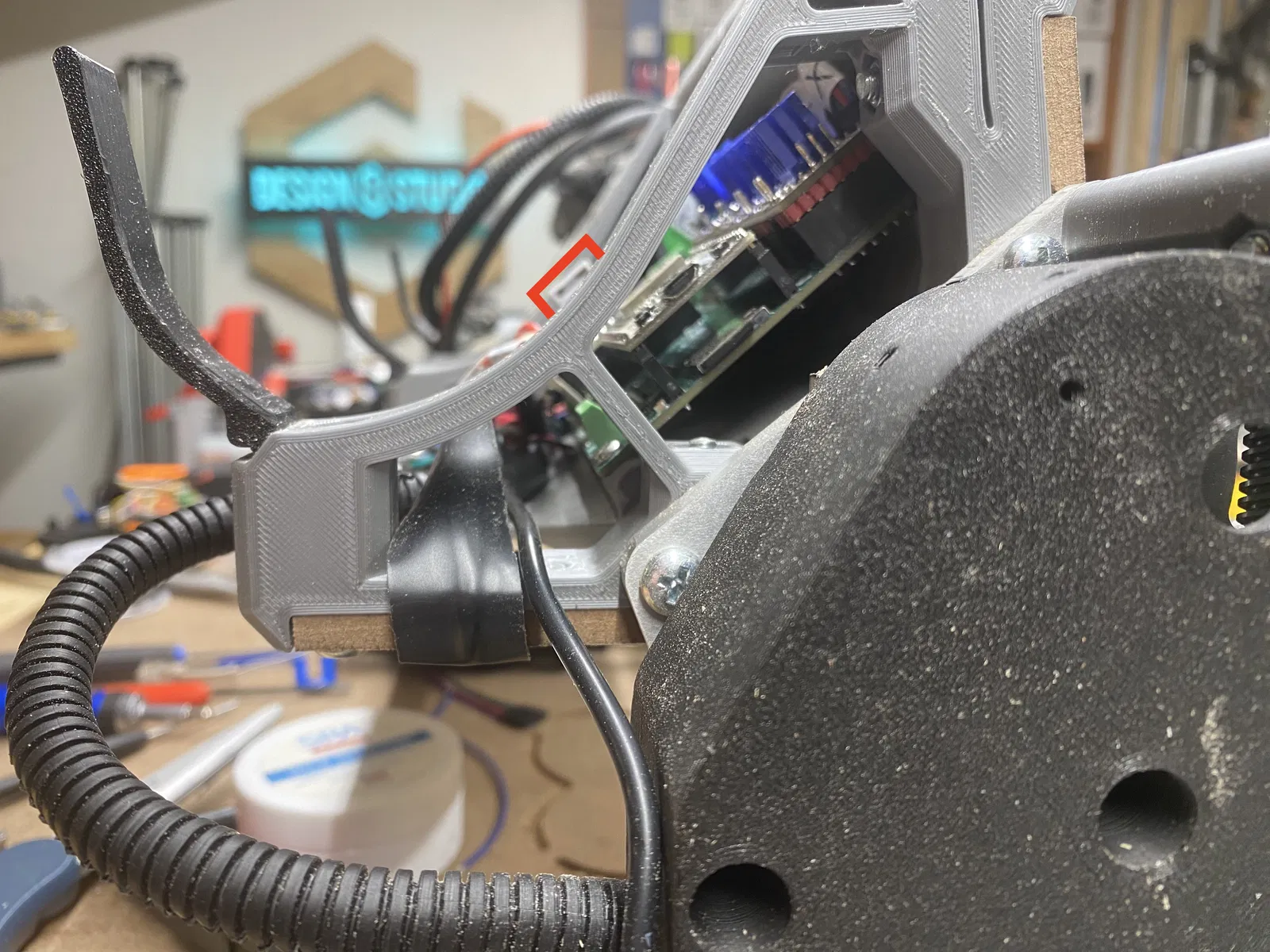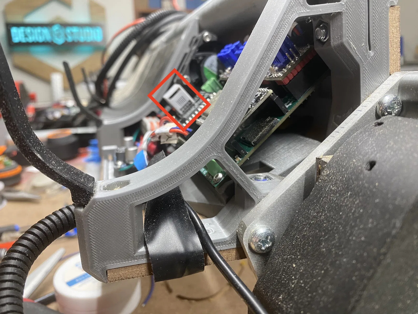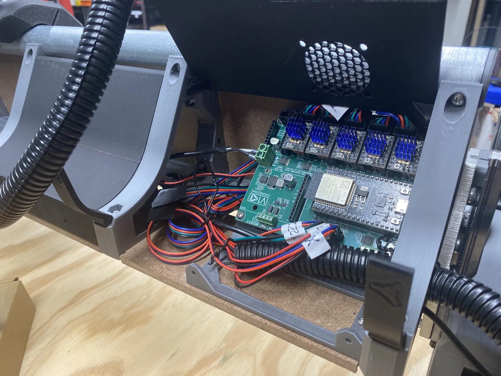 - Mình vẫn đang dùng mount này trên LR4 RC3 từ giai đoạn beta testing. Bản build đó có kèm PCB FluidDial starter kit của Bart Dring. Dưới đây là vài tấm hình mình tìm lại từ giai đoạn beta. Ở một vài tấm mình có highlight cái “connector tower” của starter kit. Mình nghĩ lúc đó mình phải remix board mount để hạ board xuống thấp hơn để chừa chỗ cho starter kit.
