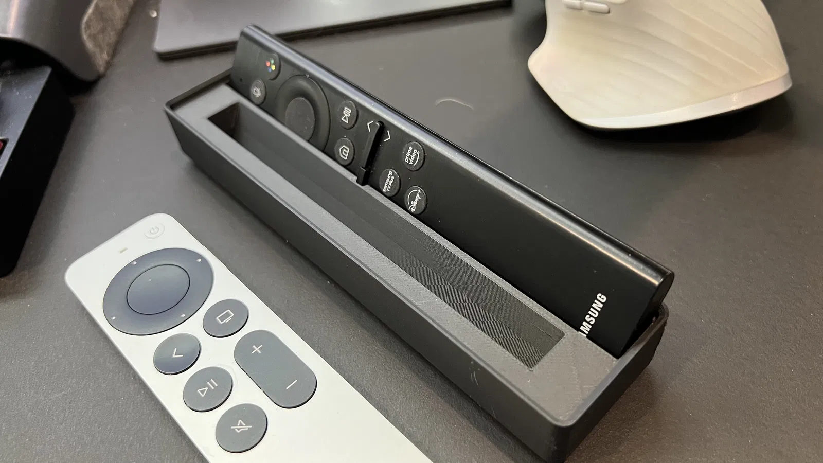 Khay Gridfinity 4x1 để cất remote AppleTV và remote TV Samsung. Ngoài ra còn có các phiên bản thay thế cho bin chiều cao tiêu chuẩn, và một phiên bản chỉ dành riêng cho remote AppleTV.