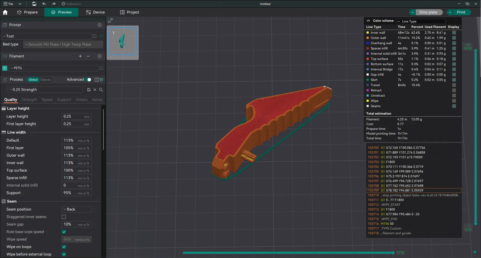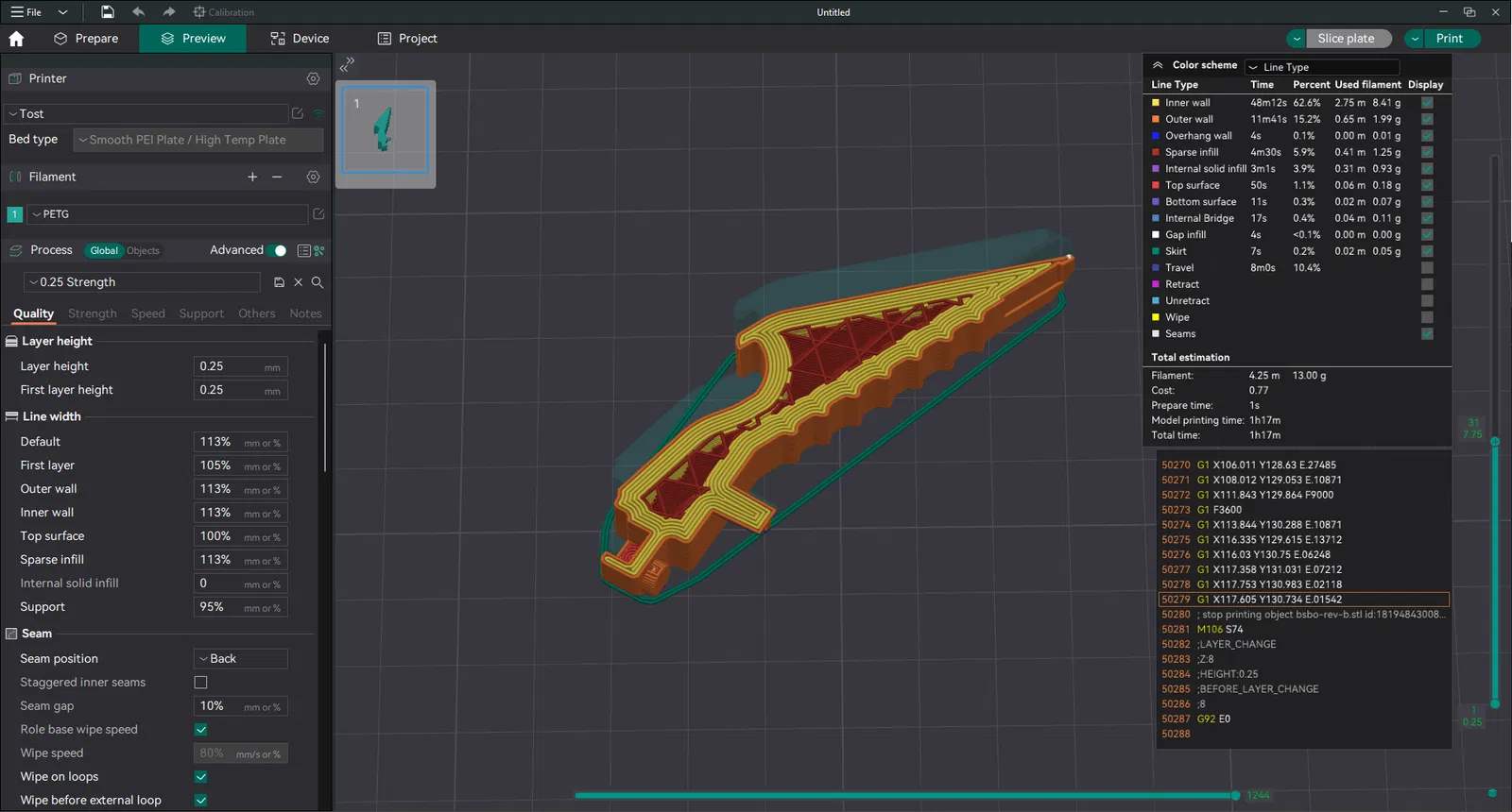 In bằng PETG, đầu phun 0.5 mm, chiều cao lớp 0.25 mm, 8 lớp top và bottom, 6 wall loops.