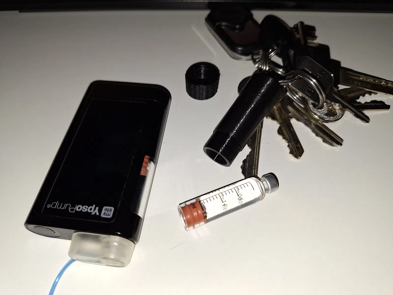 Và thêm một hộp đựng dạng ống cho “key” (chìa) lấy cảm hứng từ thiết kế của bạn David Fish trong nhóm Facebook YpsoPump https://www.facebook.com/groups/3214500962154148 — đây là phiên bản đã chỉnh sửa để chịu va đập/đi lại mạnh tay hơn.