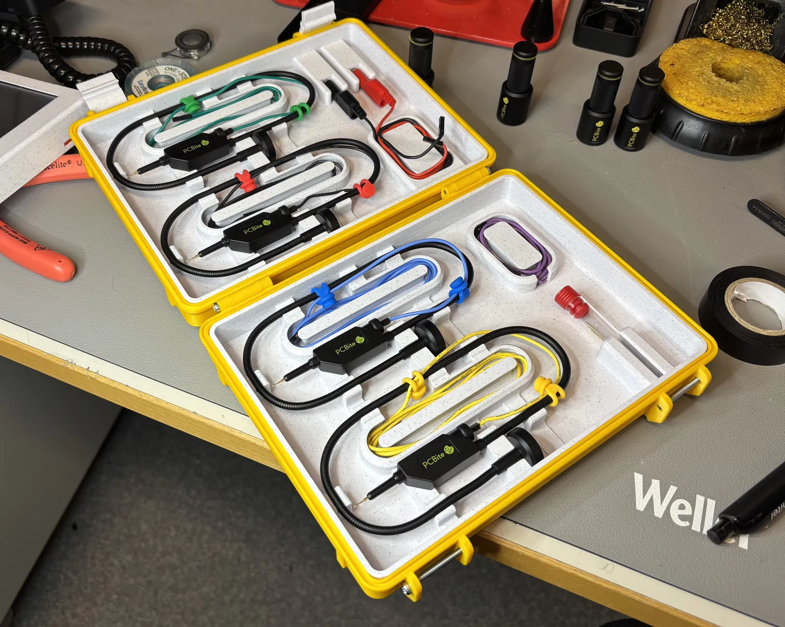 Hộp “PCBite Rugged box” dạng rugged đã cấu hình sẵn để vừa bộ PCBite SQx probe inserts. Chỉ cần slice và in theo màu mong muốn. Cần 6 ốc M3x30mm (2 cho bản lề, 4 cho khóa); nhớ calibrate tolerance để lắp khít không cần keo.