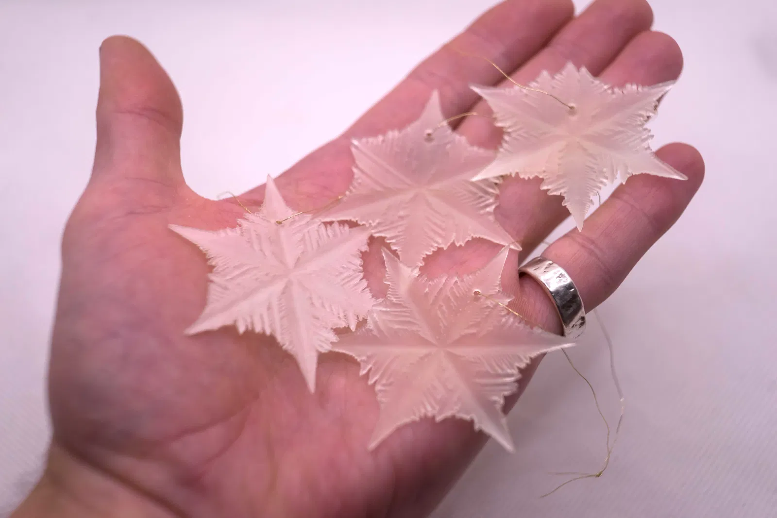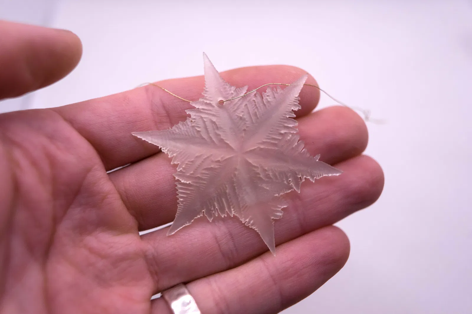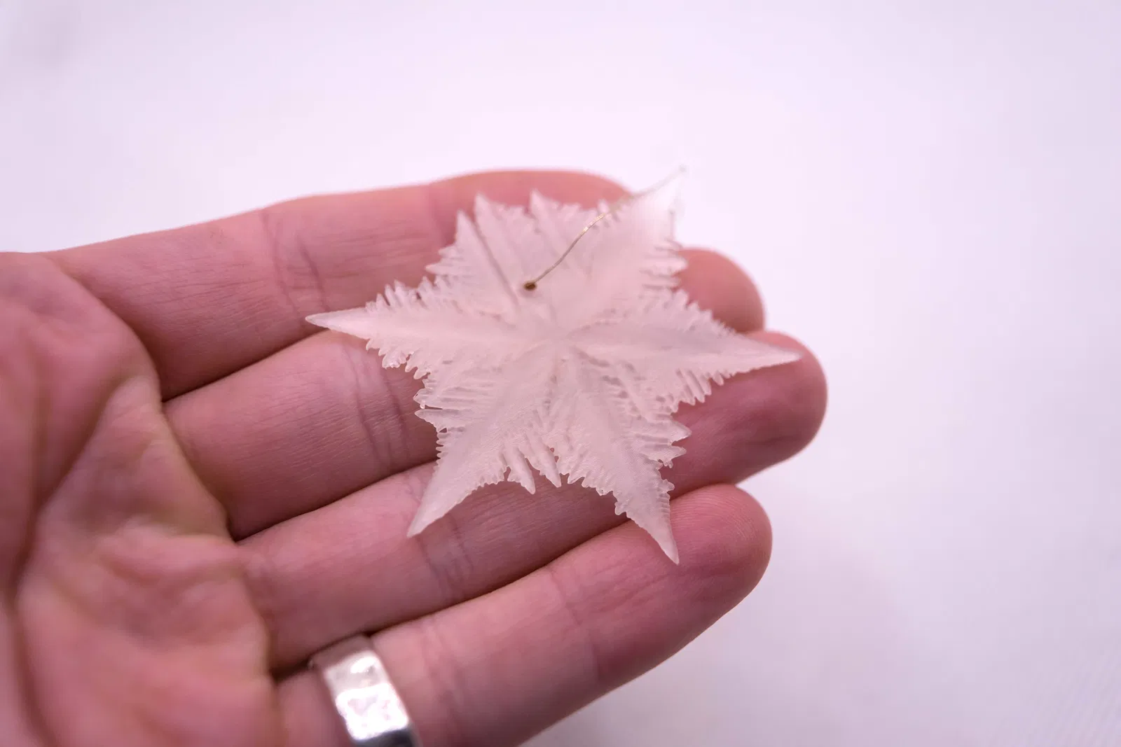 Với in FDM, mình khuyên bạn nên tách bông tuyết làm đôi và in phần mặt cắt phẳng đặt xuống build-plate, rồi dán hai nửa lại với nhau. Layer height thấp (.1 - .05mm) sẽ thể hiện cấu trúc 3D rõ hơn. Bạn cũng có thể in dạng một lớp bằng cách chỉnh Z-scale xuống khoảng ~10% nếu chỉ muốn làm nhanh một mớ theo dạng viền/outline và không muốn dán keo.