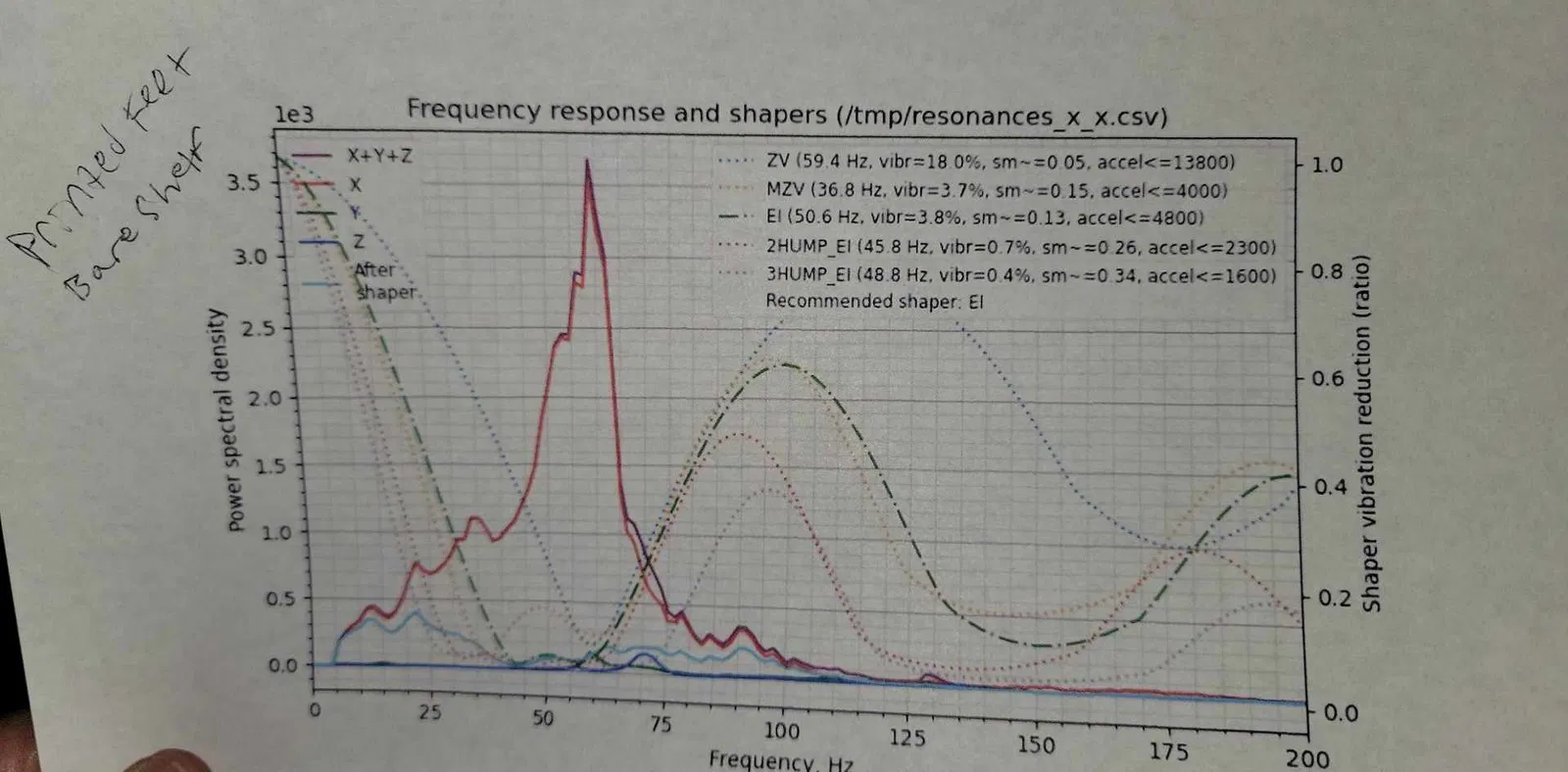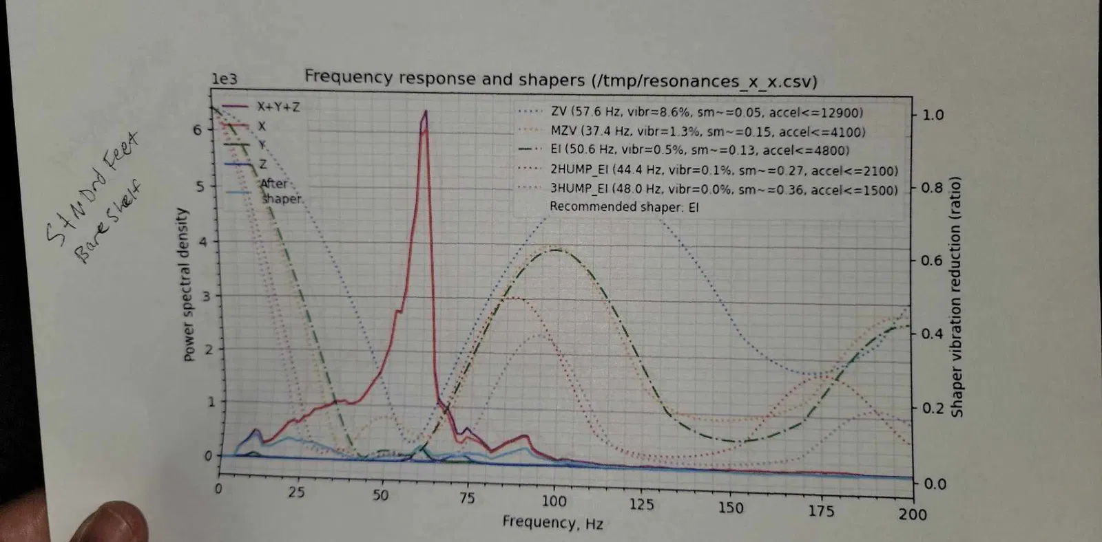 Mình cũng sẽ kèm thêm đồ thị input shaper trục X trước và sau để bạn thấy sự khác biệt mà nó tạo ra về biên độ của đỉnh cộng hưởng.
