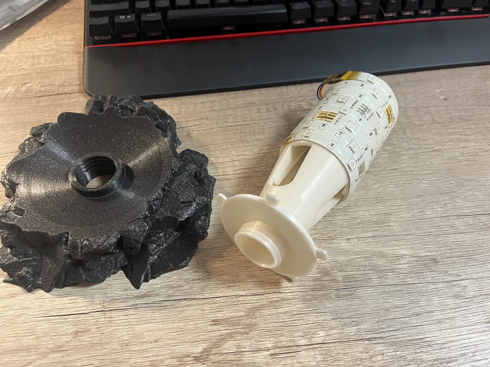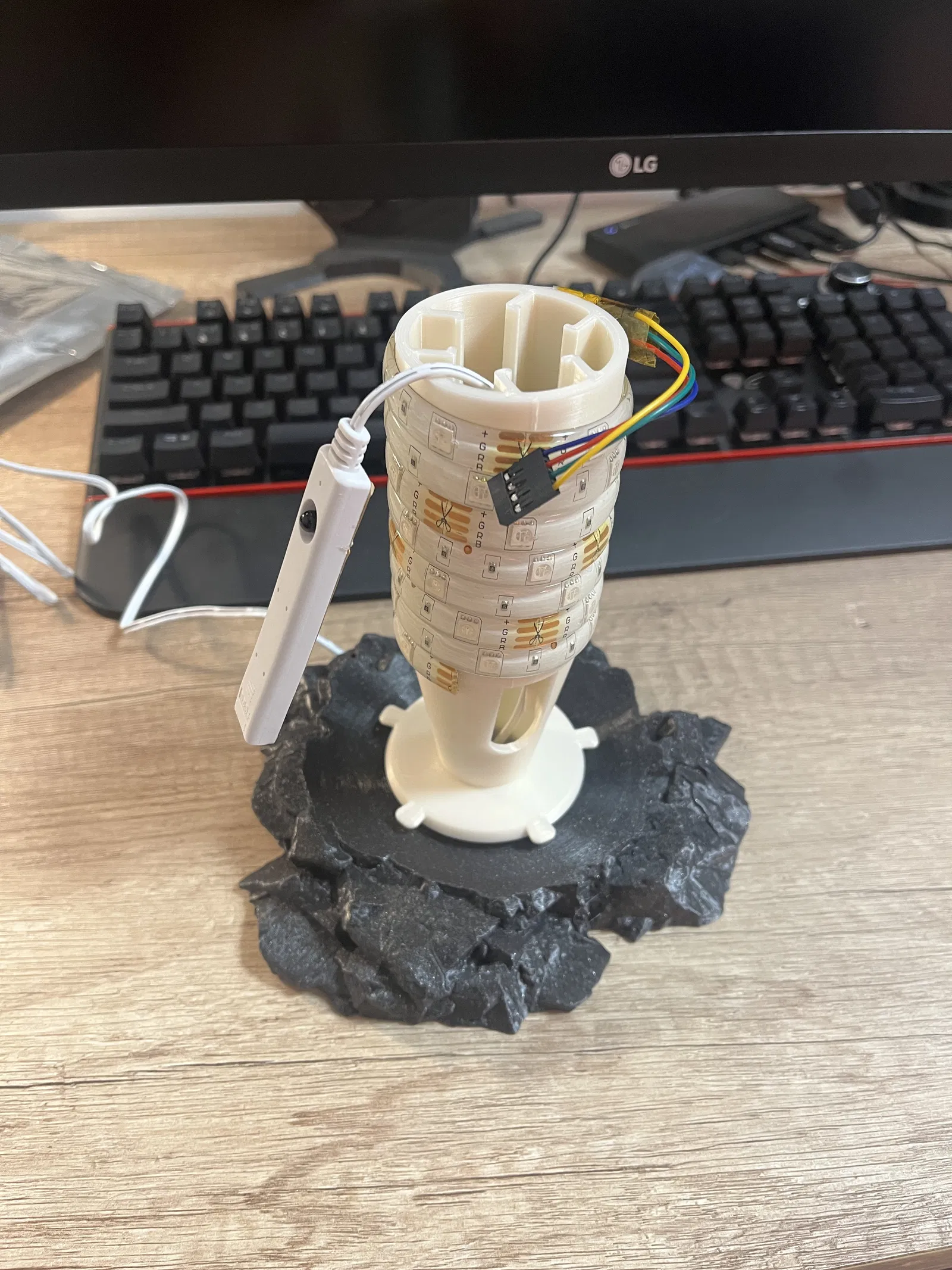 Bộ phụ kiện đầy đủ cho Moon lamp: đế đá (rock base) đã chỉnh lại để quả cầu ngồi trực tiếp lên đế và ngàm gắn LED strip điều khiển từ xa. Có nhiều lỗ để canh hướng IR receiver cho remote bắt tín hiệu tốt hơn.