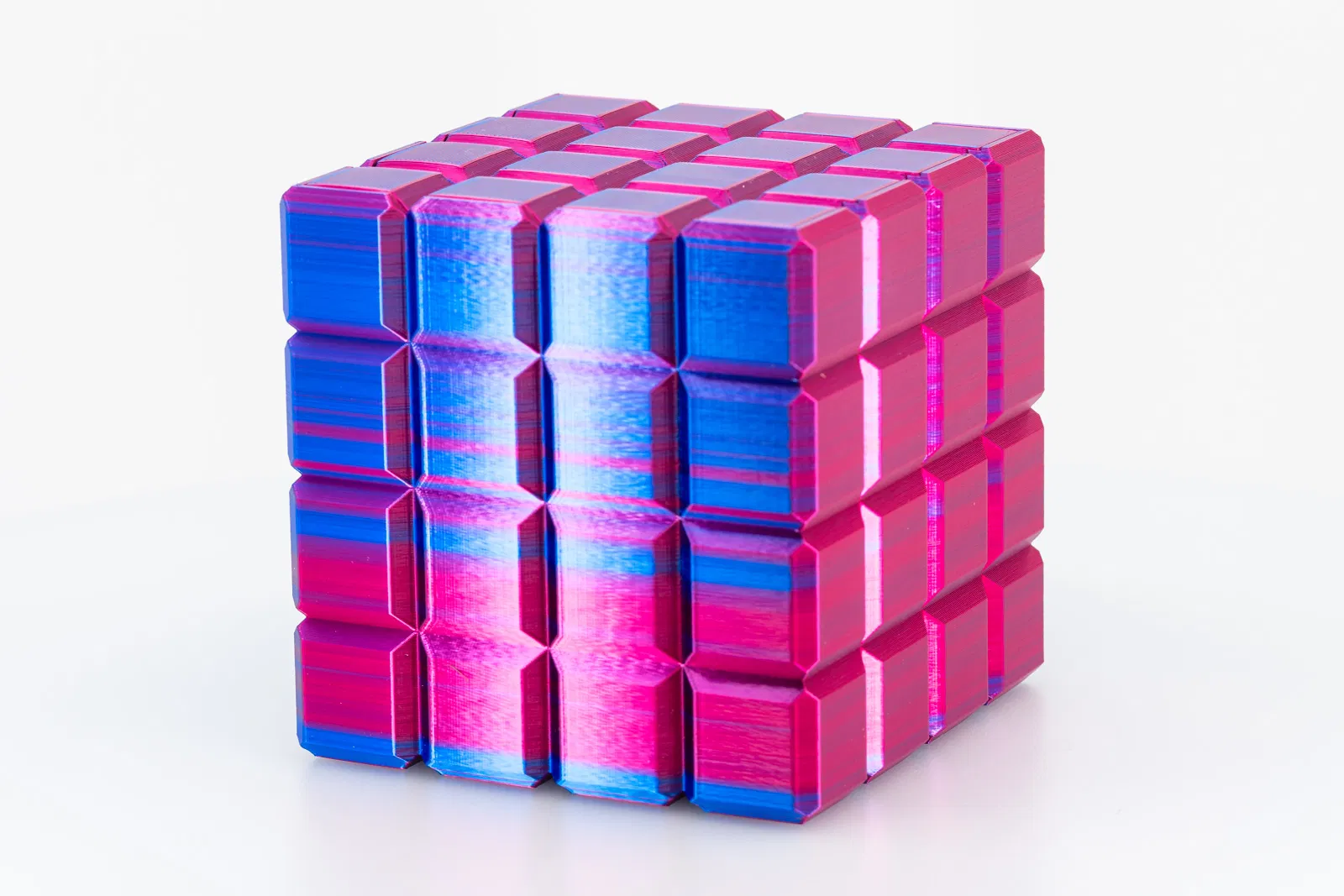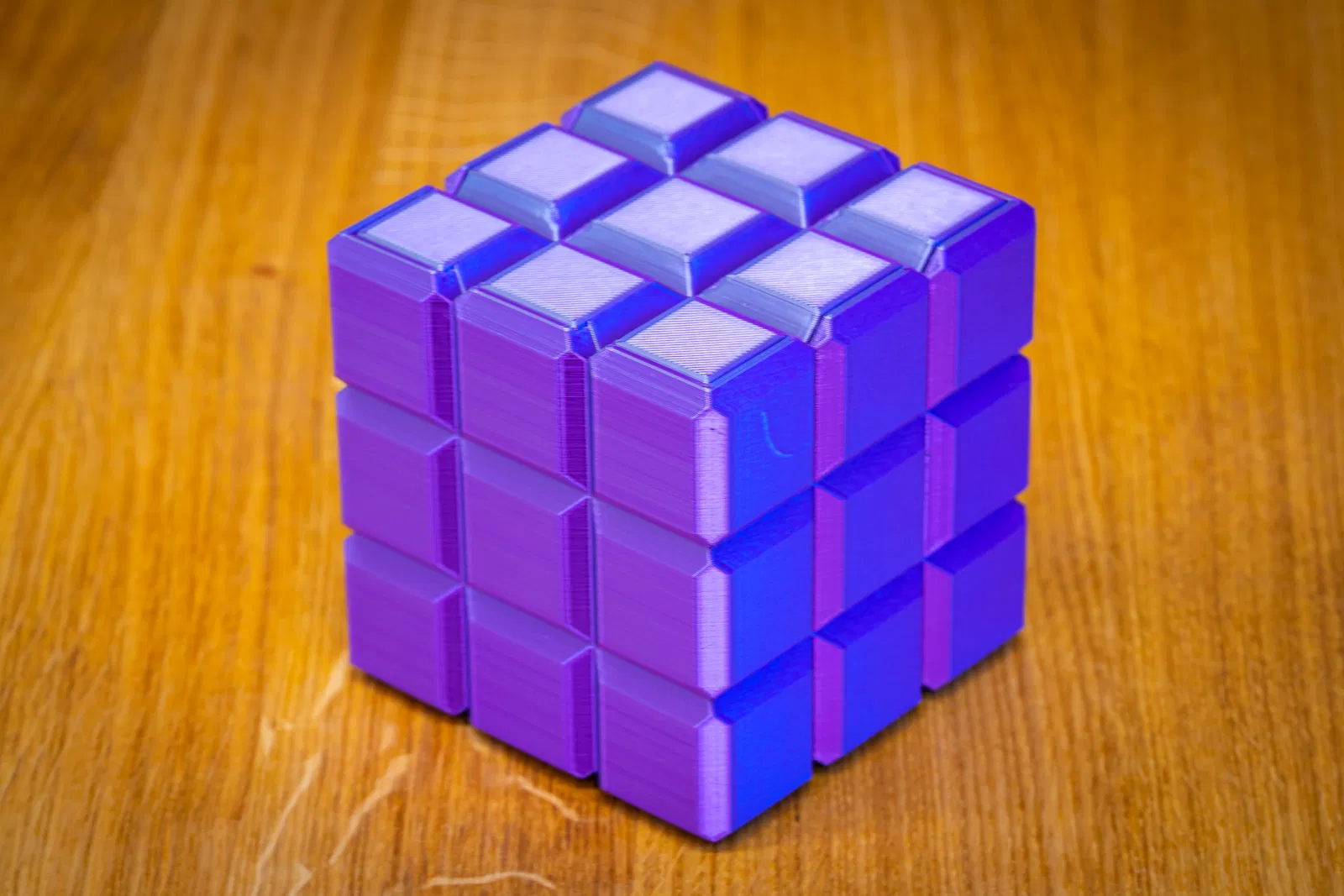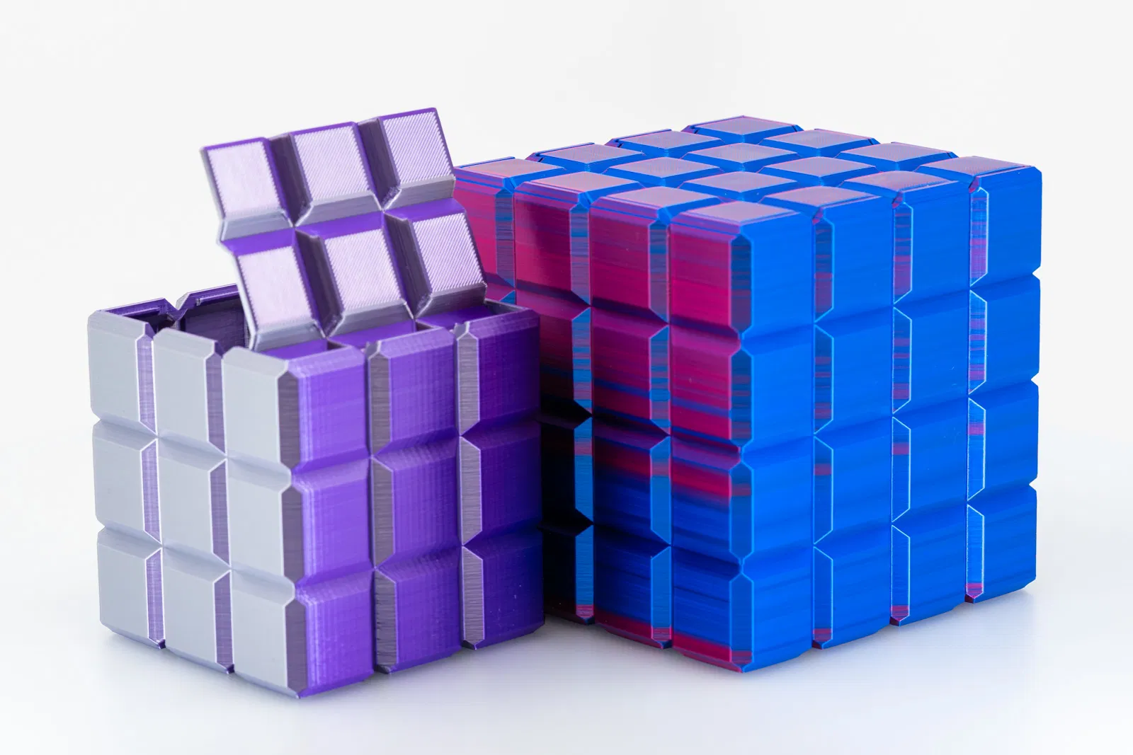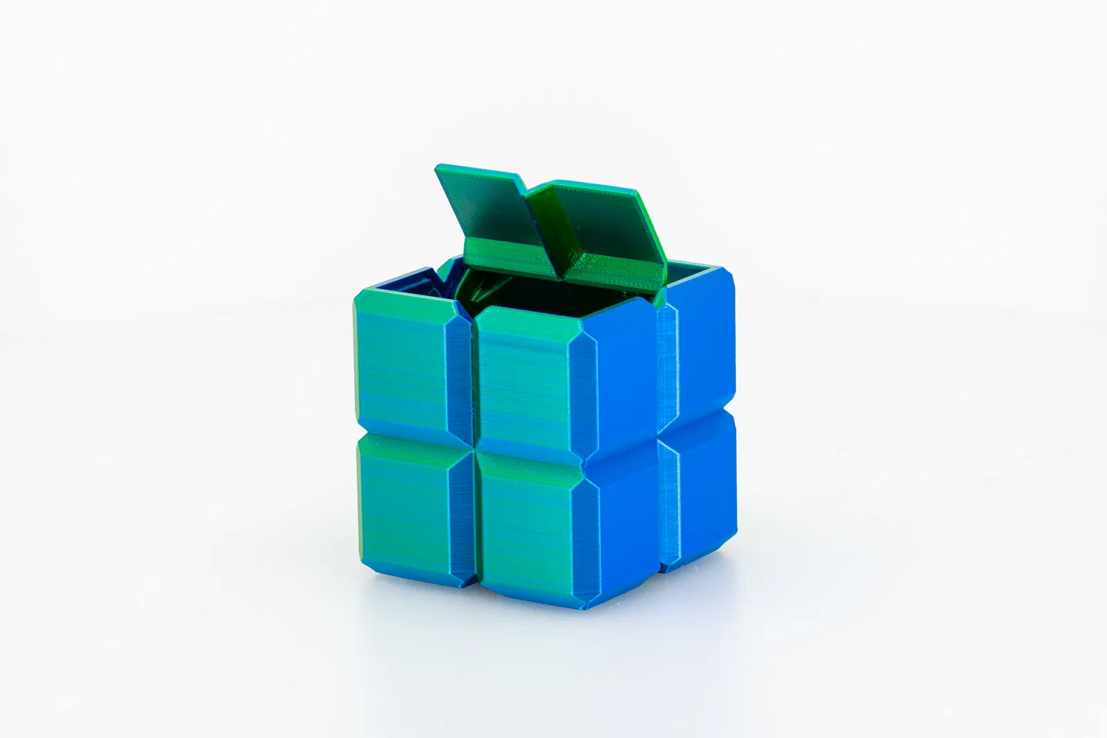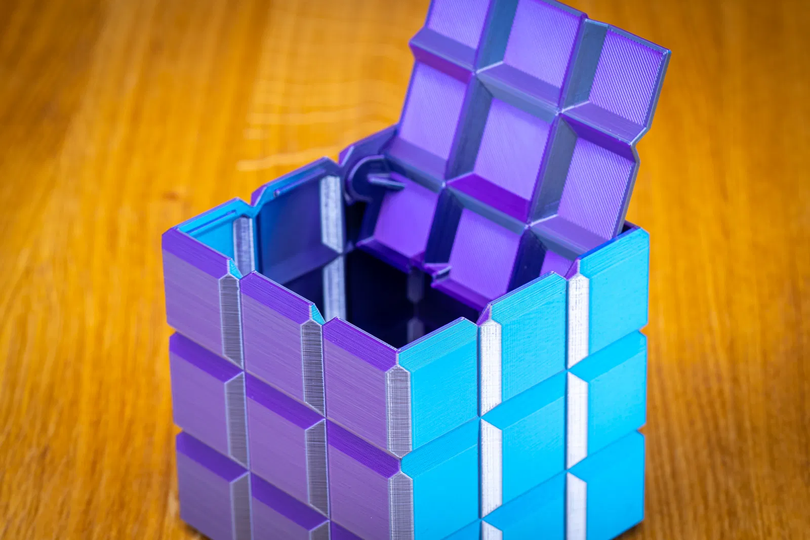 Mình thiết kế “box of cubes” này — một hộp chứa đồ trang trí có nắp. In không cần supports và dùng rất ít vật liệu, nhưng vẫn cho ra cái hộp chắc chắn, nhìn đẹp cả với filament đục lẫn filament trong.
