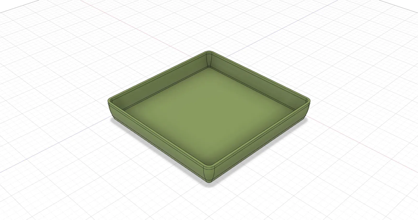 Mẫu khay classic viền dốc nhẹ, có đủ 120 kích thước từ 10–24 cm. Dùng như khay phẳng hoặc in thêm 4 feet để nâng khay. File đặt theo kích thước lòng trong (mm); kích thước ngoài cộng thêm 8 mm.