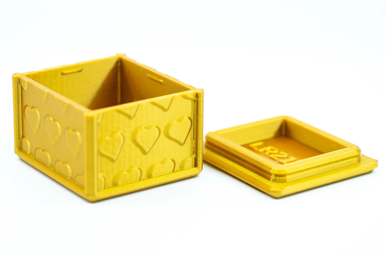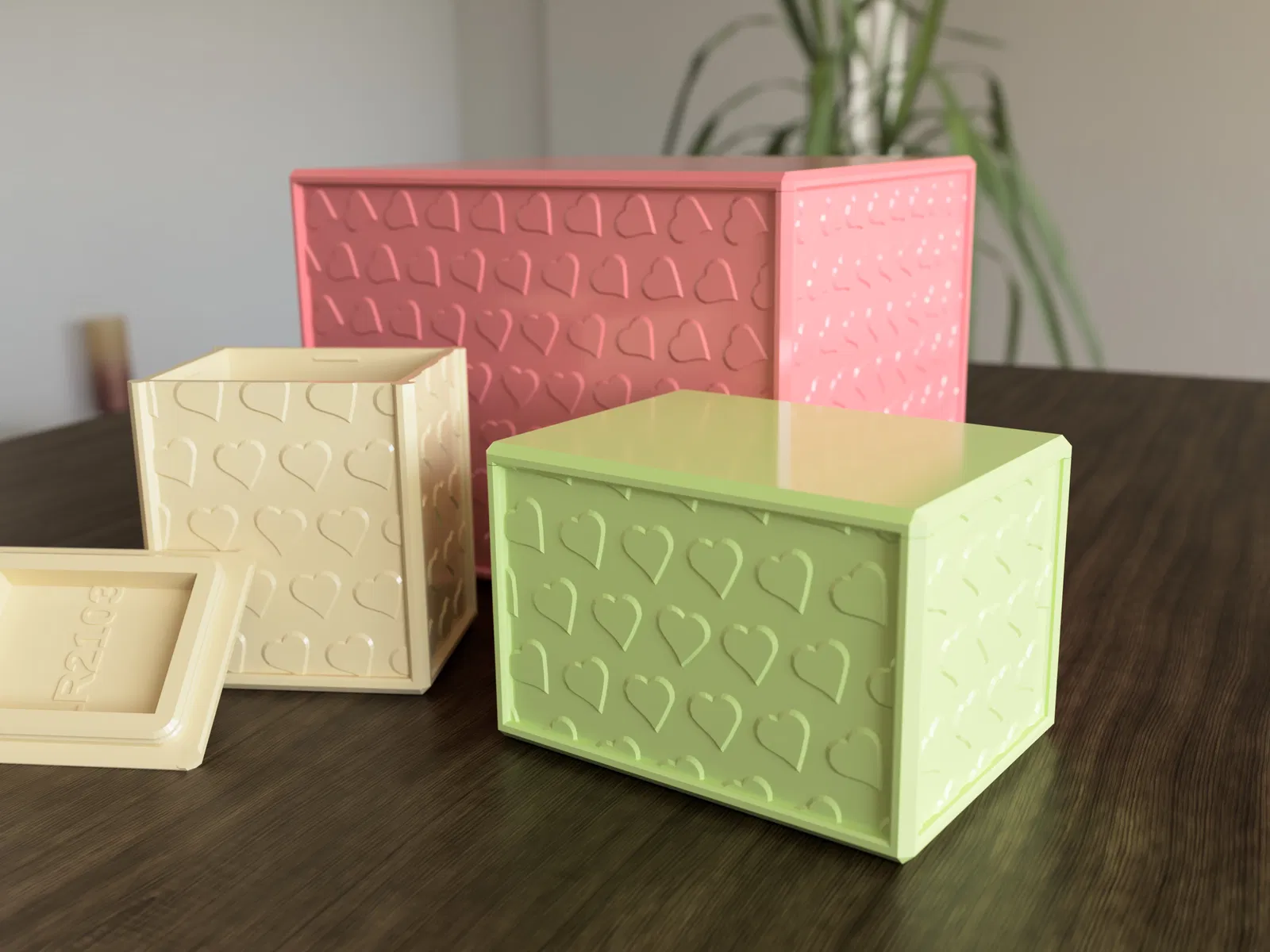 Đây là một cái hộp đơn giản có nắp và hoạ tiết trái tim trang trí. Model có sẵn 500 kích thước khác nhau.