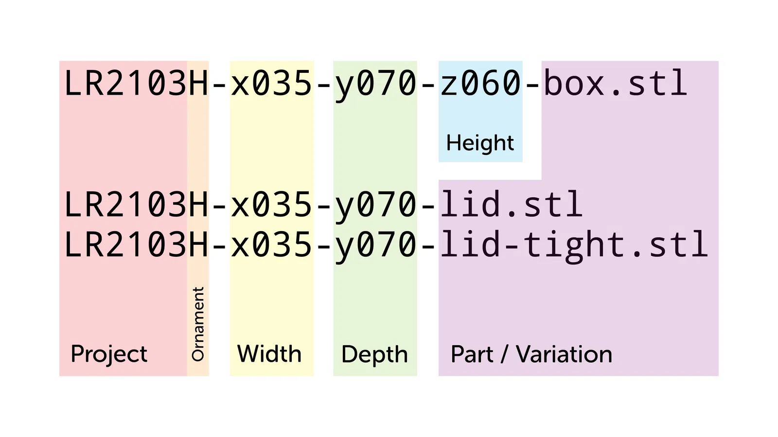 Để chọn đúng hộp, bạn cần biết kích thước lòng trong. Có thể chọn theo chiều rộng (x), chiều sâu (y) và chiều cao (z). Nếu bạn muốn in một cái hộp có kích thước 35×70×60mm, hãy tìm file có tên như vầy: