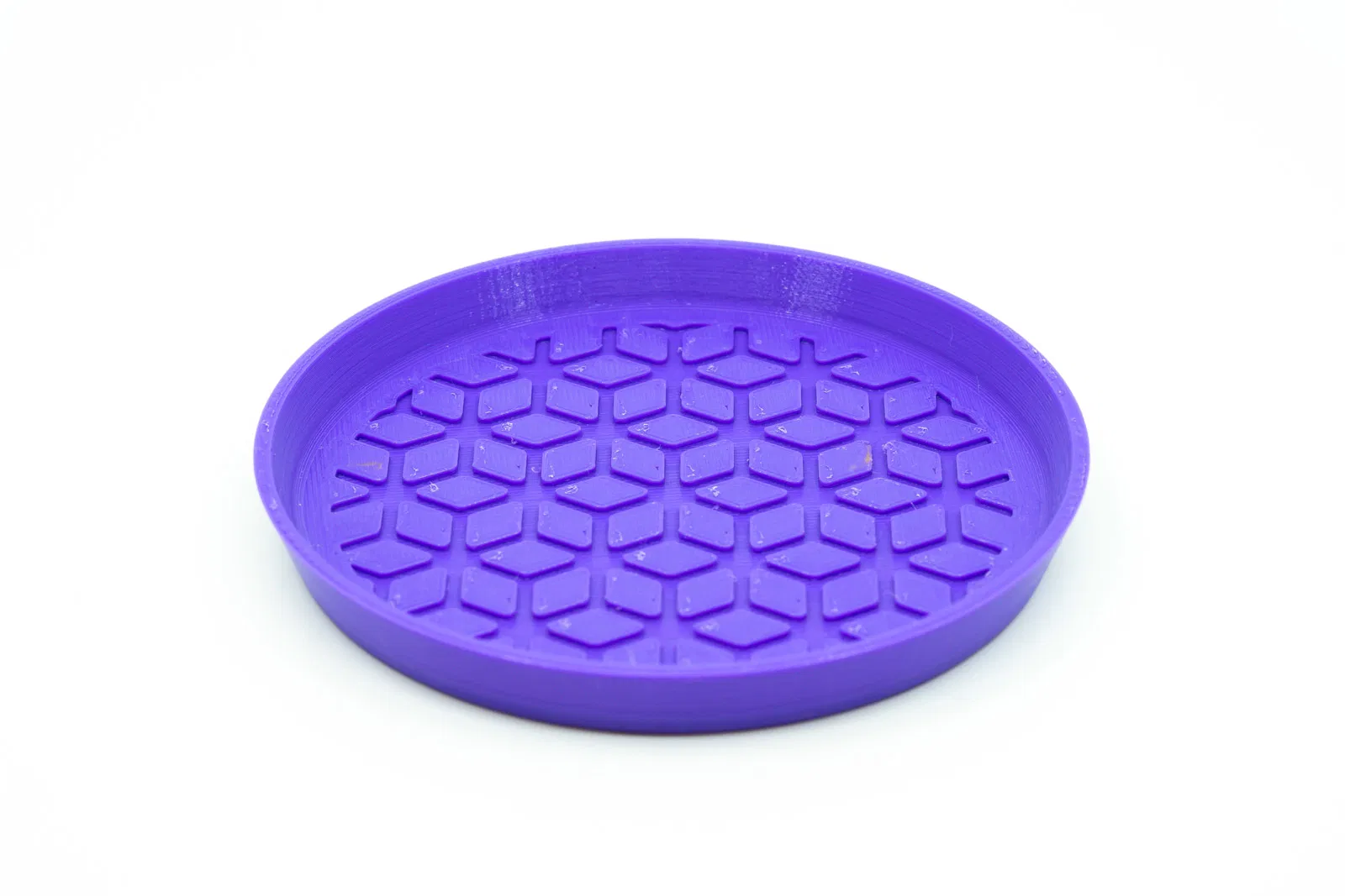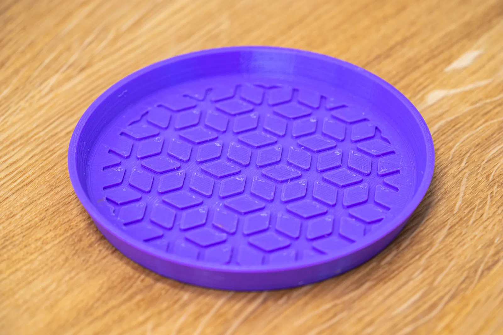 Coaster được in bằng Original Prusa i3 MK3S+ với filament PETG “Polymaker PolyLite PETG Violett”.