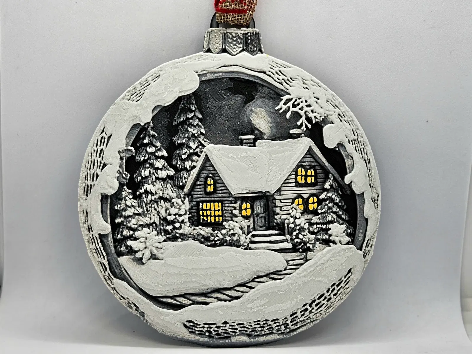 Winter Haven là quả châu Noel tái hiện căn cabin phủ tuyết với ánh đèn ấm áp giữa đêm đông. Có bản 6/4 màu và 2 kích thước 160mm, 120mm; hỗ trợ đổi màu theo layer để tiết kiệm filament.