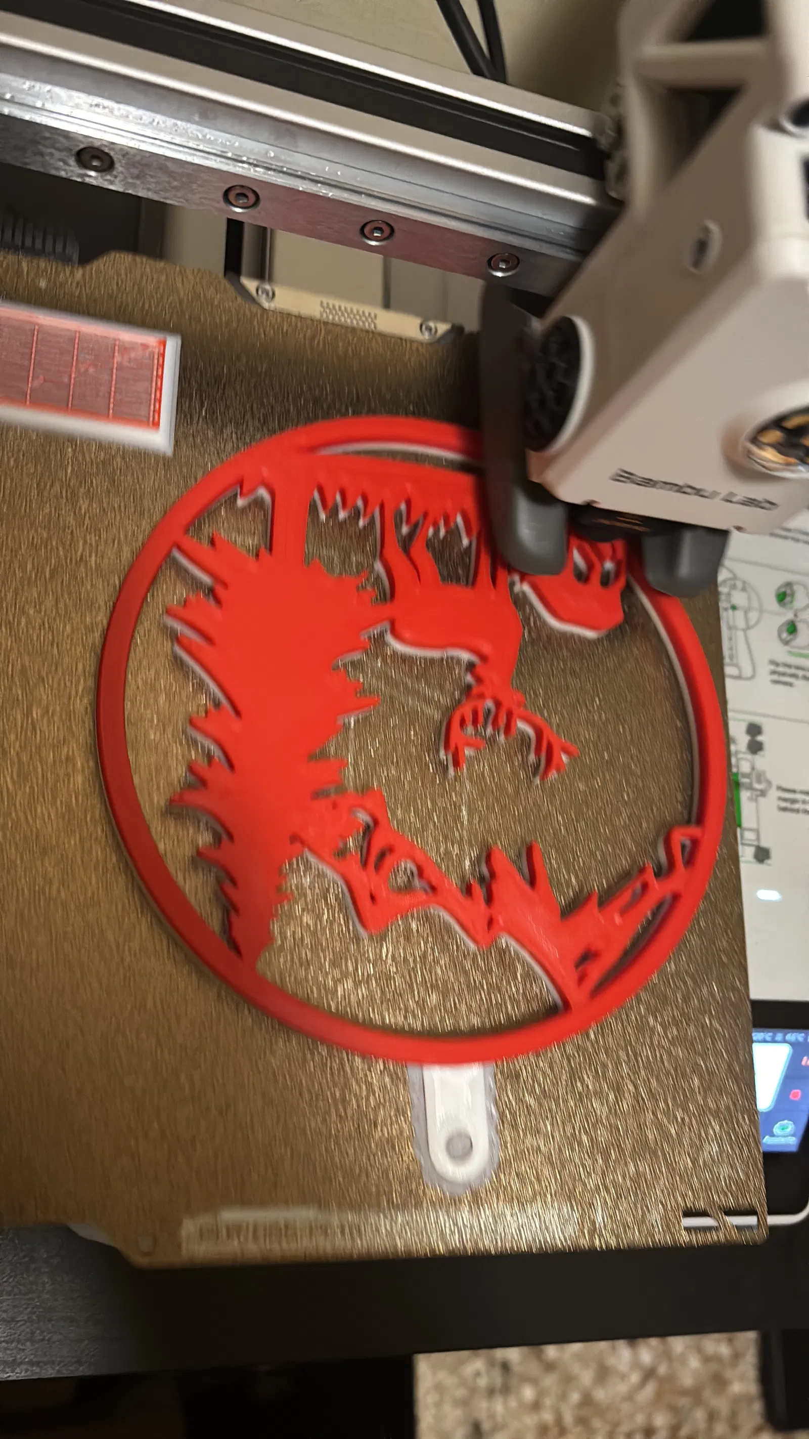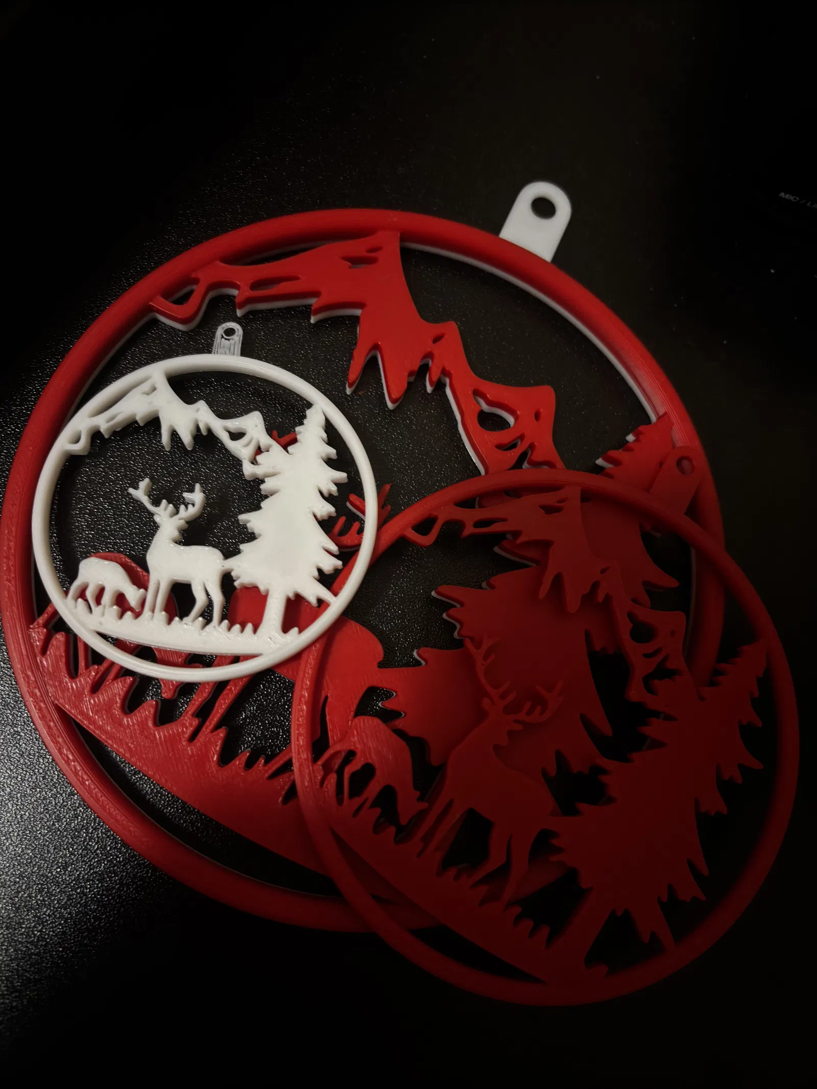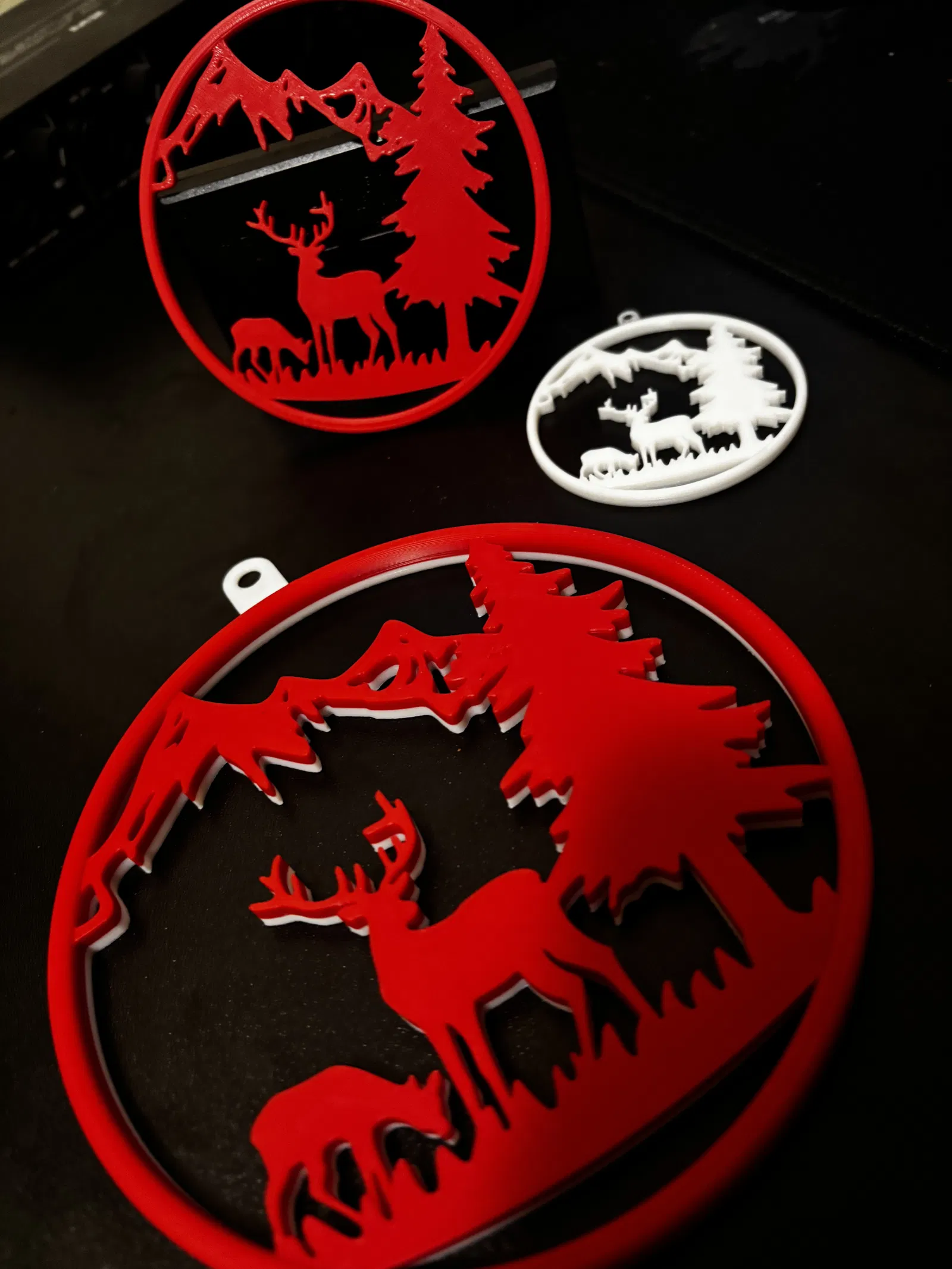 Món ornament trang trí này được in 3D bằng filament đỏ và mô tả một khung cảnh thiên nhiên. Bên trong một vòng tròn là phong cảnh với ngọn núi cách điệu ở hậu cảnh, một cây thường xanh bên phải và hai con nai ở tiền cảnh: một con đứng với cặp gạc uy nghi, con còn lại đang cúi xuống gặm cỏ.