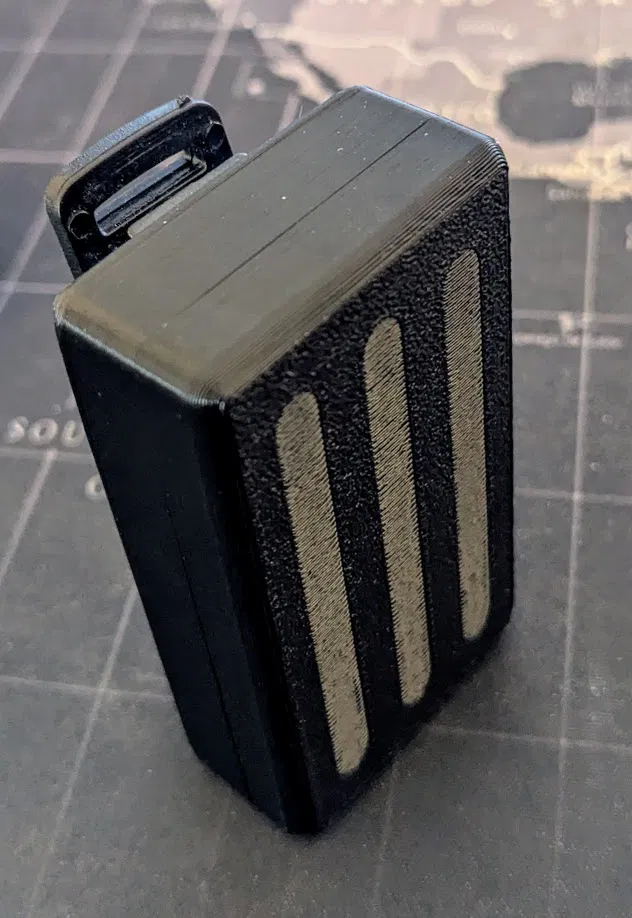 Thiết kế dựa trên FakeTec DIY meshtastic module (tự ráp tốn cỡ $10 tiền linh kiện), cái vỏ này chỉ 40x20x73mm (1.5x0.8x2.9in) và nặng đúng 2oz (56g) khi lắp hoàn chỉnh kèm belt clip Baofeng. Phần vỏ in chỉ gồm 2 mảnh clamshell, và cả hai mảnh có thể in với chỉ khoảng 16g filament trong chưa tới 45 phút trên một máy in ngon.
