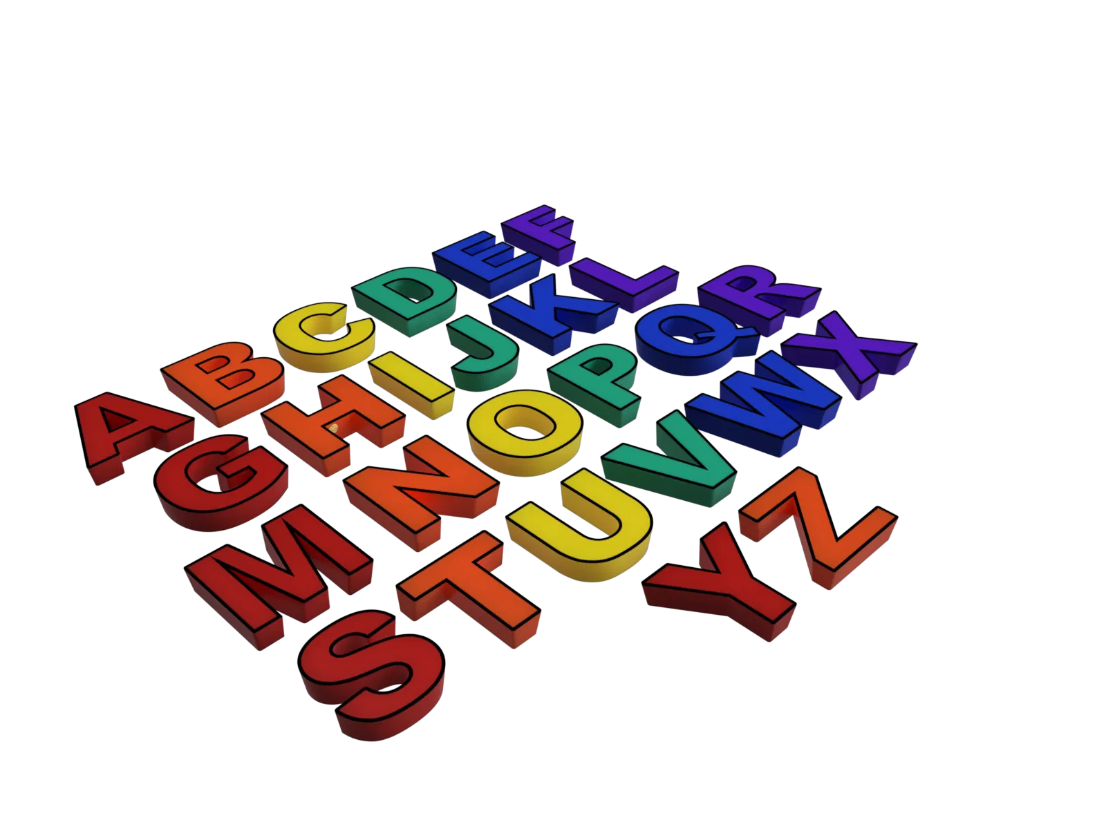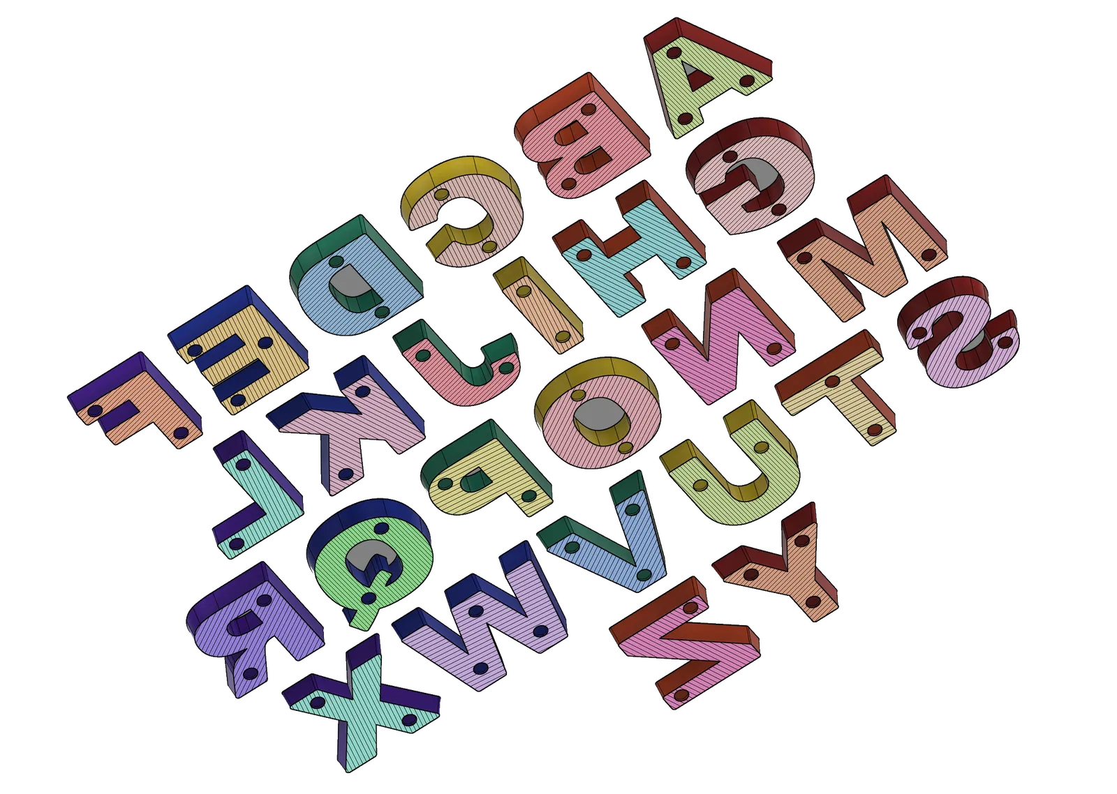 Bộ chữ cái và số cỡ lớn dạng nam châm tủ lạnh, thiết kế để in multi-color thủ công. In viền và thân tách file gcode, đặt chồng lên nhau, có khoang tròn để gắn nam châm neodymium 6x2 mm khi pause.