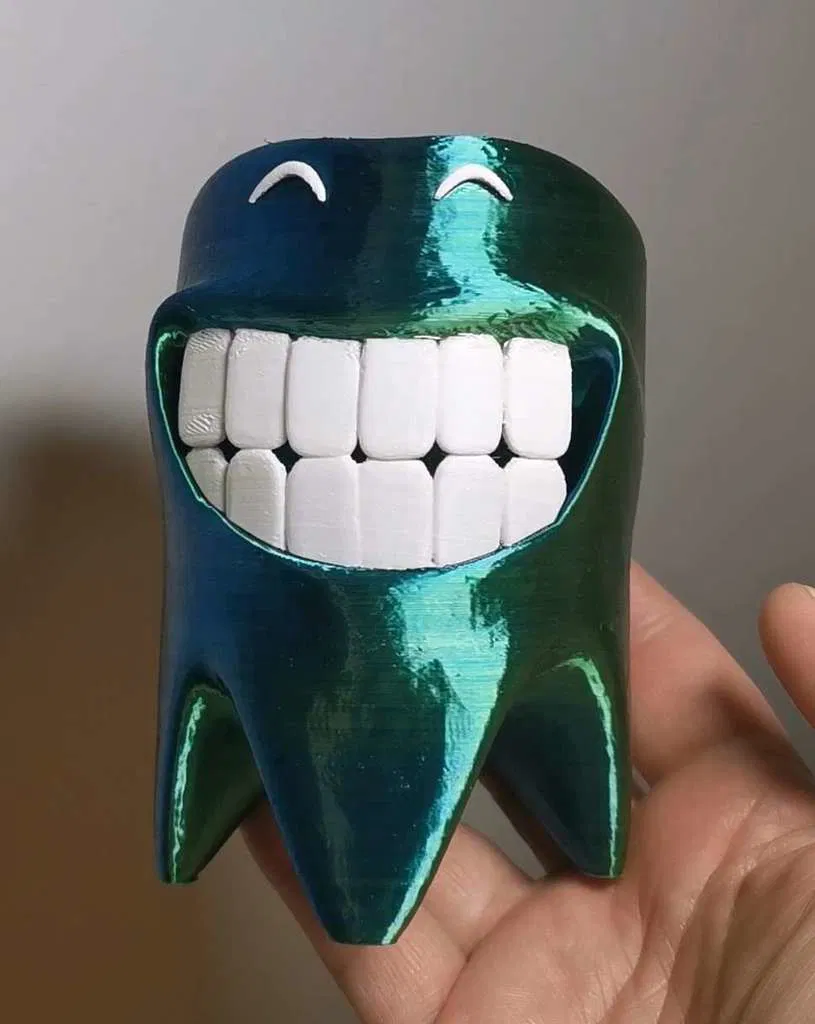 Mẫu giá đỡ bàn chải hình chiếc răng vui nhộn, có nụ cười và lông mày. Các phần được tách rời để in nhiều màu. Không cần support cho phần chính; dùng brim quanh chân và Tree Support cho lông mày, răng.