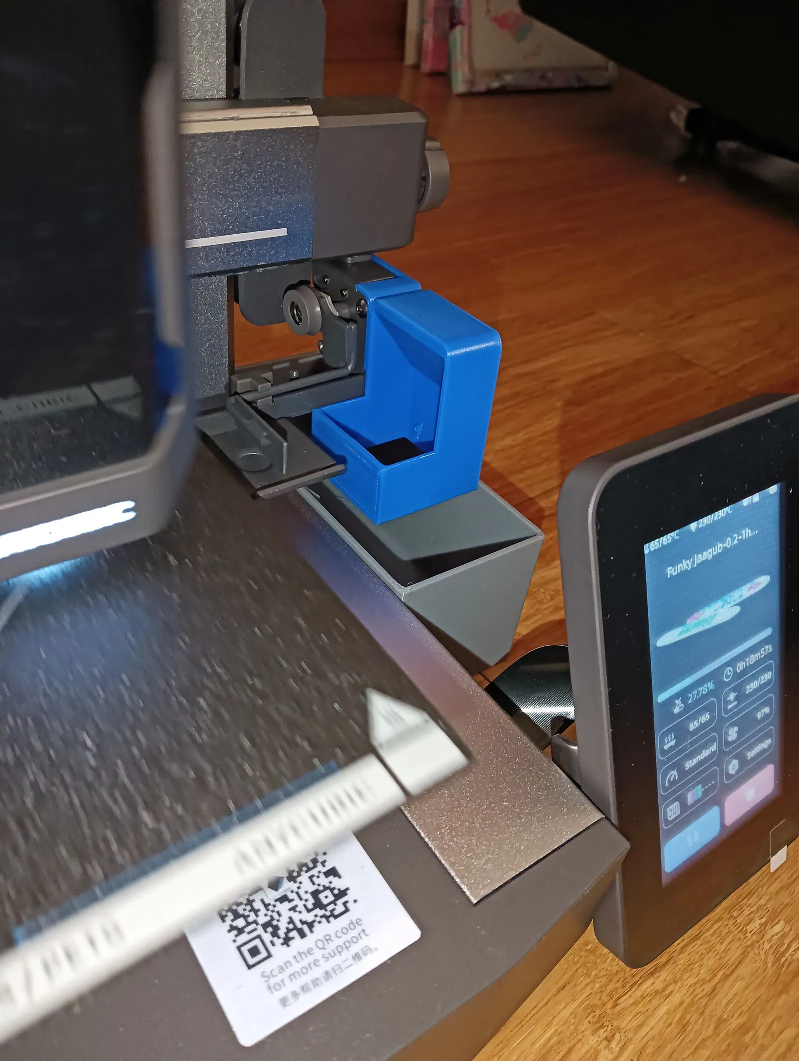 Hệ thống hứng “filament poop” cho Anycubic Kobra 3 gồm một bộ đổi hướng filament và một thùng hứng gắn nam châm.
