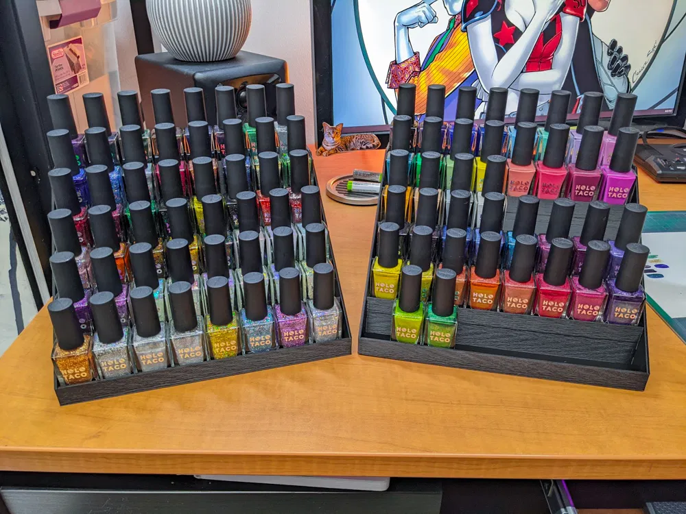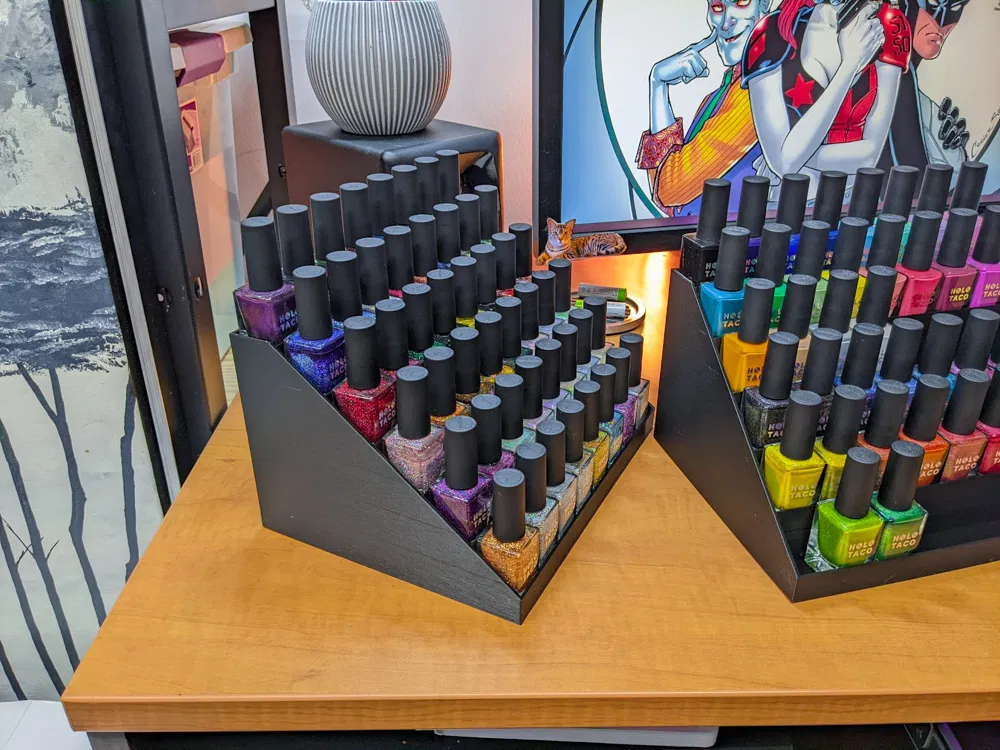 Kệ đựng sơn móng thiết kế cho 48 chai Holo Taco, vừa chai 28mm x 28mm. Kết cấu chắc, “cat proof” giúp chai không bị nghiêng đổ. Gợi ý in infill 15%; sẽ tốn hơn nửa cuộn filament 1KG.