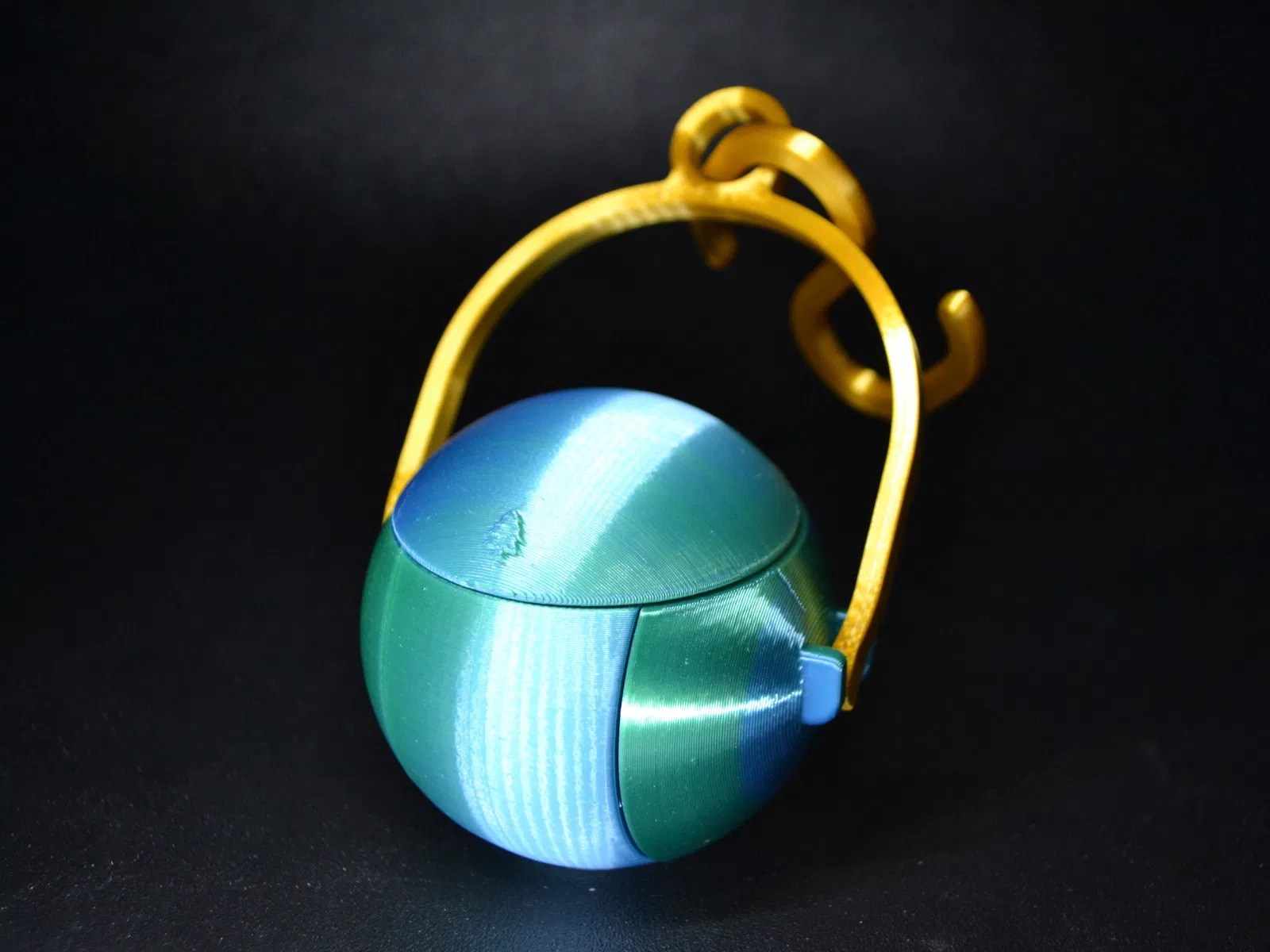 Đẩy nắp ra sau là ông già Noel nhỏ xíu bật lên khỏi quả ornament. Có thể dùng làm quà Noel/Xmas, đồ chơi vui tay, hoặc treo lên cây thông làm bauble/trang trí cực dễ thương.