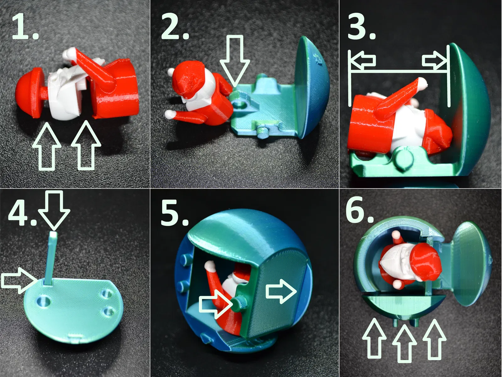 - Cố định Santa vào vòng/ring/hoop gắn với nắp (đẩy/trượt cho khớp)