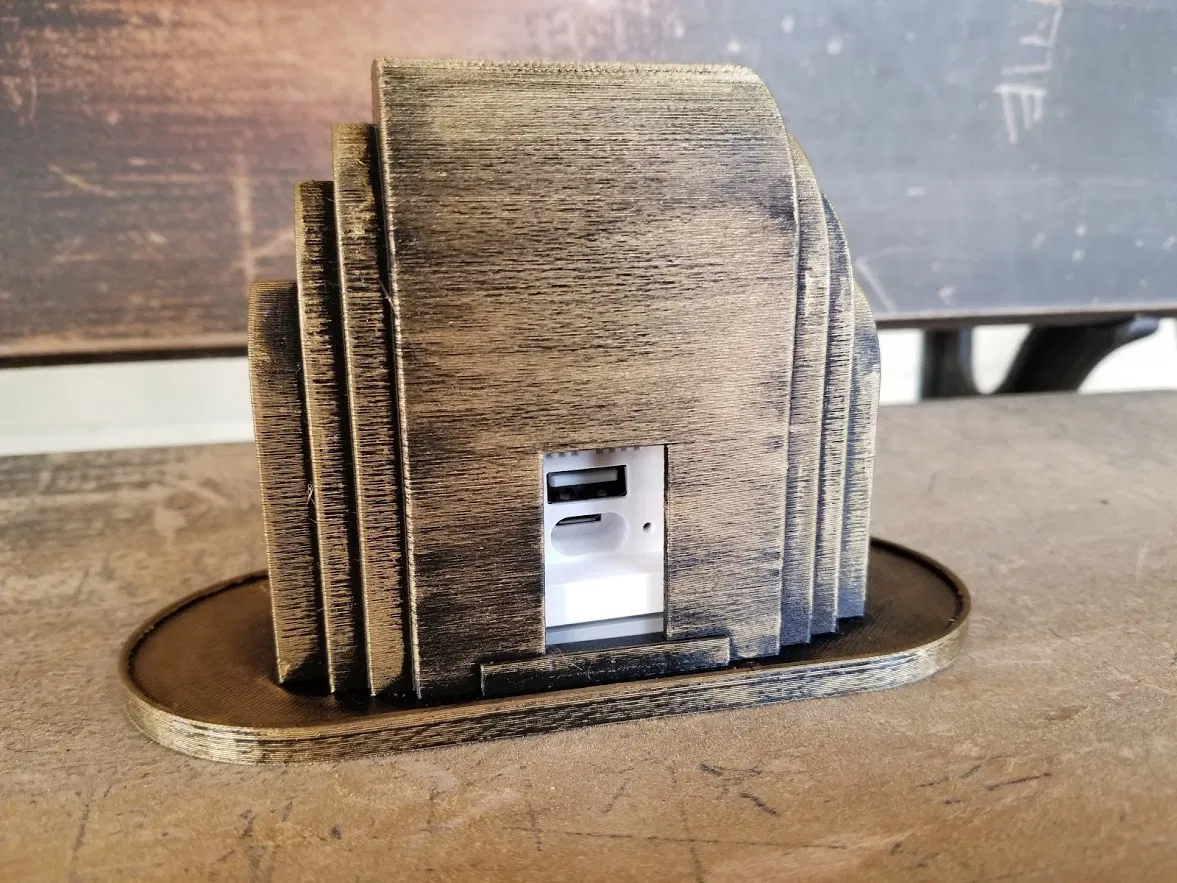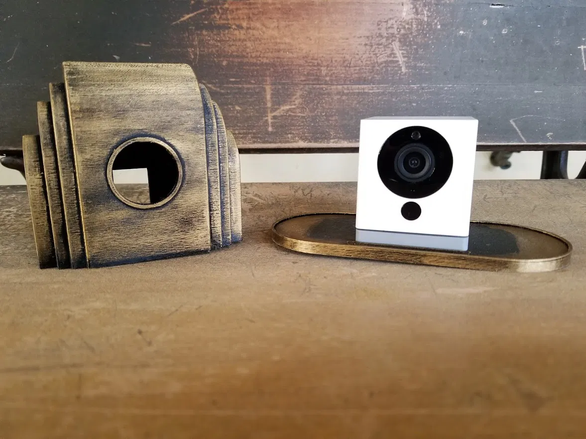 Vỏ phong cách Art Deco bấm khớp vừa khít lên camera Wyze, vẫn cho phép cắm nguồn USB ở mặt sau. Phần interface ở đế được làm lớn hơn so với ảnh để giảm ứng suất khi sử dụng.