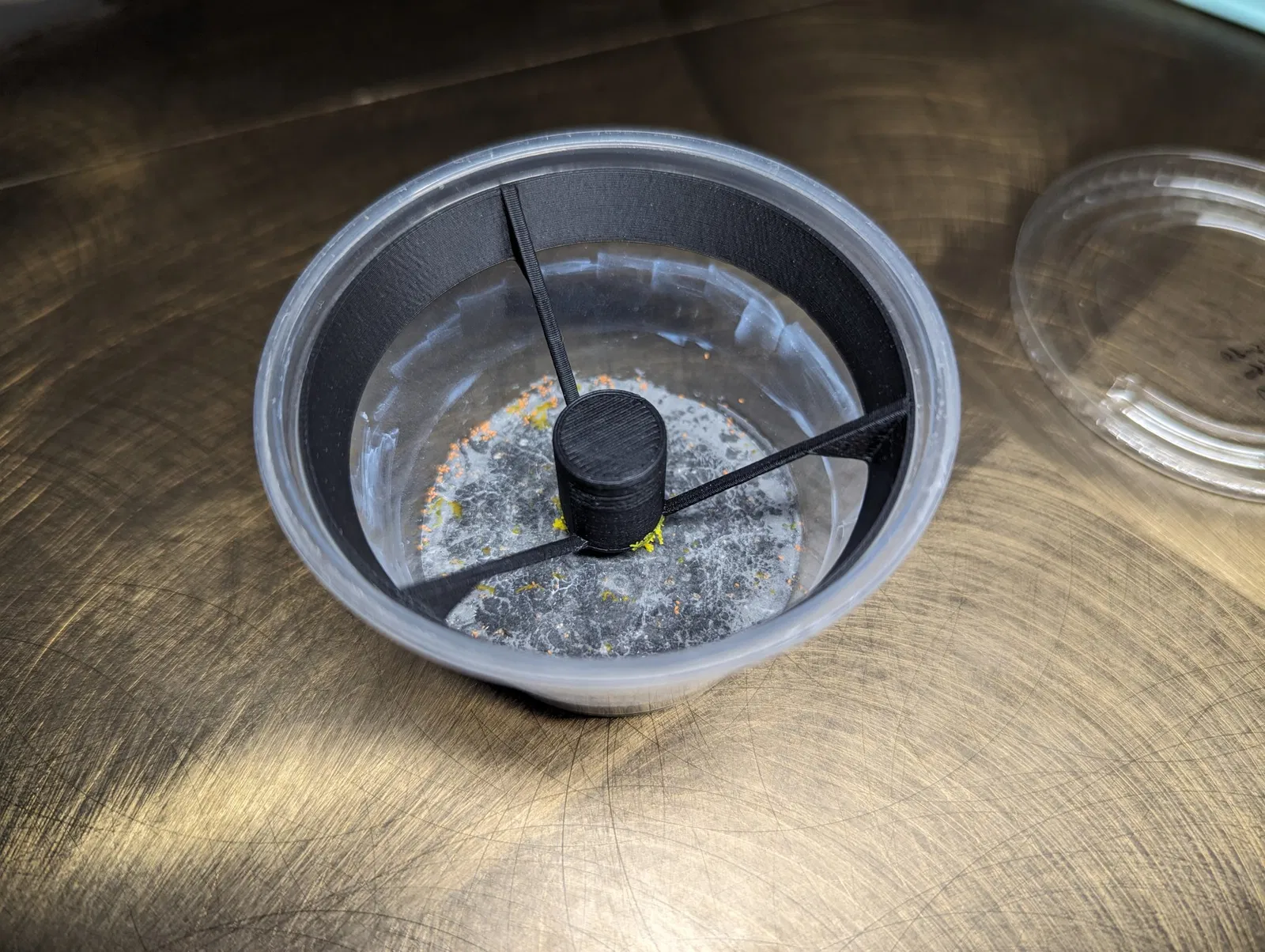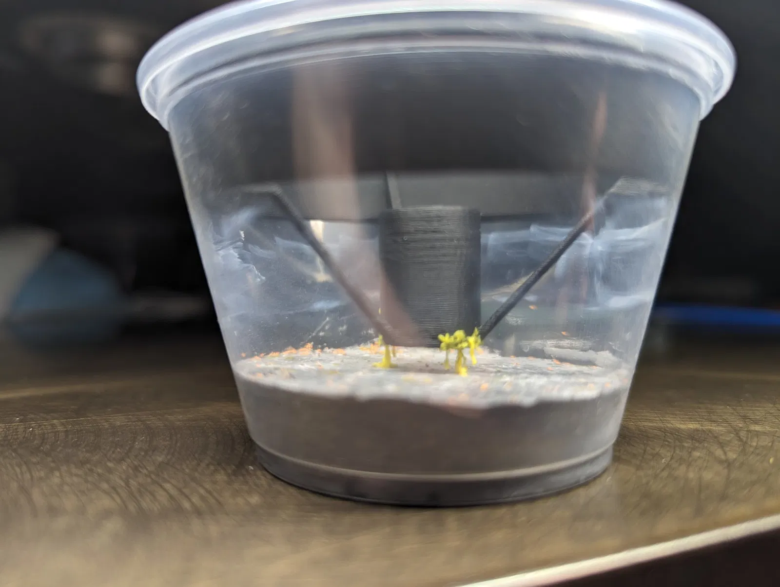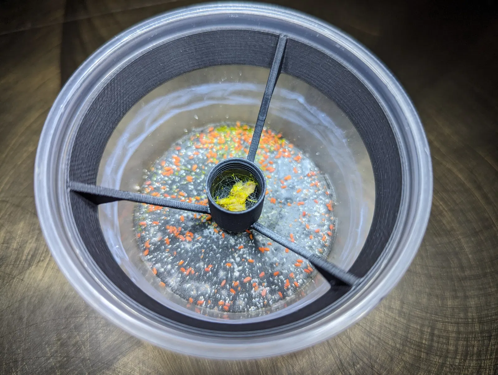 Một viên nang treo vừa vặn trong một cốc deli 4oz, với những khoảng trống rất nhỏ cho phép nấm slime thoát ra.