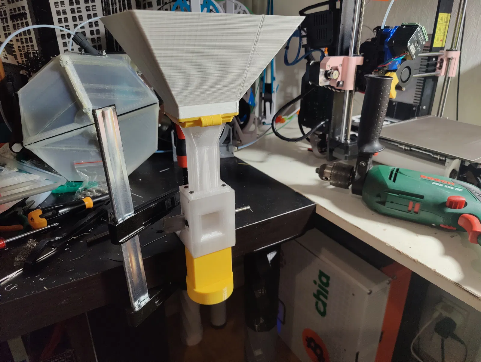 - Bộ gắn phễu lớn hơn. Kẹp lên phễu zin nên vẫn dùng được. Cho vật liệu vào dễ hơn