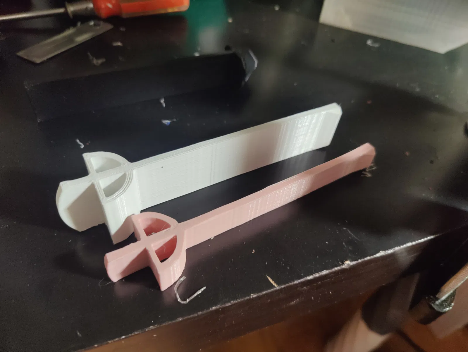 - một chi tiết gia cường cho thân shredder. Mình in phần này bằng carbon fibre filament và dùng vít gỗ để bắt vào thân shredder. Dùng các lỗ của adjustment screw để canh vị trí khi khoan lỗ bắt vít.