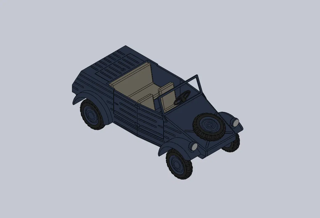 Mẫu Volkswagen Type 82 Kubelwagen tỉ lệ 1:18. Đã nới clearance để lắp ráp dễ hơn; lốp khuyến nghị in bằng flexible resin (hoặc in dính sẵn vào bánh). Kính chắn gió dùng nhựa trong, cần keo và dũa khi ráp.