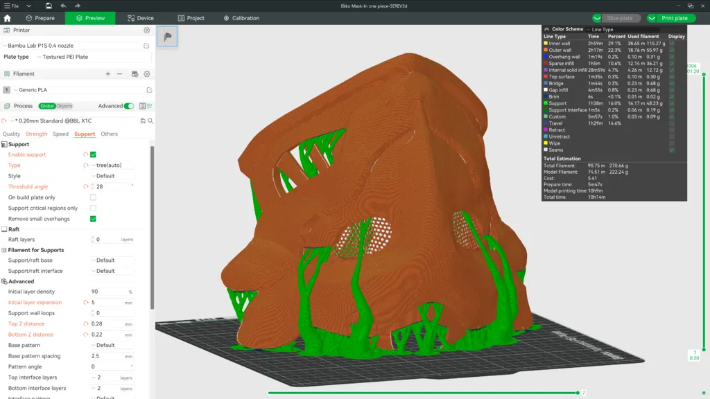 Supports: Automatic Tree(organic) Supports, Threshold angle 28° TopZ Distance: 0.28, BottomZ Distance: 0.2 (để vậy thì gỡ supports dễ; nếu bản in của bạn dễ bị xê dịch hoặc fail ở đoạn đầu, chỉnh xuống thấp hơn như 0.15 — gỡ supports sẽ khó hơn, nhưng sẽ giữ chắc hơn khi in)