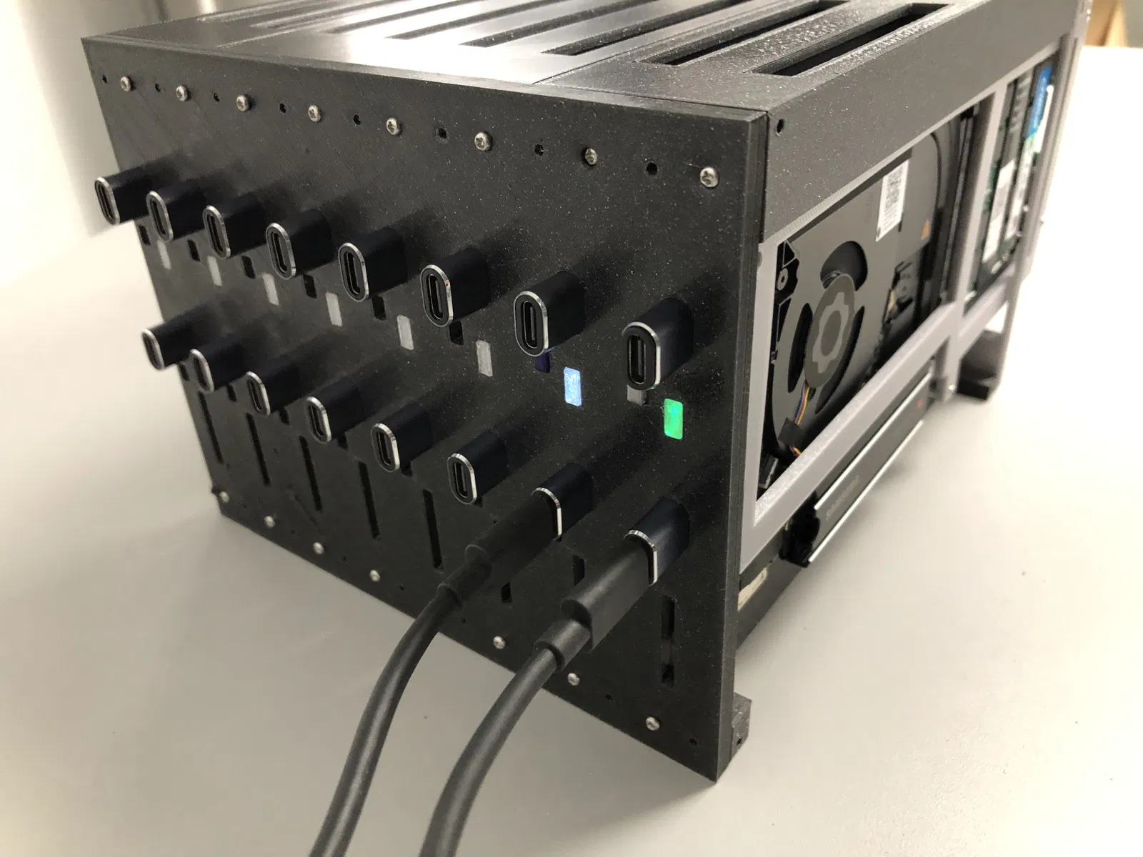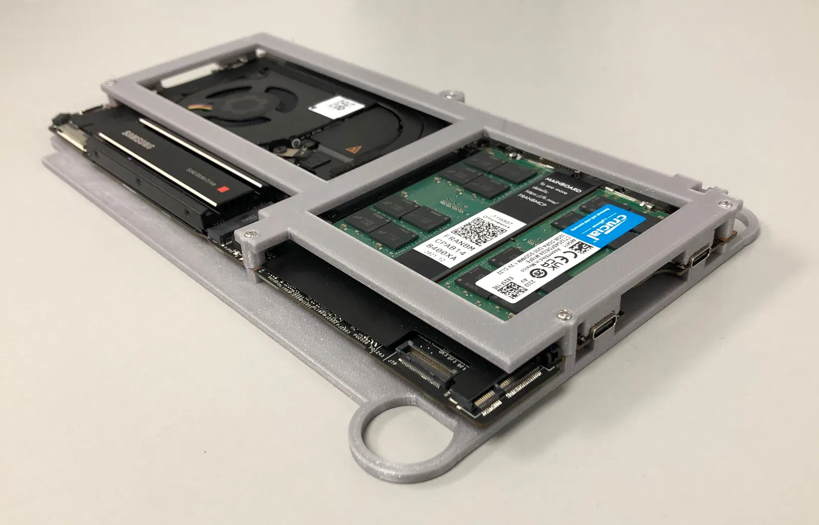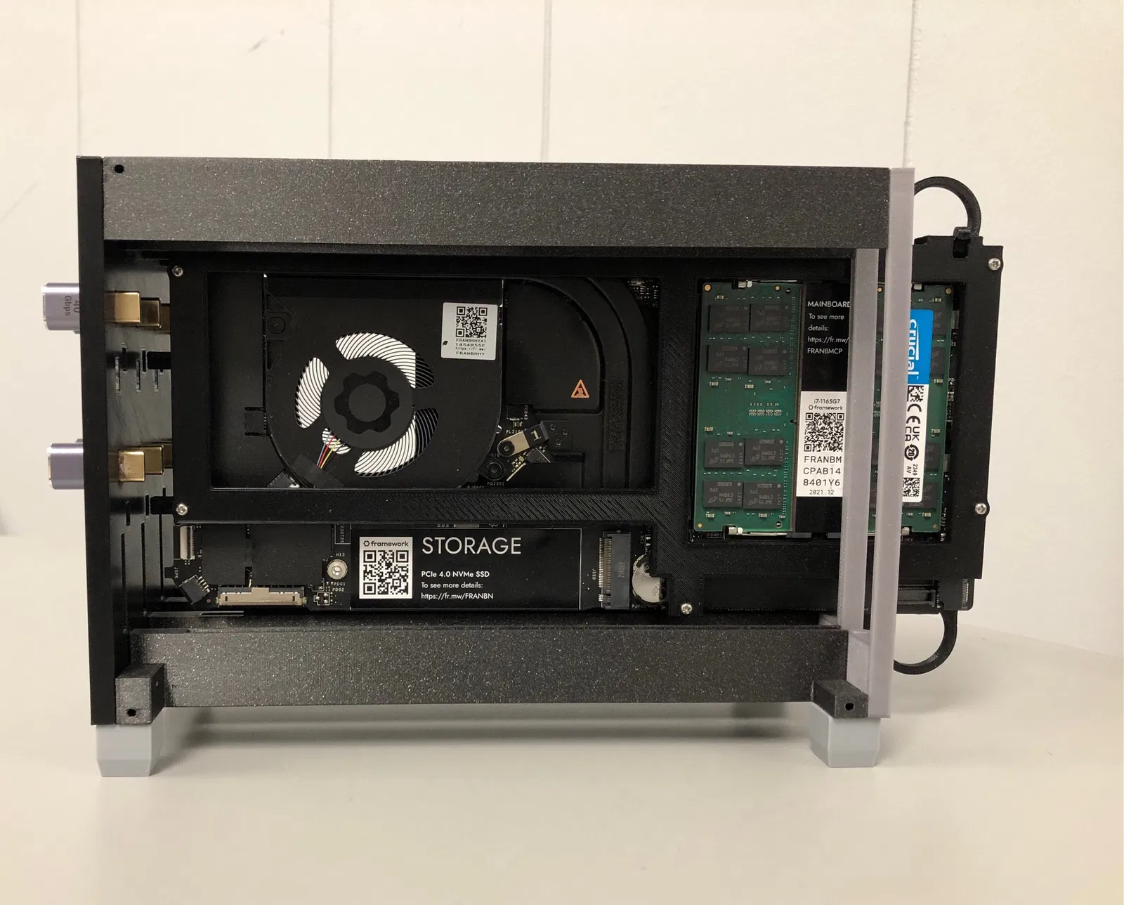 Mỗi Framework mainboard được bọc trong một “carrier” trên và dưới, dùng ốc 15mm, giúp bo mạch có thể trượt ra/vào chassis dễ dàng. Tấm plate phía sau có chừa các khe cho thiết bị USB-C pass-thru, giúp kết nối thuận tiện tới nguồn và các thiết bị ethernet. Phần LED insert giúp nhìn rõ các LED trên Framework mainboard.