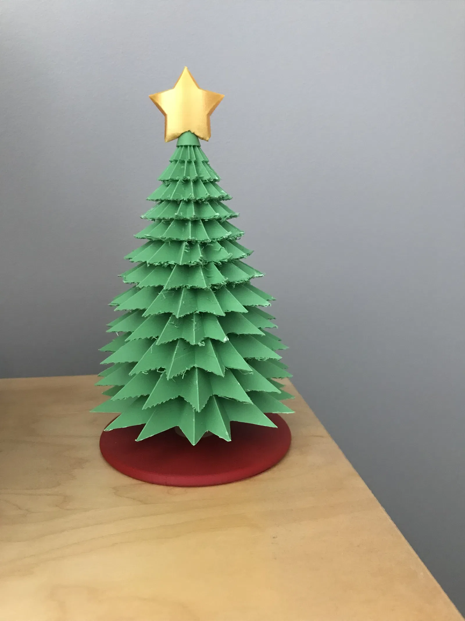 Cây thông Noel này gồm 4 phần, thiết kế cho mùa lễ. Phần chân váy (skirt), thân cây (tree), gốc cây (tree stump) và ngôi sao (star) cần được in riêng từng phần và dùng màu riêng cho mỗi phần.
