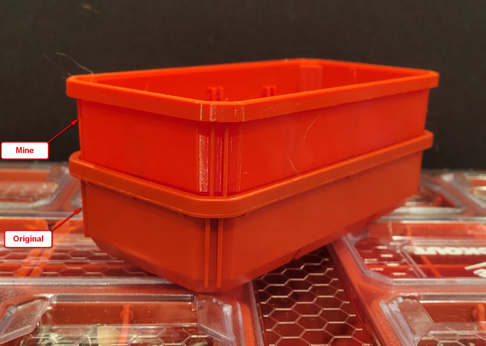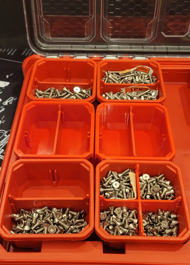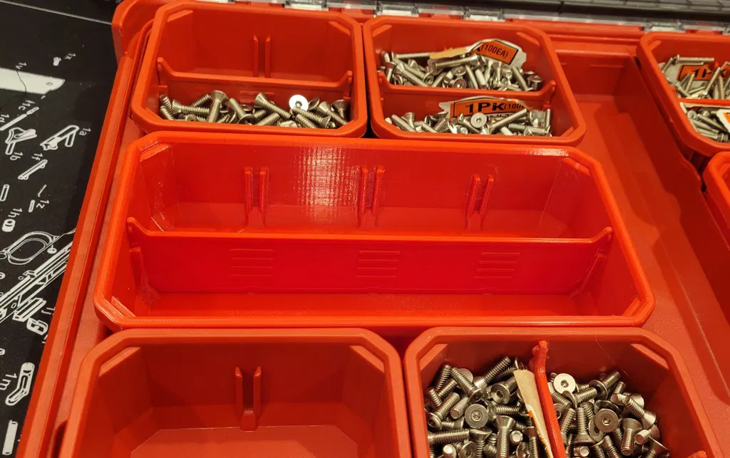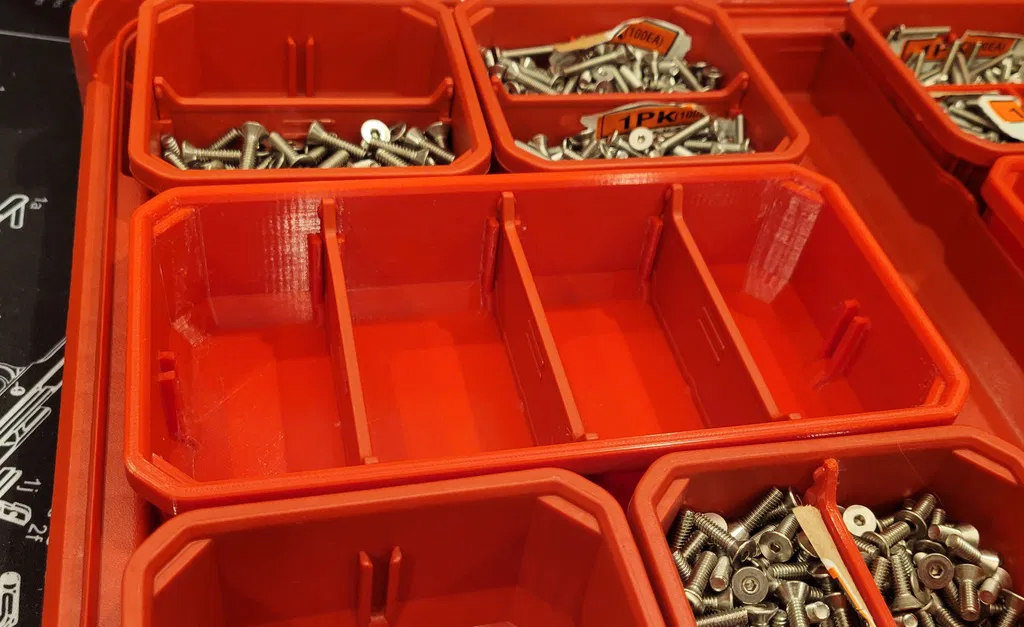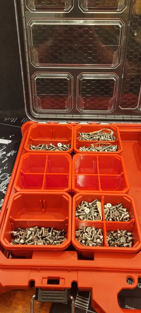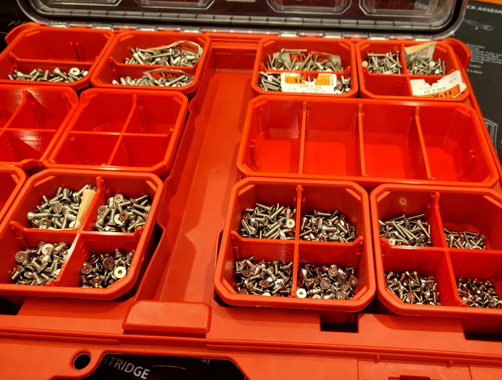 Mình mua cái Milwaukee Packout Low Profile Organizer, và thích gần như mọi thứ về nó — trừ cái khay chữ nhật. Việc nó bị chia sẵn thành ba phần làm mình khó chịu, và việc nó không thể chia theo trục dài cũng vậy, nên mình dựng model lại và làm bản copy. Mình muốn model của mình nhìn y như hàng zin, nên thay vì chỉ làm cái gì đó “xài được” nhưng nhìn lạc quẻ, mình cố làm sao cho nó hòa vào, nhìn như đồ gốc.