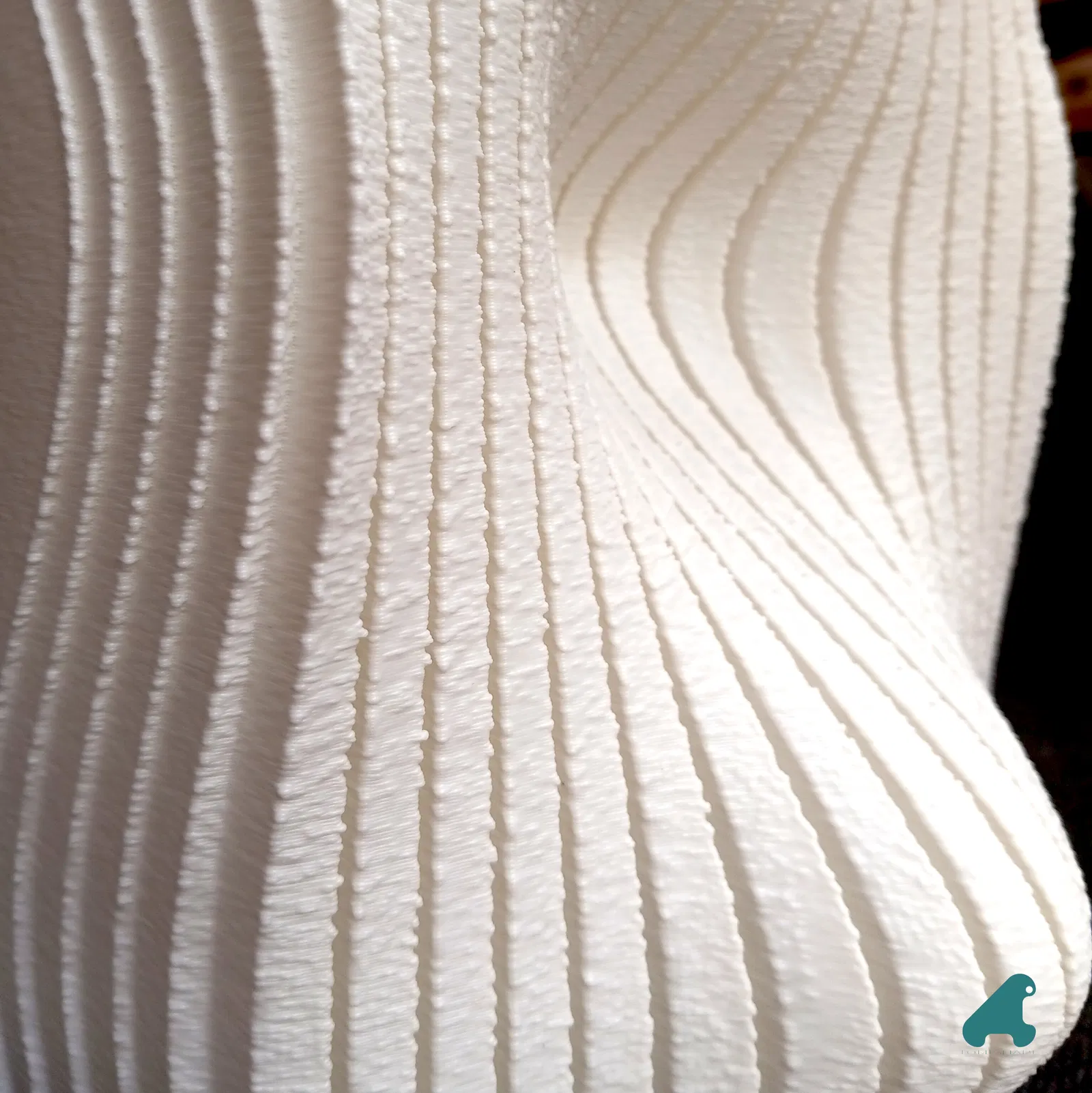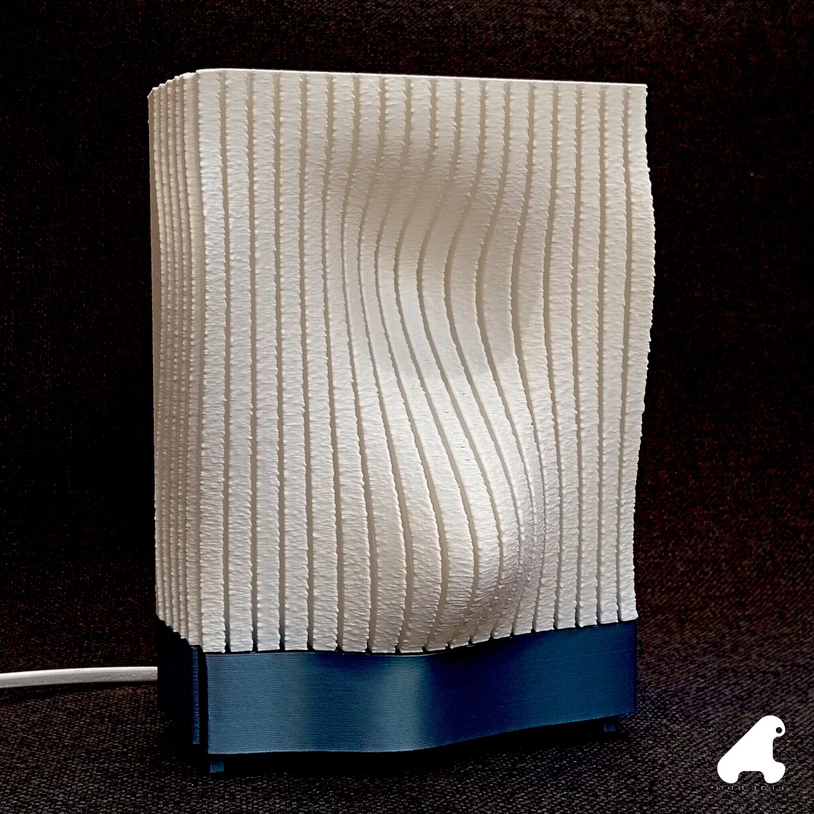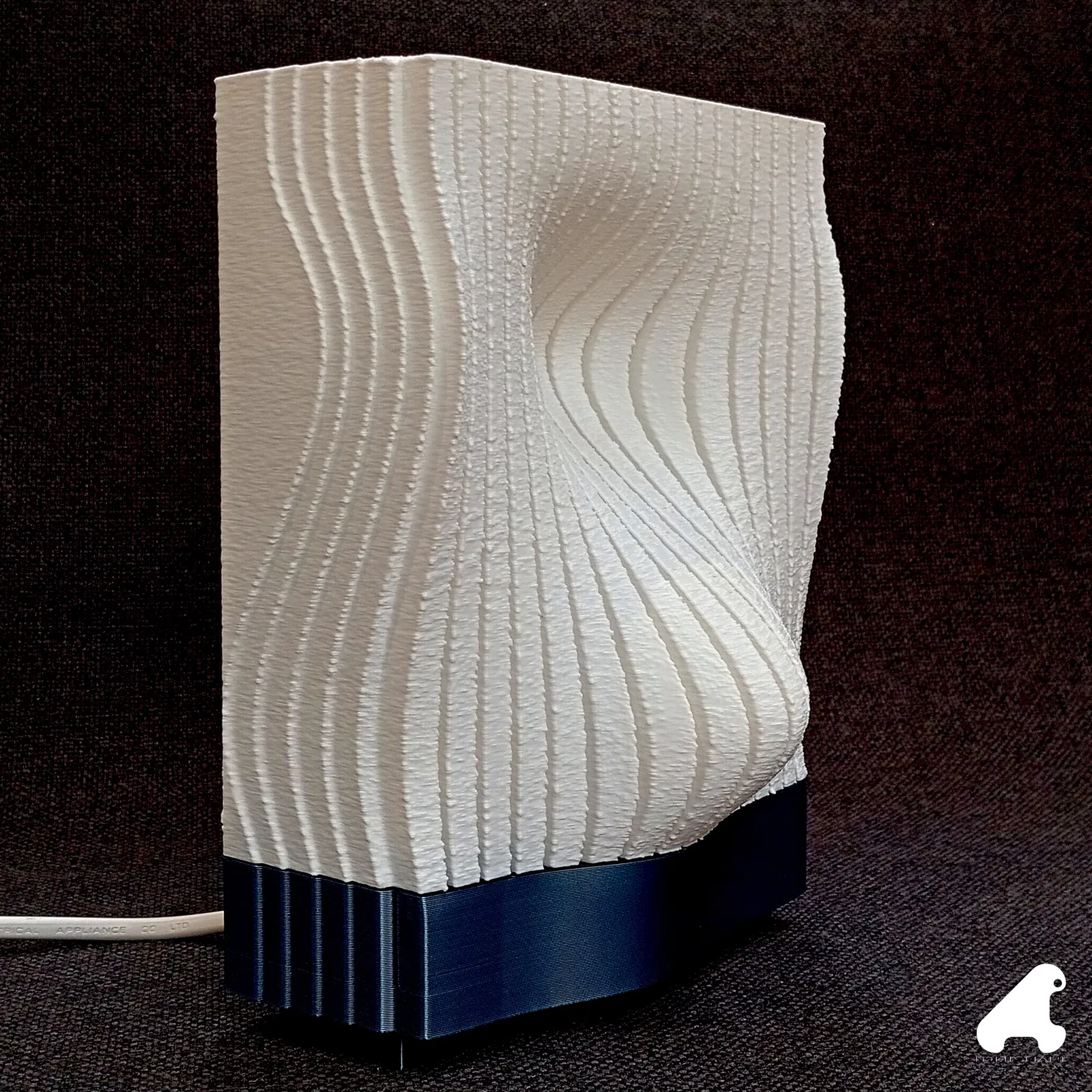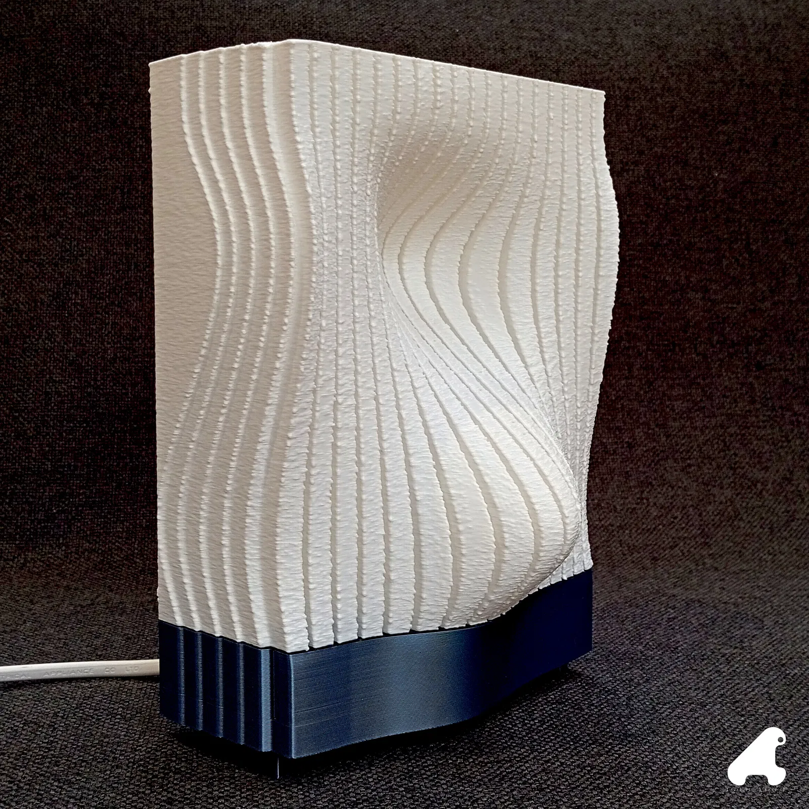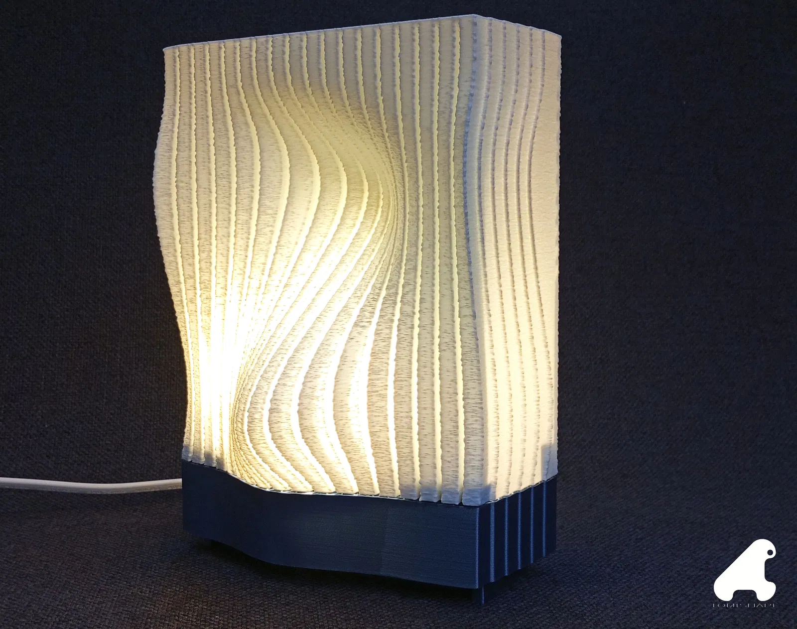 Mẫu đèn để bàn này là kết quả từ quá trình mình nghiên cứu các gợn sóng bề mặt. Mình có thêm các đường rãnh để làm nổi khối relief và in toàn bộ ở chế độ “fuzzy skin”, vì trước giờ mình chưa thử trên một chụp đèn trắng, và mình cũng nghĩ nó giúp tăng độ cứng cho các mẫu in ở “vase mode”.