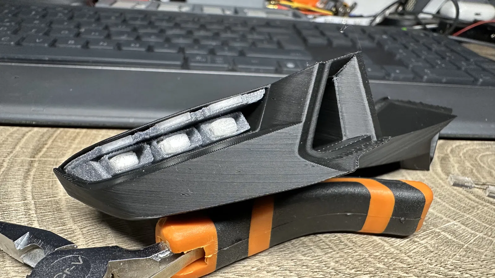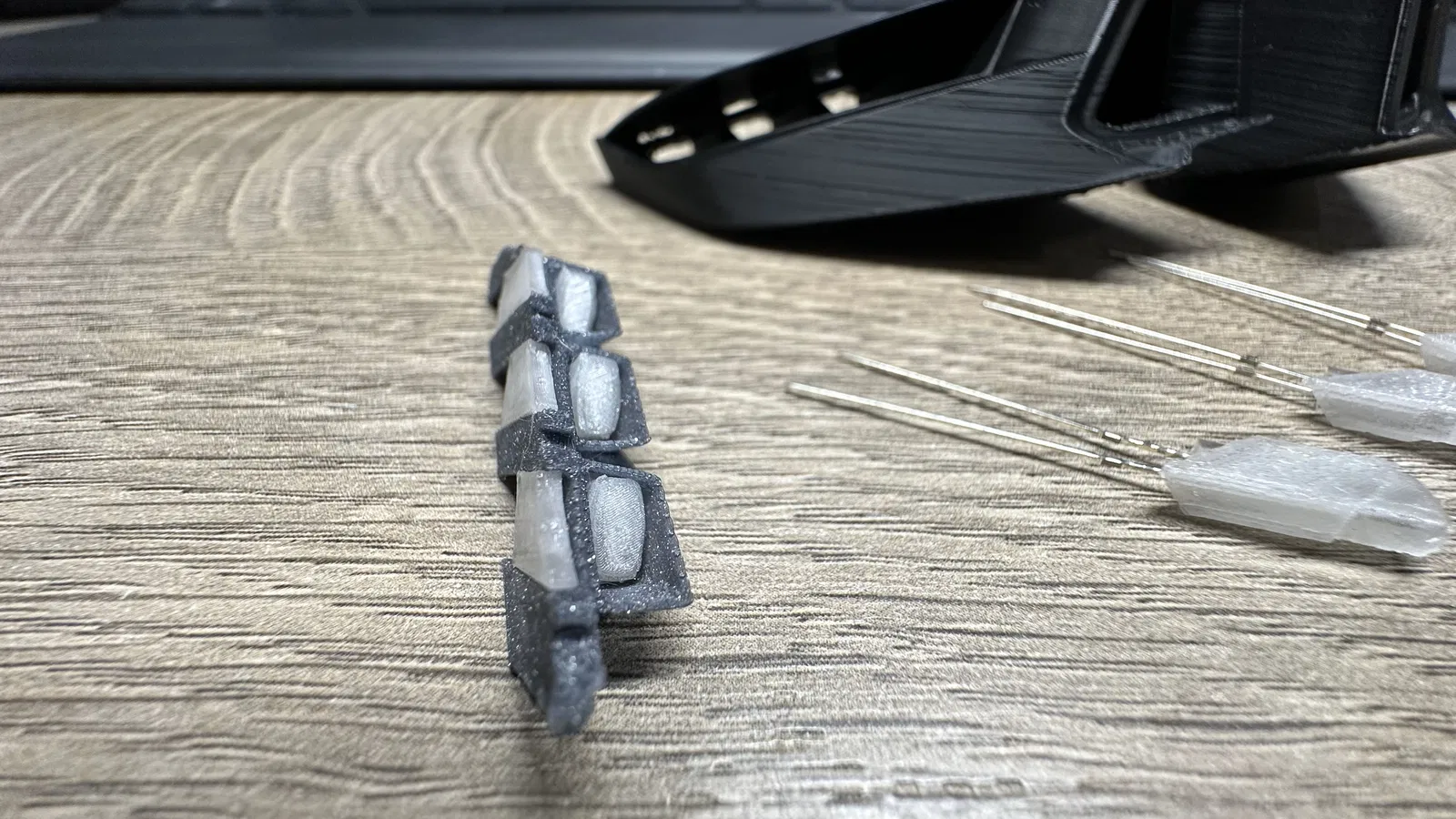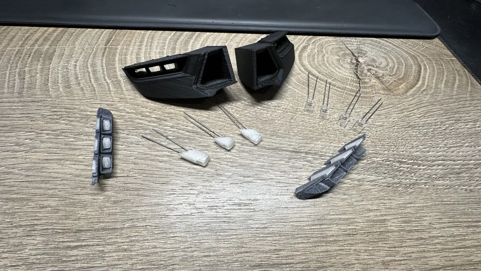 Các phần thân (lb.stl, rb.stl, rl.stl, ll.stl) in bằng màu bạn chọn; các phần còn lại dùng PETG, PLA, CPEHT trong suốt hoặc bán trong suốt, hoặc loại filament tương tự.