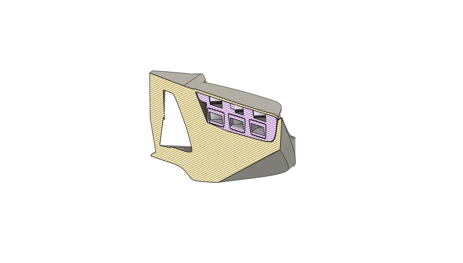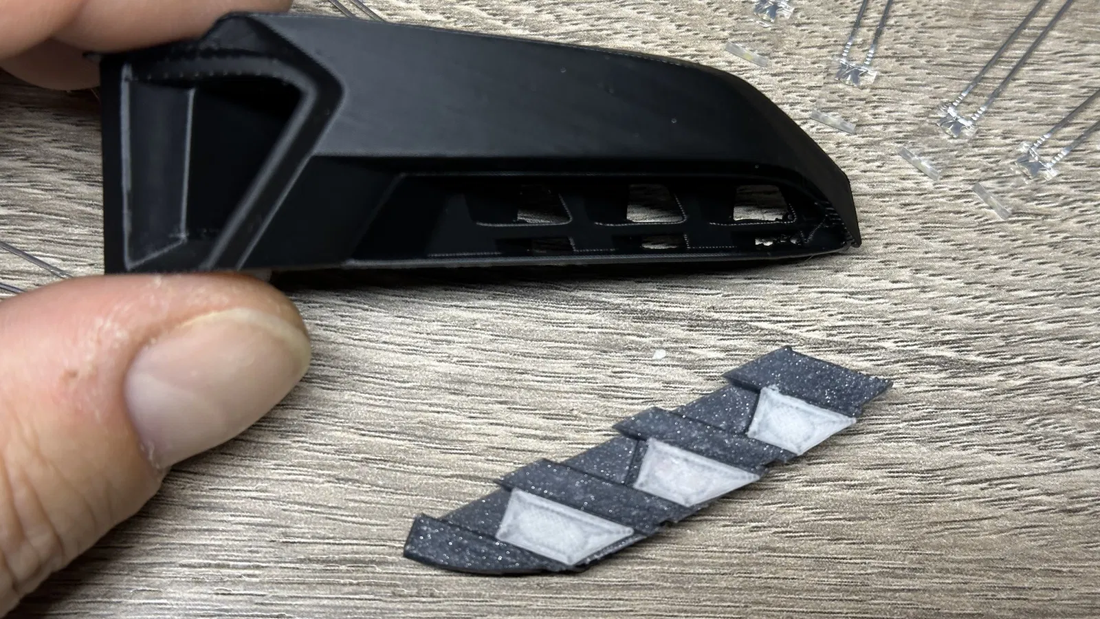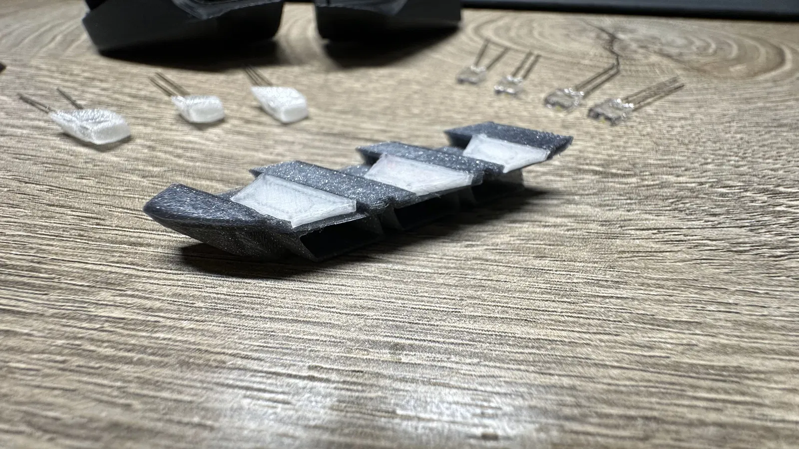 Bộ đèn LED trước cho xe RC 1/10 Mustang Dark Horse. Dùng LED chữ nhật 5x2mm, mỗi bên 6 LED. Các file thân (lb.stl, rb.stl, rl.stl, ll.stl) in theo màu tuỳ chọn; phần còn lại in vật liệu trong/bán trong.