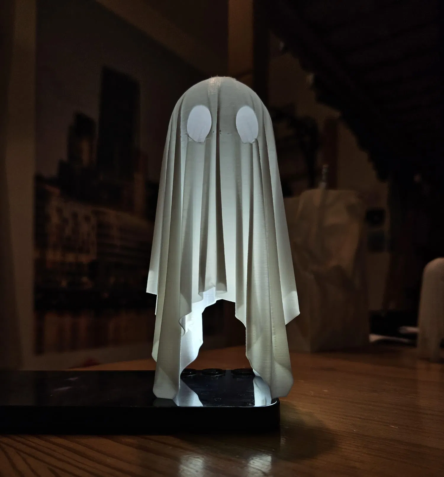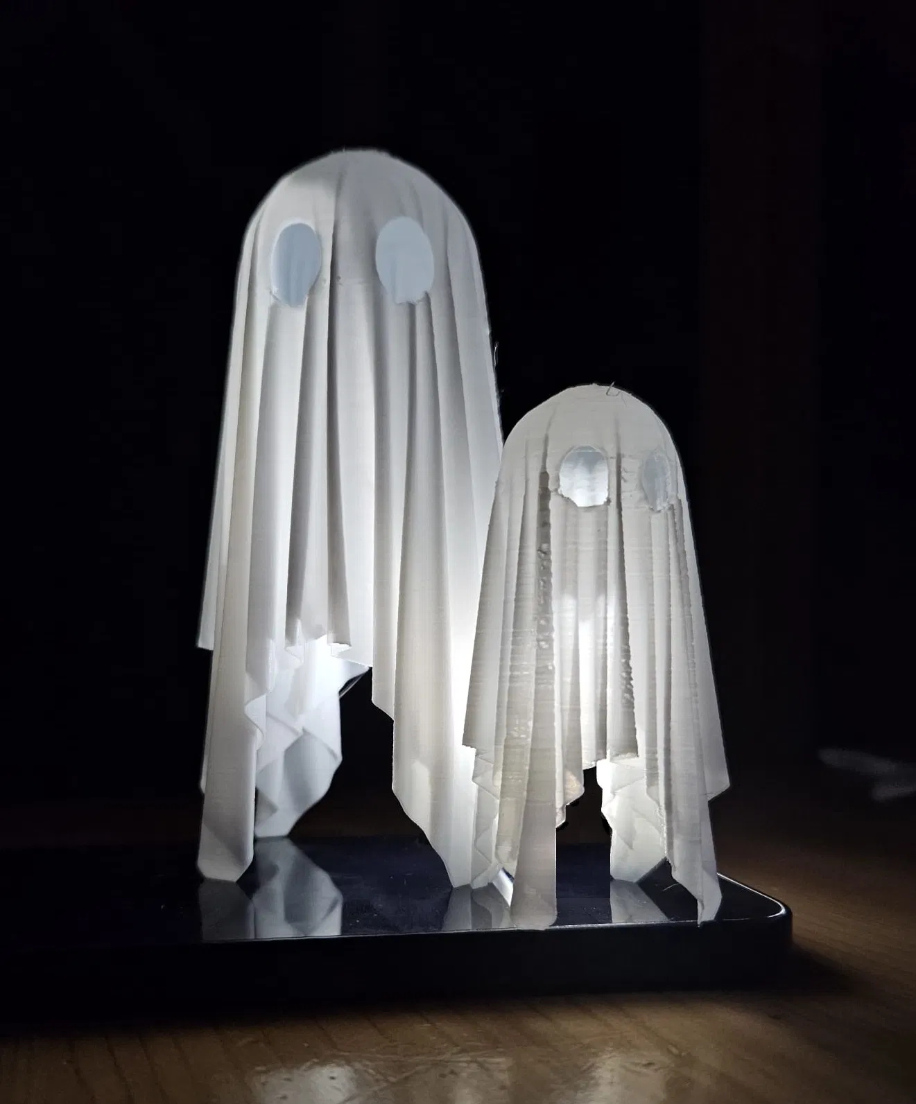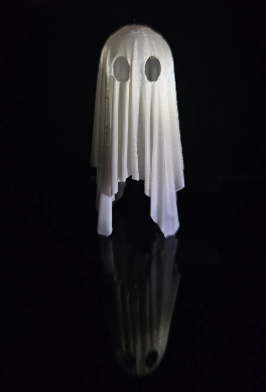 Mẫu “GHOST! ghost ghost ghost ghost” được tạo khi vọc Blender với cloth simulation: thả vải lên một quả cầu là ra con ma nhỏ xinh. In bằng PLA trắng thường, chỉ 1 perimeter mà vẫn đẹp và hơi trong.