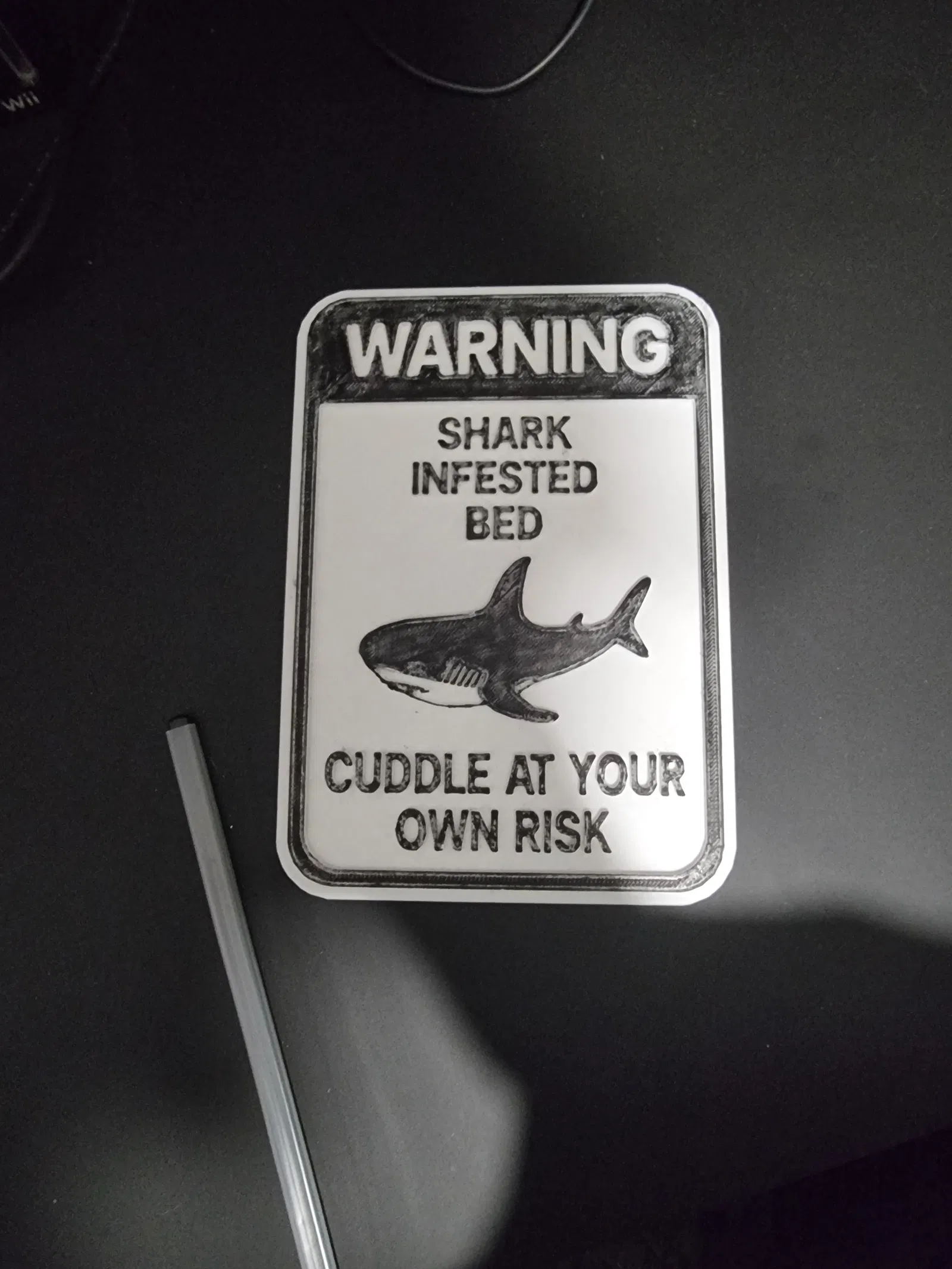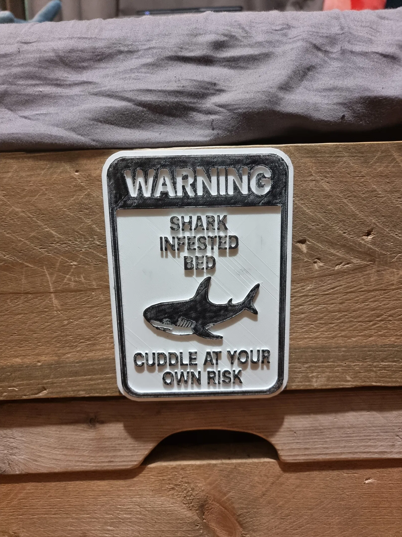 Bảng (sign) hài “cuddle at your own risk” lấy cảm hứng từ hình gốc trên r/BLAHAJ với cá mập IKEA Blåhaj. Dễ in 3D bằng PLA (ví dụ PLA trắng), có thể chà nhám và tô marker đen cho chữ rõ hơn.