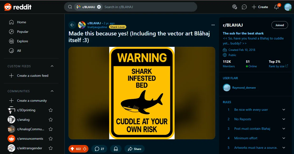 Thiết kế gốc được u/truelyaugustine đăng lên subreddit r/BLAHAJ, mình chỉ làm lại thành một cái bảng (sign) 3D printable dựa trên hình phẳng đó.