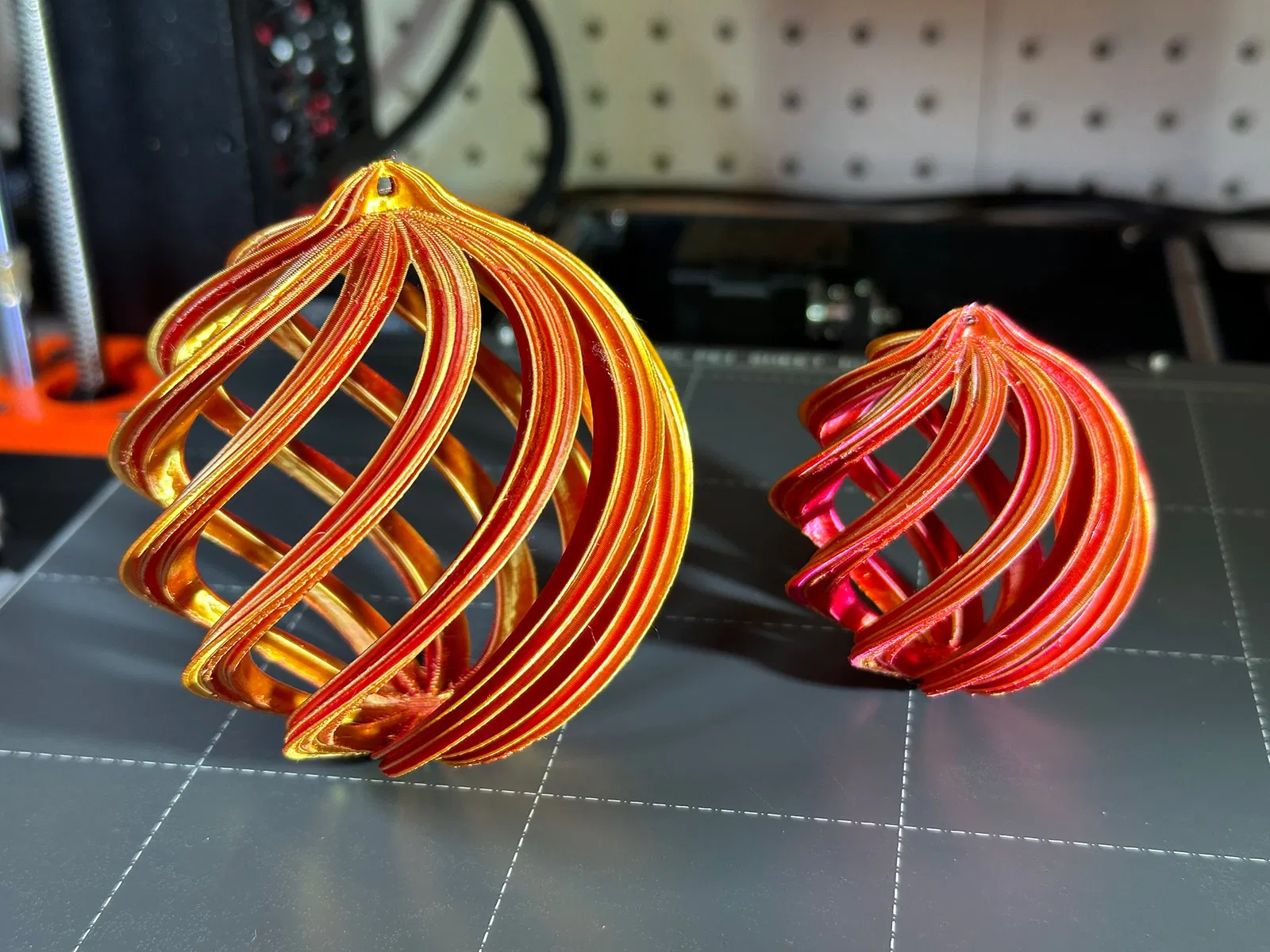Mẫu quả châu Noel xoắn ốc nhẹ, in nhanh và nhìn rất bắt mắt. Gồm 2 kích thước: 80mm (~14g, ~7 giờ) và 56mm (~8g, ~4.5 giờ). Có phiên bản supports tích hợp, kèm gợi ý slice cho PrusaSlicer/Cura.