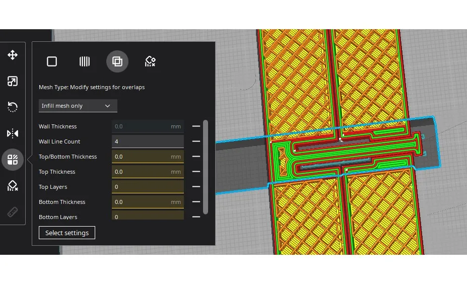 Khuyến nghị in 4 tường ngoài để có lấp đầy hoàn toàn ở chốt bản lề (ít nhất ở phần bản lề/cura "hỗ trợ chặn" và "sửa đổi cài đặt cho các chồng chéo").