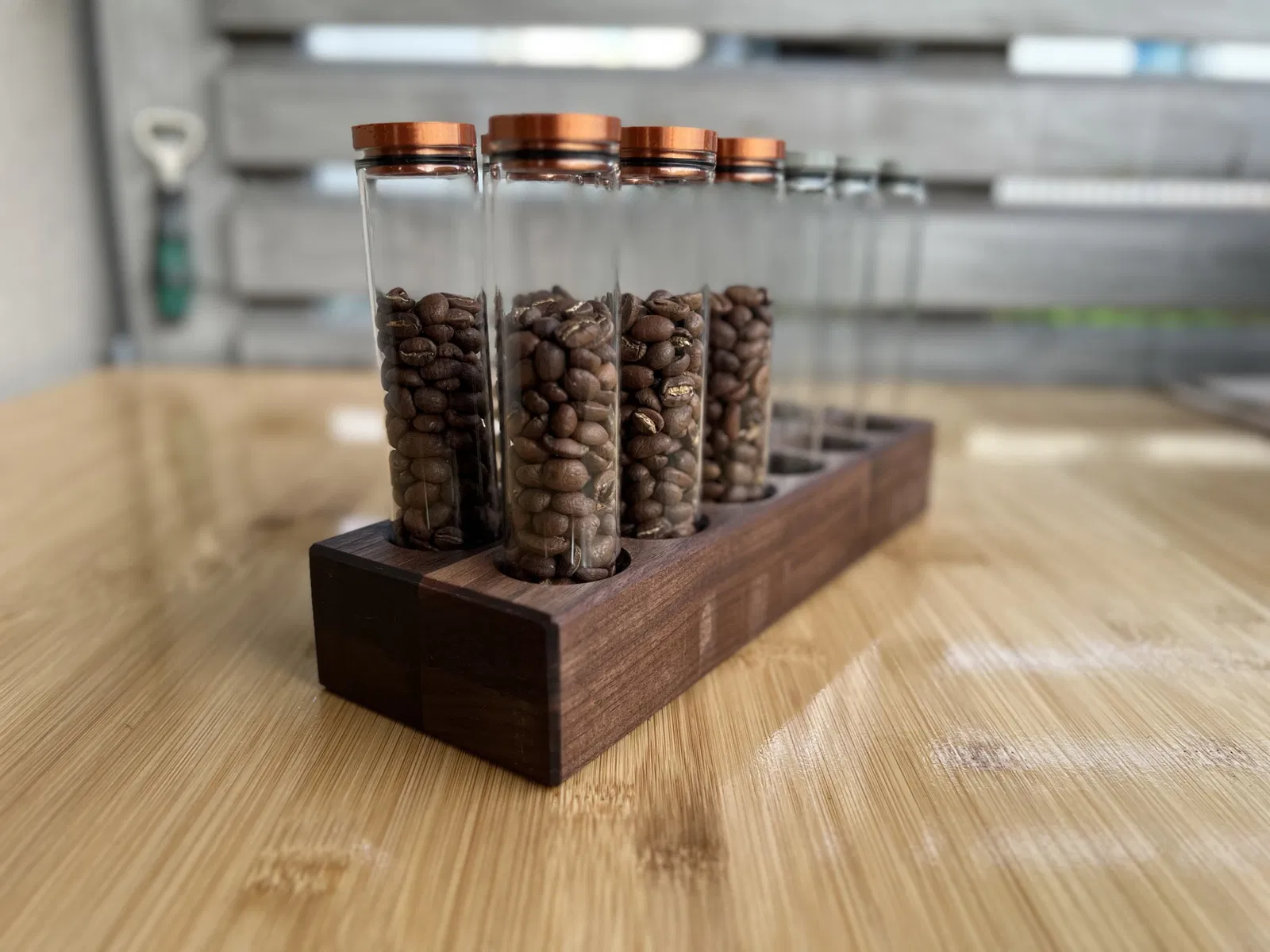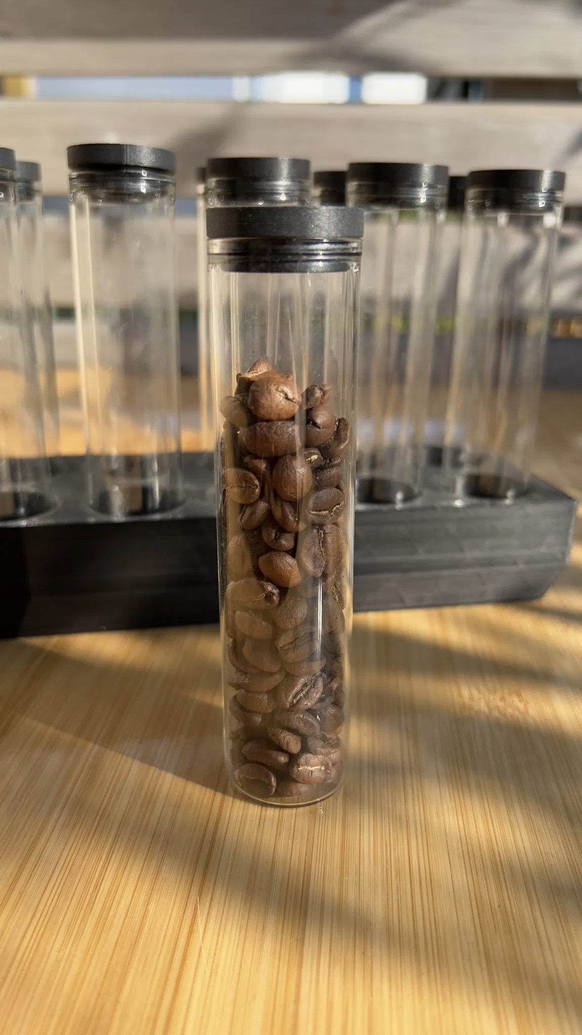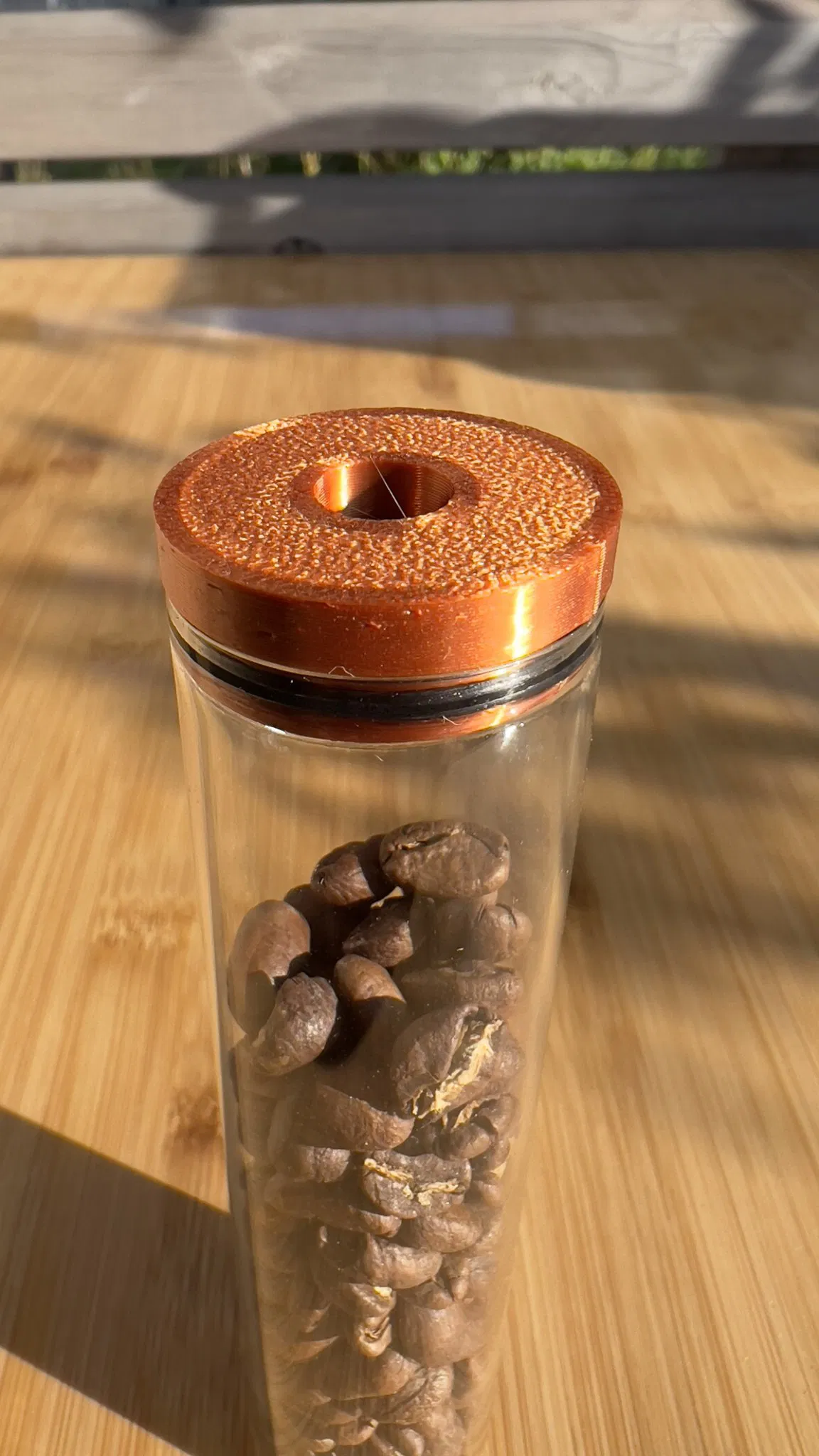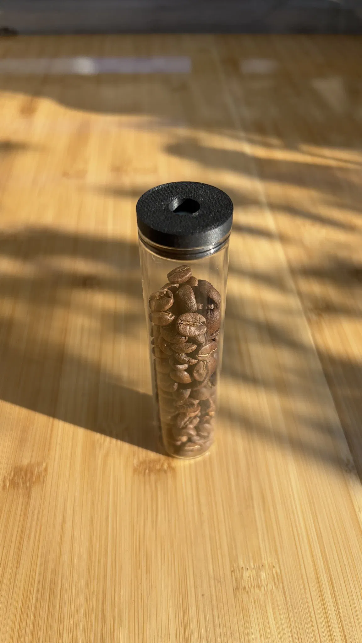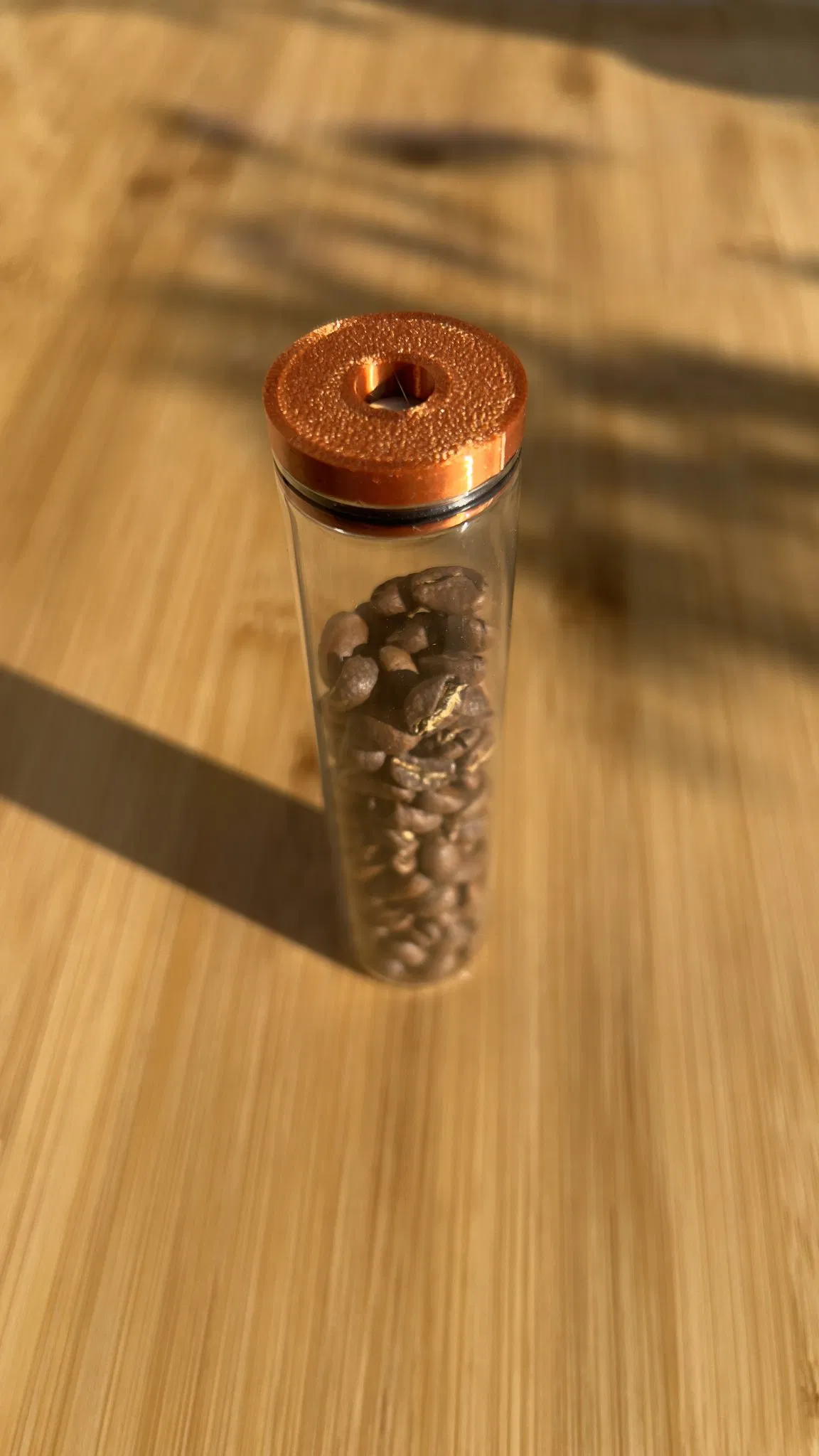 Lưu trữ cà phê của bạn đúng cách là điều quan trọng để giữ cho nó tươi lâu nhất có thể. Lưu trữ trong các ống nhỏ là xu hướng mới nhất. Bạn không cần phải đo lường hạt cà phê mỗi khi bạn muốn một tách cà phê, và chúng giữ được độ tươi lâu hơn vì bình chứa kín khí và không mở ra mỗi lần. Van một chiều cho phép khí thoát ra mà những hạt cà phê mới rang phát ra. Nắp này phù hợp với ống thủy tinh có đường kính ngoài 30 mm, đường kính trong 26 mm (tôi sử dụng chiều dài 120 mm, 60 ml, lý tưởng cho 18-20g cà phê). Cần có một vòng cao su o-ring 20x2 mm và một van silicon một chiều 13 mm. Vì cổ ống thủy tinh có đường kính khác nhau, nắp có ba kích thước khác nhau (24, 24. 5 và 25 mm). Việc điều chỉnh chúng cho bất kỳ đường kính nào khác có thể gây ra vấn đề với van và vòng o-ring. - Ống thủy tinh 30 mm, OD 26 mm ID, chiều dài 120 mm: