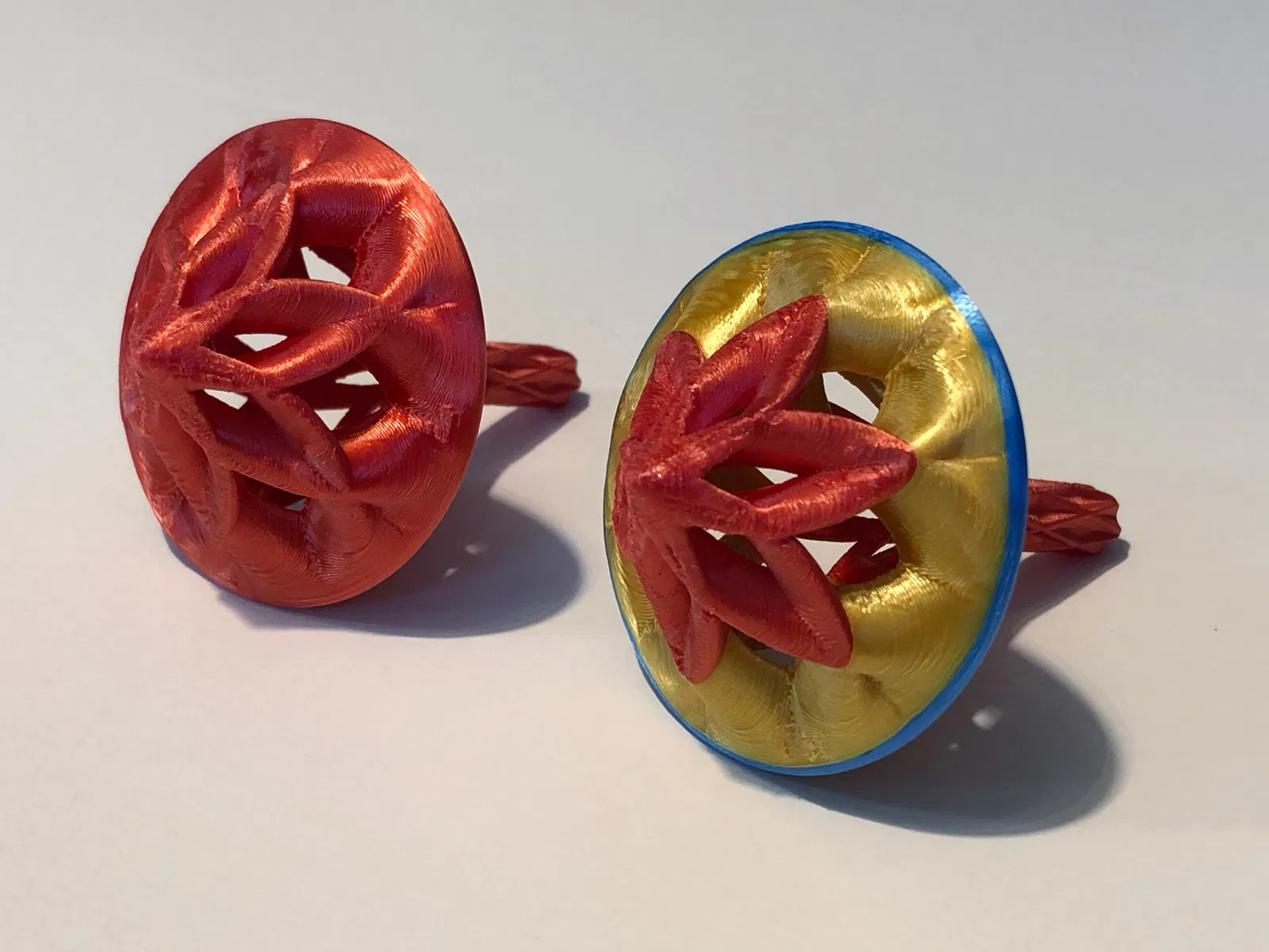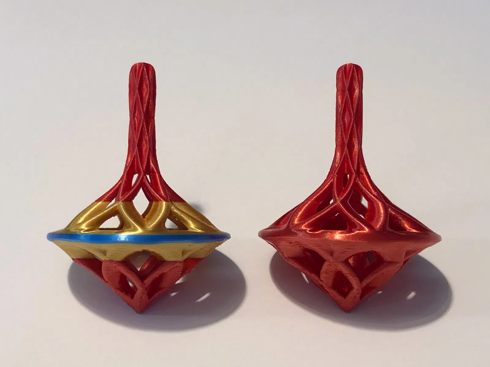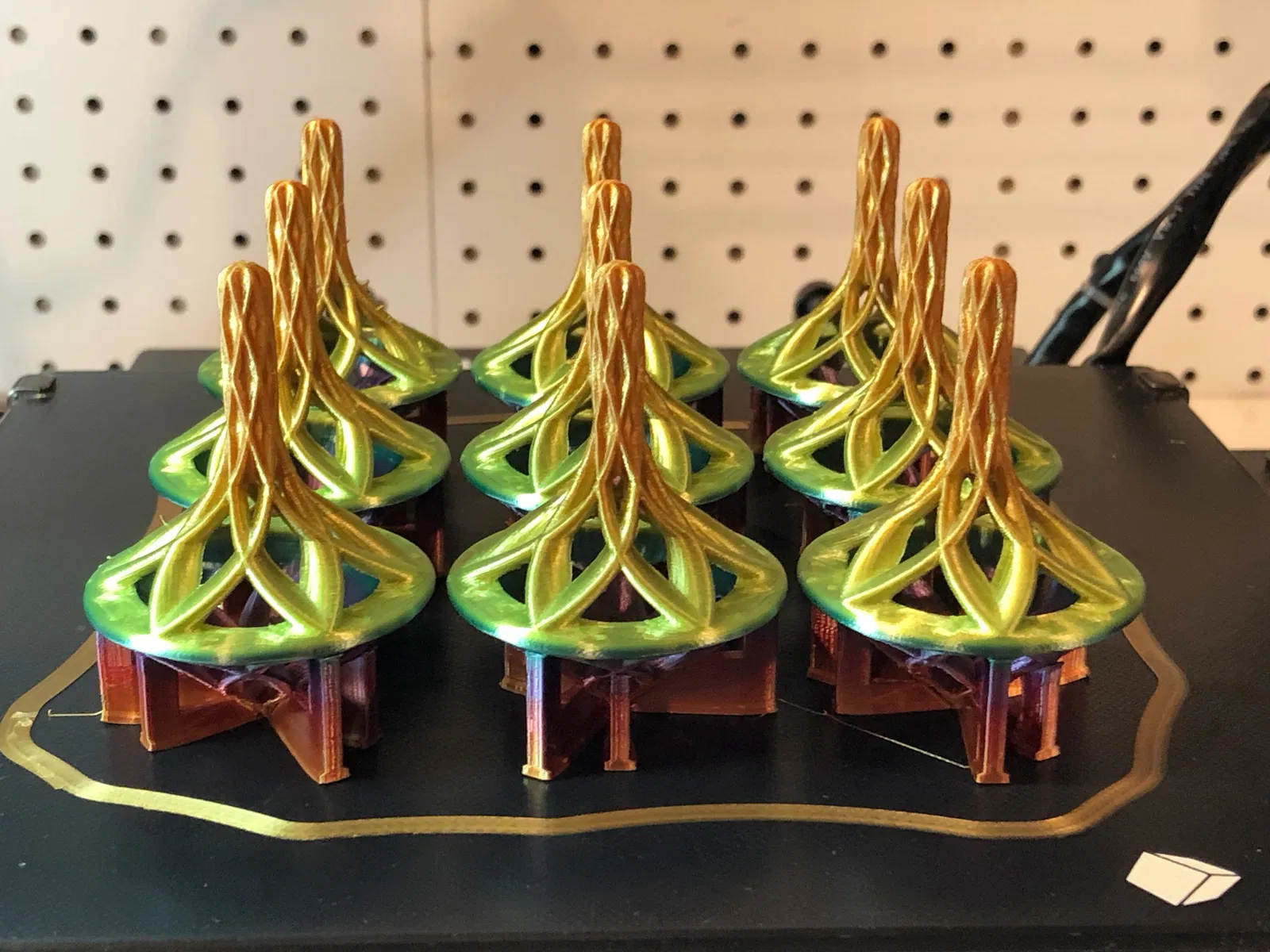 Nếu ai tò mò: mình dùng MatterHackers Quantum Raspberry Gold PLA cho top trong ảnh bìa, TTYT3D Silk Shiny Fast Color Gradient PLA cho mấy cái top cầu vồng, và nhiều màu TTYT3D solid silky PLA khác cho các mẫu còn lại.