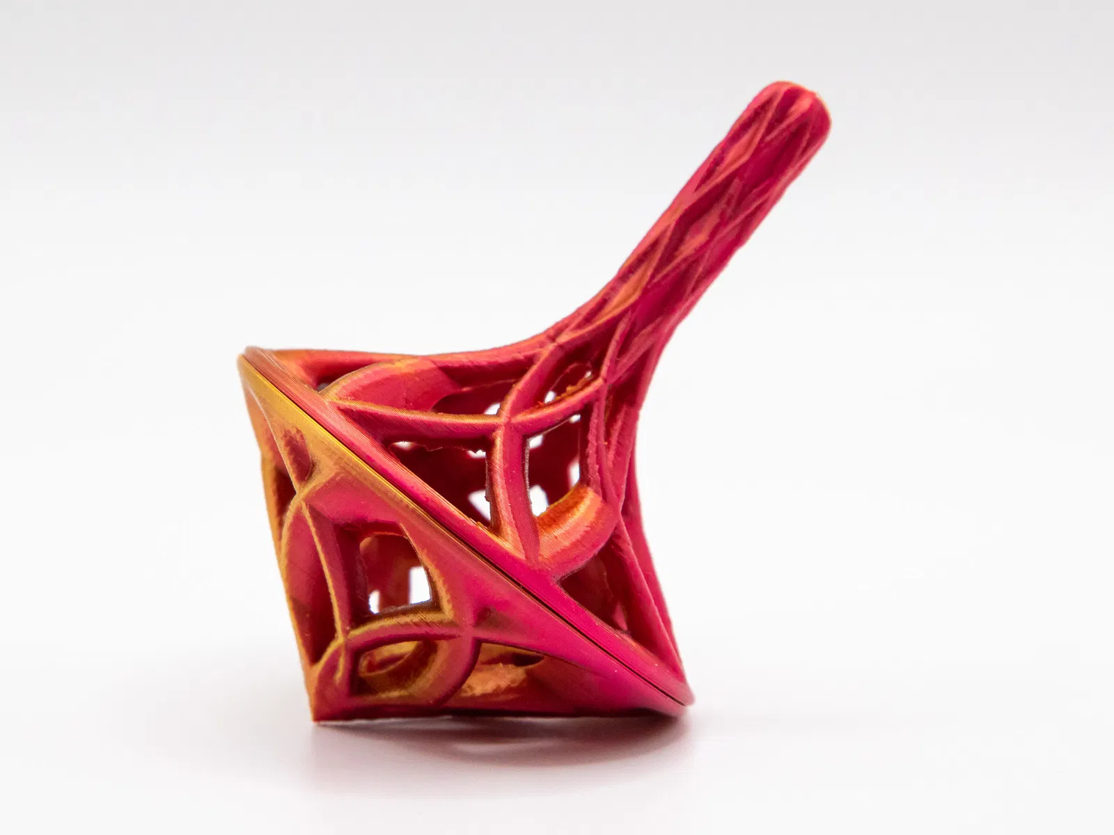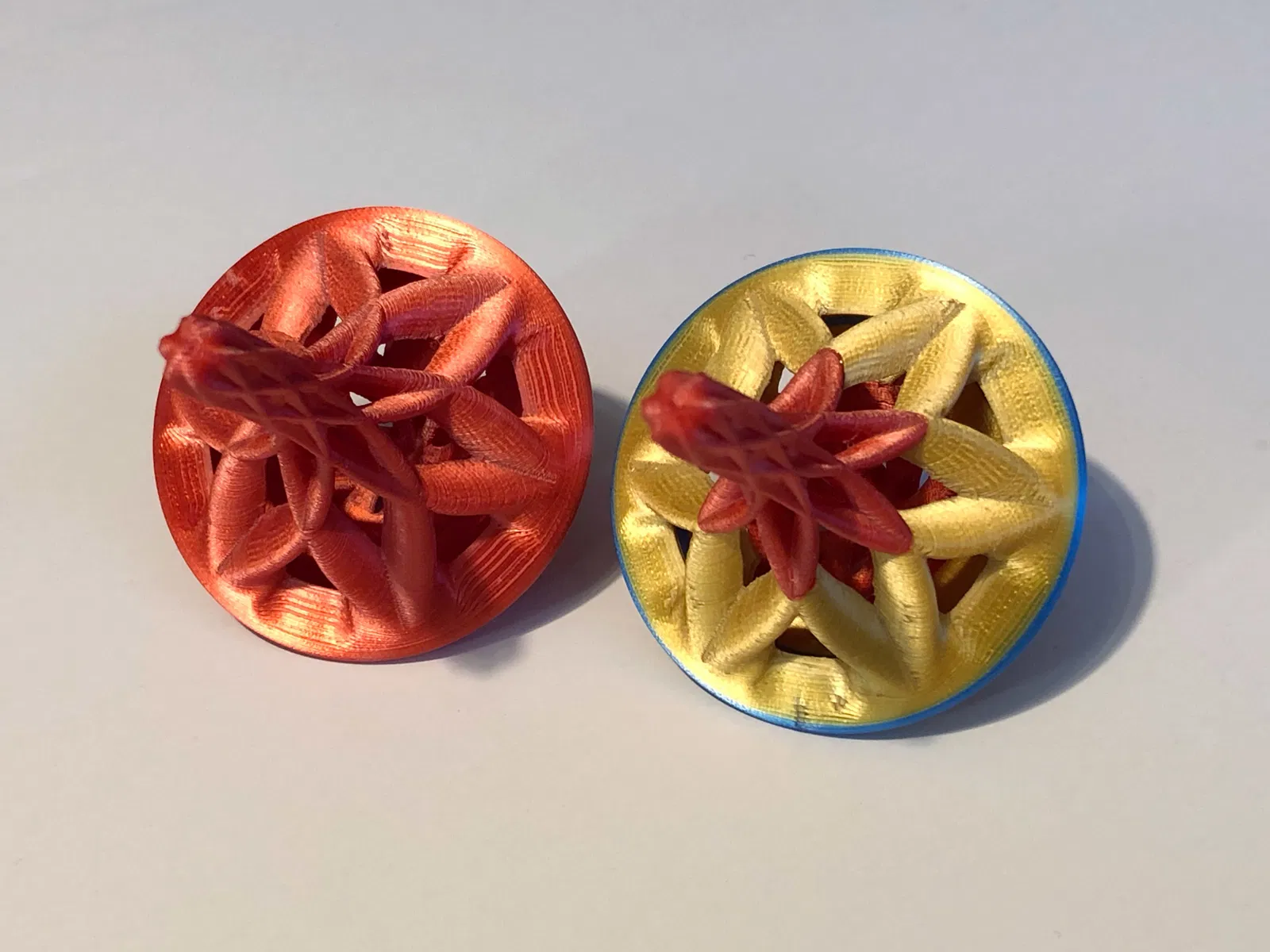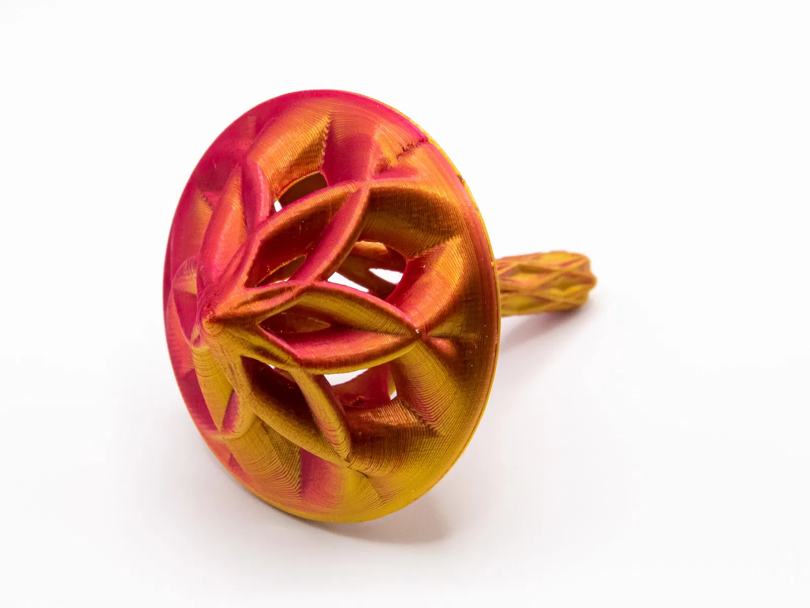 Nếu ai tò mò: mình dùng MatterHackers Quantum Raspberry Gold PLA cho top trong ảnh bìa, TTYT3D Silk Shiny Fast Color Gradient PLA cho mấy cái top cầu vồng, và nhiều màu TTYT3D solid silky PLA khác cho các mẫu còn lại.